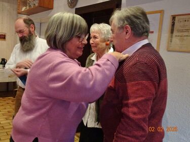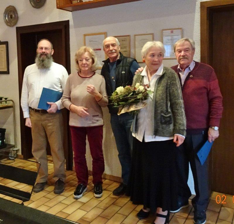Dann nahm unser 2. Vorstand die Ehrungen langverdienter Mitglieder vor. Für fünfzehnjähriges Singen wurden Heidelore und Klaus Eichsteller mit der silbernen Ehrennadel und Urkunden ausgezeichnet. Wilfried Jung, der nicht leider anwesend war, bekommt beides nachgereicht. Für 30jährige Mitgliedschaft im Verein wurden Angelika und Enzo Piotrowski mit der goldenen Ehrennadel und Urkunden ausgezeichnet, Edgar Krumholz wird auch beides nachgereicht.
