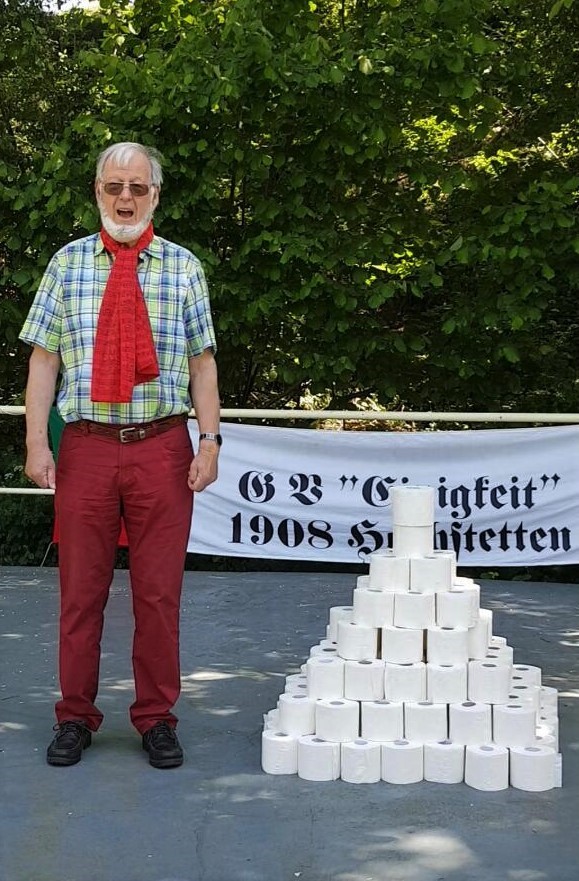 Unser 2. Vorsitzender Henry hatte angefragt und einige Sänger(innen) kamen für diese Aktion vor Ort. Die Zeit war kurz, aber die Gaudi überwog und es konnte ein Video gedreht werden. Henry sprach die Begrüßungsworte und erklärte das Ganze und dann kam unser Mann für die Kunst und das technische Know-how, Klaus Eichsteller, zum Zug. Mit Zeilen aus seinem tollen Gedicht gings dann zur Sache:
