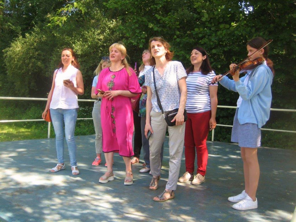 Auch sonntags herrschte schon früh rege Geschäftigkeit, Pavillons, Sonnenschirme, Tische und Bänke wurden aufgestellt und zahlreiche Kuchenspenden gingen ein – vielen Dank an die fleißigen Bäckerinnen und Sponsoren. Im Innenraum wurde auch alles schön dekoriert und die Kuchentheke vorbereitet und bestückt. Wir waren schon etwas aufgeregt, wie wird das Fest angenommen und wie klappt die Verständigung mit den eingeladenen Ukrainern. Christa Jung-Wittiger hatte ein Treffen mit Ukrainerinnen und ihren Kindern organisiert, um ihnen einen schönen Nachmittag zu bieten. Neuland für uns, aber es war ein absolut positives Erlebnis und die ukrainischen Frauen bedankten sich bei uns auf der Bühne und sangen einige Lieder für uns. Viel Seele war da zu hören und zu spüren und auch ergreifend das großartige Geigenspiel der jungen Marie. Ein Talent, das unbedingt gefördert werden muss! Hatte sie just an diesem Tag Geburtstag und bekam von unserer Jola ein Geburtstagspräsent überreicht, danke, Jola und danke Christa für das Sponsoring für die Kinder. Den Ukrainerinnen ganz herzlichen Dank unsererseits für diese wunderbare Einlage, wir würden uns über weitere Begegnungen freuen.