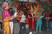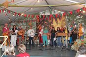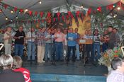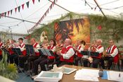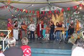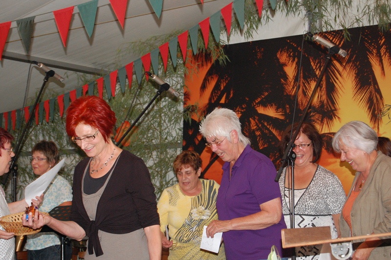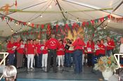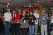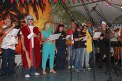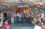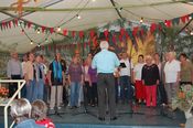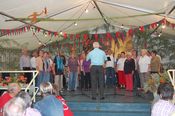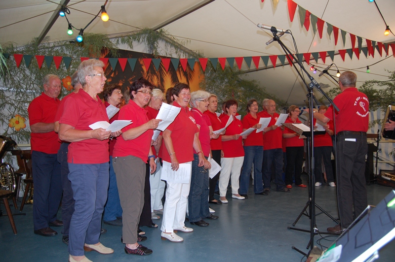 Der gemischte Chor des Turnvereins, der Männertreff der evangelischen Kirchengemeinde, die Damengymnastikgruppe des FVH, die Trimm-Dich Abteilung des FVH und die fantastisch kostümierten Prismaten sorgten für einen sehr unterhaltsamen und gelungenen Bunten Abend. Das Publikum spendete reichlich Applaus, forderte viele Zugaben und machte gut gelaunt mit. Als traditionellen Abschluss unseres Festes spielte der Fanfarenzug das Badnerlied, die Festbesucher sangen im Stehen mit.