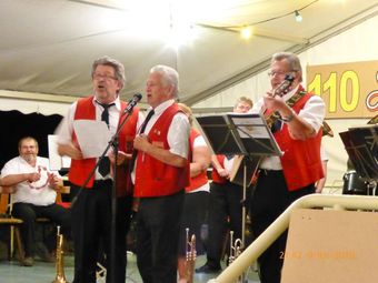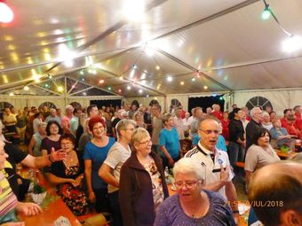 Rainer Ritz moderierte mit gewohntem Humor diesen Abend und hatte mit seinen Kommentaren die Lacher auf seiner Seite. So kündigte er die Prismaten an, die uns wieder mit Liedern zum Mitsingen begeisterten und uns schon lange die Treue halten. Anschließend spielte erneut die FFW auf, denn das obligatorische Badnerlied wurde schon sehnsüchtig erwartet. Rainer Ritz rief unseren Bürgermeister Michael Möslang auf die Bühne, der sich Altbürgermeister Waldemar Schütz dazu holte, um das Lied anzustimmen. Rainer und Klaus Reinhardt verstärkten das Duo und das ganze Zelt schmetterte mit und das Badenfähnchen wurde eifrig geschwenkt. Ein weiterer Höhepunkt folgte noch: Harry Zwecker von der FFW hatte extra für uns ein Lied von den Festen im Erlich gedichtet – super gemacht, danke, und der Refrain lautete:...und nägscht Johr um die gleiche Zeit komma alle widda her. Das erhoffen und wünschen wir uns!