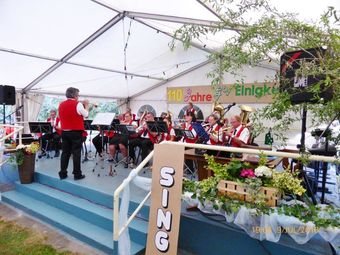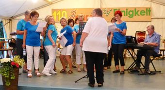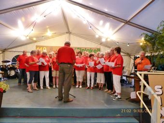 Vor dem Bunten Abend füllte sich bald das Zelt, hatten wir doch Glück mit diesem Traumwetter, keine Hitze und schnakenfrei!! Gespannt warteten alle auf die Eröffnung des Abends durch den Musikzug der FFW Linkenheim-Hochstetten. Diese begann auch wieder mit schmissigen Stücken und brachte die Besucher in Stimmung. Nach der Begrüßung durch den 1. Vorsitzenden Klaus Reinhardt, konnten die Ortsvereine das Programm gestalten, was ihnen auch immer wieder vortrefflich gelingt. Die erste Gruppe war der Männertreff EKG Hochstetten, die unter anderem mit einem Baden-Württemberg-Lied überraschte. Hatten sie doch auch ein Badenfähnchen über dem Seiteneingang platziert, das hier ohne Fahnenstreit über den Abend wehen durfte. Als nächstes brachte der FVH/Trimm Dich schöne Lieder zu Gehör, da würden wir gerne einige Sänger abwerben – vielleicht klappt´s.