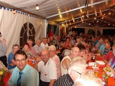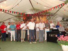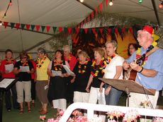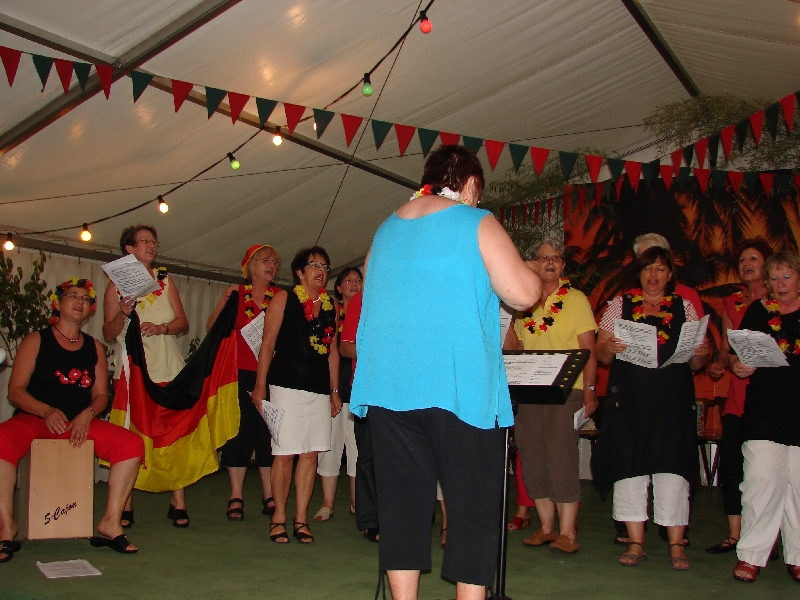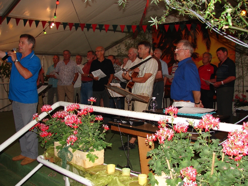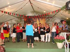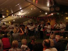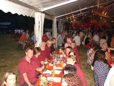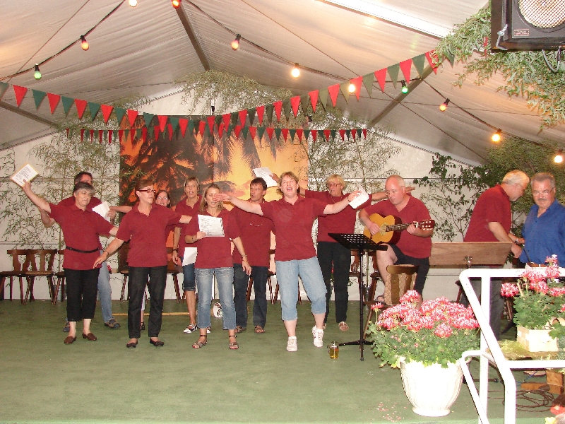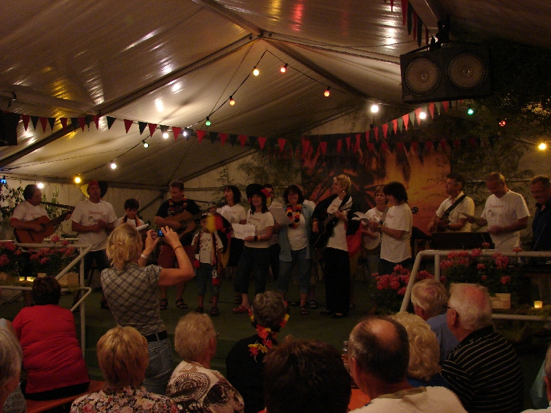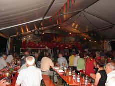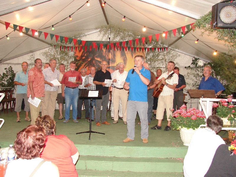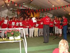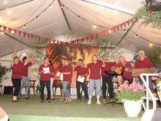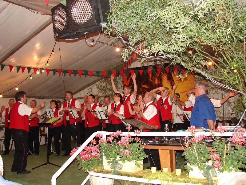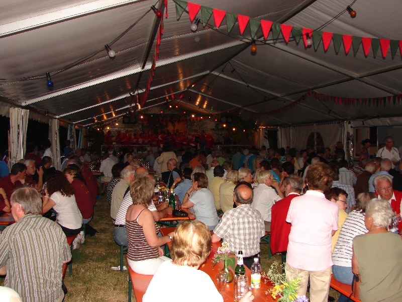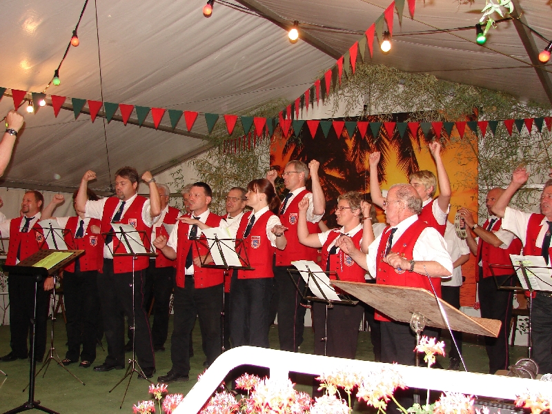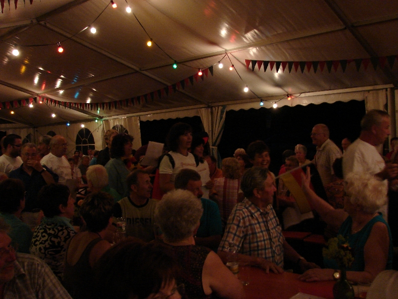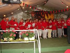 Am Montagabend kamen viele Ortsvereine zum traditionellen heiteren Sängerwettstreit zusammen. Der Fanfarenzug der Freiwilligen Feuerwehr eröffnete mit feuriger Blasmusik das Programm, das Zelt war voll besetzt. Der gemischte Chor präsentierte sich gerne einem so zahlreichen Publikum und sang zwei südamerikanische Weisen, mit einem Trinklied wurde der Bogen zum heiteren Wettstreit der Vereine und Gruppen geschlagen. Moderator Rainer Ritz war wieder in seinem Element mit Schlagfertigkeit und Humor. Die Reihenfolge der Auftritte der sieben angemeldeten Gruppen legte er "unter notarieller Aufsicht" durch eine Ziehung fest.