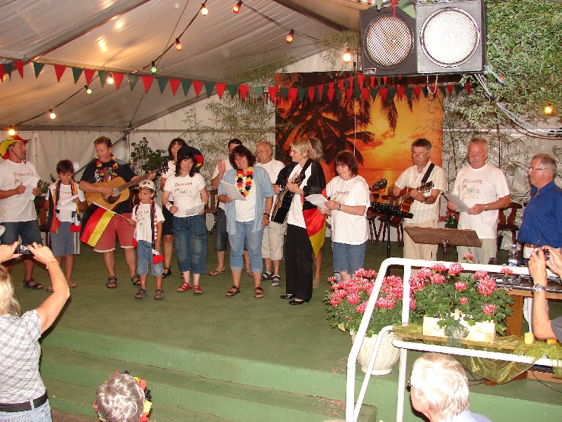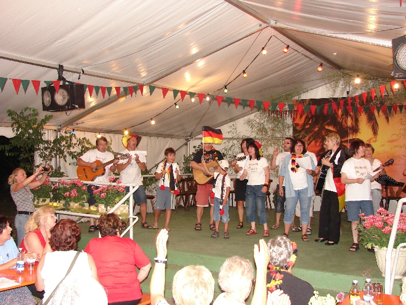 Die Damen-Gymnastikgruppe des FVH mit ihrem bewährten musikalischen Begleiter Eberhard Halter an der Gitarre brachte Stimmung mit einem bekannten Schlager und dem Fußball Fansong „Gimme hope Joachim“. Brigitte Lang dirigierte mit Schwung, Ursula Halter trommelte dazu.