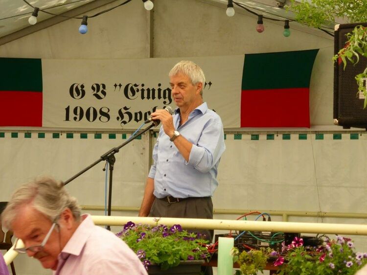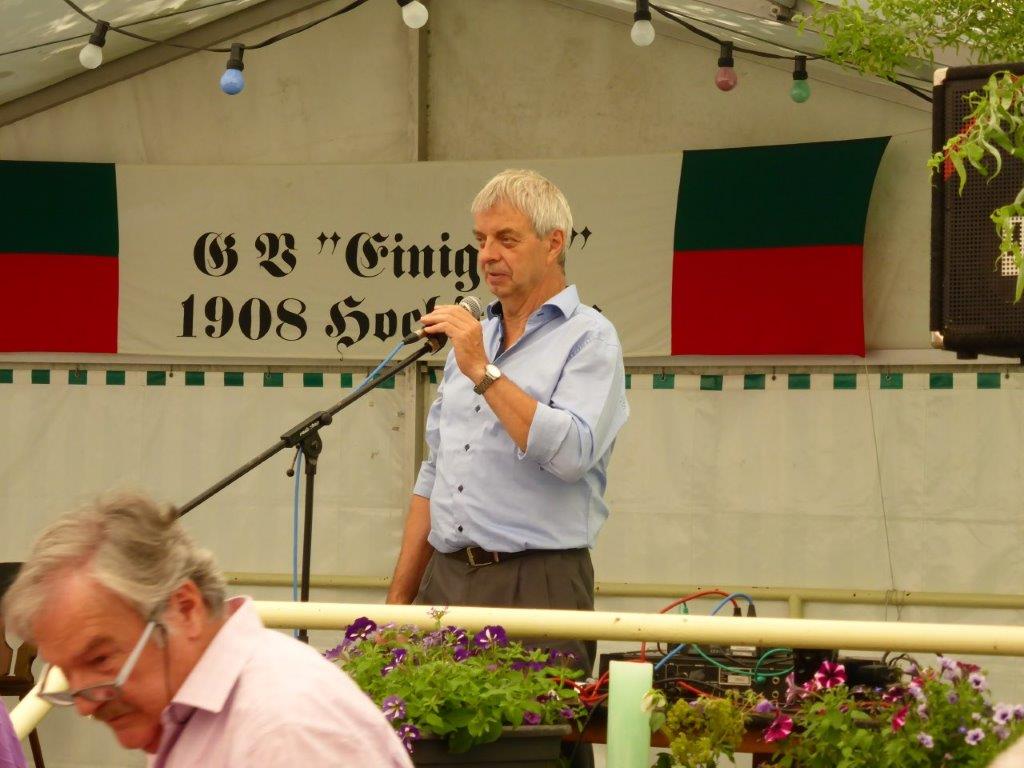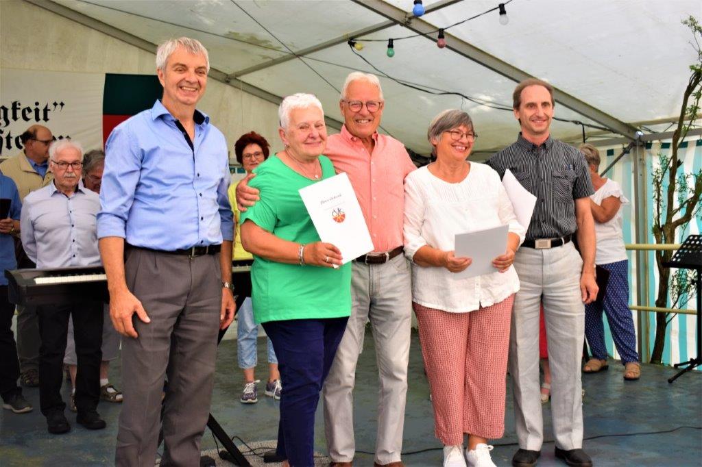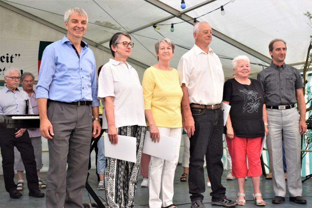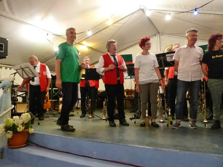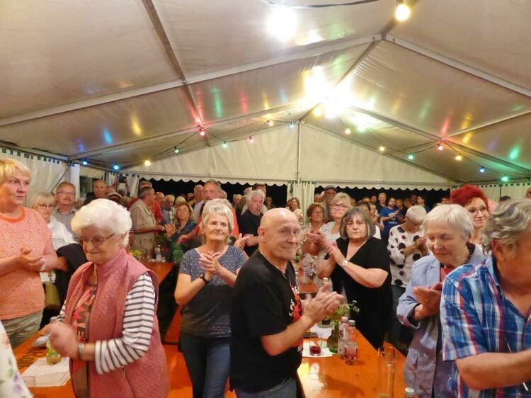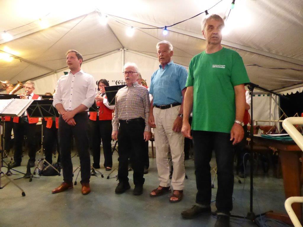 Die Gymnastikdamen des FVH folgten und entführten nach Paris, begleitet auf dem Akkordeon von Monsieur Eichsteller und seine Mme. Heidi motivierte: entré, entré, Mesdames, Monsieurs. Das gefiel dem Publikum, ebenso der Song „Heißer Sand“, den wir diesen Sommer auch am Bali spüren können. Brigitte Lang hatte die Mädels beim Dirigieren souverän im Griff. Die nächste Gruppe, die Prismaten, ließen´s krachen mit ihren Liedern und das Publikum sang begeistert mit, fühlte diese Lebensfreude, die da herüberkam, einfach toll, super, dass ihr da wart. Die Herren der TrimmDich-Gruppe des FVH musste sich auch nicht verstecken, mit Wolfgang König auf der Gitarre begleitet, kamen die Lieder gut an, vor allem konnte man einige Sangestalente heraushören. Wir wären mächtig stolz, wenn da der eine oder andere auch mal freitags zum Singen in den Erlich kommen würde!! Die Sangesgruppe der FFW überzeugte mit dem Erlich-Lied und ihren anderen Liedern natürlich die Besucher und hatten mit instrumentaler Begleitung und der sonoren Stimme von Roger Seitz viele Höhepunkte zu bieten. Alle aufgetretenen Gruppen waren super, so konnte unser Vorstand nur erste Plätze vergeben, ein Danke euch allen. Dazwischen fungierte unser Sänger Rainer als Moderator, gekonnt wie immer und mit nicht ganz jugendfreien Witzchen versehen, gab er seine Kommentare zu den aufgetretenen Gruppen. Diese bekamen symbolisch eine Flasche Sekt überreicht und unser Rainer verabschiedete sich nun nach 25 Jahren als Moderator vom Publikum, was stehende Ovationen und bewegende Momente auslöste, ist er doch unser Original und vom Erlich nicht wegzudenken. Auch unser Bürgermeister Michael Möslang und unser Ehrenbürger und Altbürgermeister Waldemar Schütz zollten Rainer Anerkennung für sein Engagement, das so schnell niemand ersetzen kann – Spitze Rainer, bravo! Die Herren hatten bereits Stellung auf der Bühne bezogen zu unserem obligatorischen Festabschluss, dem Badnerlied mit dem Musikzug der FFW. Das Publikum erhob sich und stimmte in die Strophen ein – welch eine Atmosphäre und eine Stimmung. Zuvor hatte Herr Möslang noch angekündigt, nächstes Jahr einen Rathaus-Chor für das Fest stellen zu wollen, eine schöne Idee, aber es fehlt unbedingt an Nachwuchs für unseren GV und so ein Fest zu stemmen, ist nicht einfach. Deshalb noch einmal ein Appell an alle, die hier so schön mitgesungen und mitgemacht haben: Freitags 19.30 Uhr ist unsere Singstunde, einfach mal reinschnuppern, Gefallen finden und am liebsten bleiben, dann hat unser Vereinsleben Bestand und wir würden uns riesig freuen. Hier auch noch einmal ein riesiges Dankeschön an all unsere Helfer über die Festtage – IHR wart großartig!!