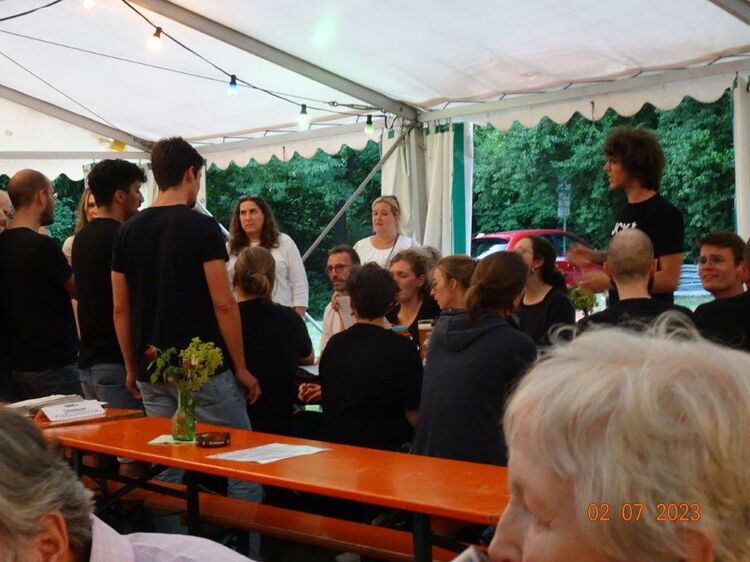Unsere Gäste machten gerne von unserem vielfältigen deftigen Speisenangebot Gebrauch und auch die Kuchentheke wurde gerne anvisiert, weiß man, dass selbige immer sehr lecker bestückt ist. So stand bald der Abend der „Modernen – oder Jungen Chöre“ an, wie unsere taffe Moderatorin Biggi Brüstle dies definierte, passend in jedem Falle. Wir eröffneten das Programm mit vier Liedern, wobei unsere Sängerin Kristin dabei mit ihrem Solo bei Gabriella das Publikum total begeisterte, super Kristin. Es folgten die Chöre „Sing and Swing“ vom Sängerbund Friedrichstal, der „Coro Minuetto“ von unserem Bruderverein Sängerbund Linkenheim, „Cantiamo“ der Eintracht Spöck und unser absolutes Highligth, der „Jazzchor“ vom KIT. Dieser hat Ende Juli selbst an zwei Abenden ein Konzert, dabei sein lohnt bestimmt. Es hat sich auch gelohnt, ins Zelt in den Erlich zu kommen, konnte man dabei noch weitere Chöre unseres Dirigenten Aldo Martinez erleben. Ein vielfältiger musikalischer Hörgenuss war gegeben und wer Lust auf´s Singen bekommen hat, darf auch gerne mal freitags um 19.30 Uhr im Erlich zum Schnuppern in unsere Singstunde kommen, wir würden uns sehr freuen.