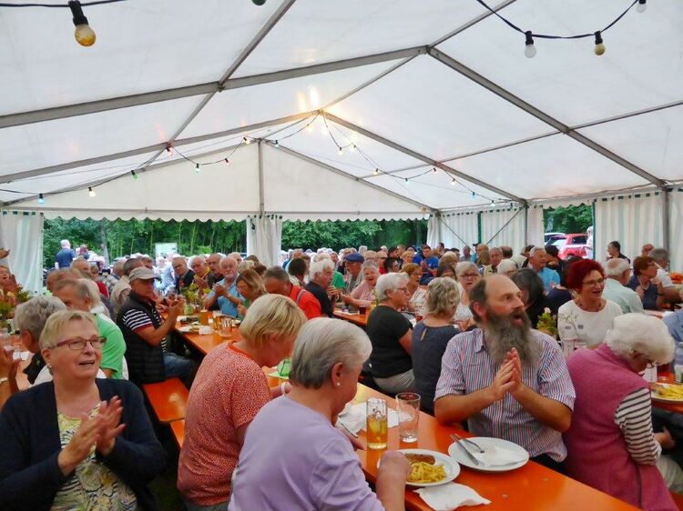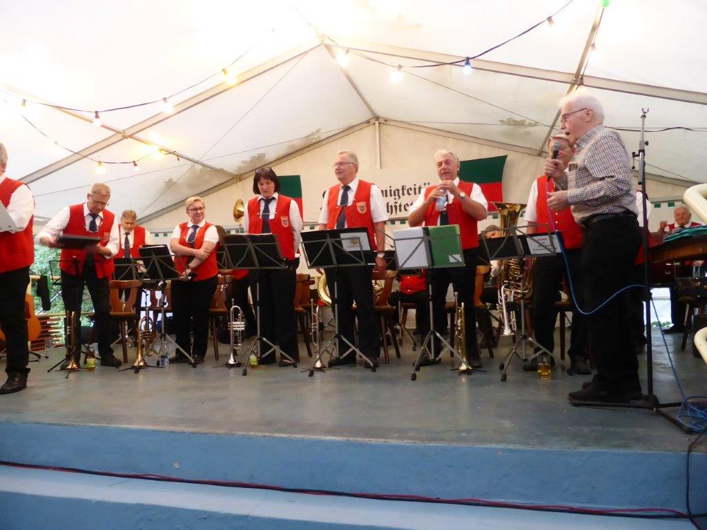Nachdem sich am Sonntagabend die Modernen und Jungen Chöre so bravourös präsentiert hatten, war man natürlich auf den Montagabend gespannt. Da herrschte nachmittags schon emsiges Treiben im Vereinsheim, um die Festbesucher wieder gut verköstigen zu können. Das Zelt füllte sich und so konnte um 19.30 Uhr der Bunte Abend beginnen. Unsere Stimmungsmacher, der Musikzug der Freiwilligen Feuerwehr, machten ihrem Ruf alle Ehre, dieses Mal nicht nur instrumental, sondern auch ein gesanglich sehr mitreißender Auftakt.