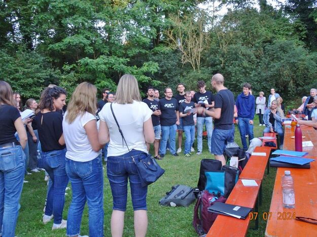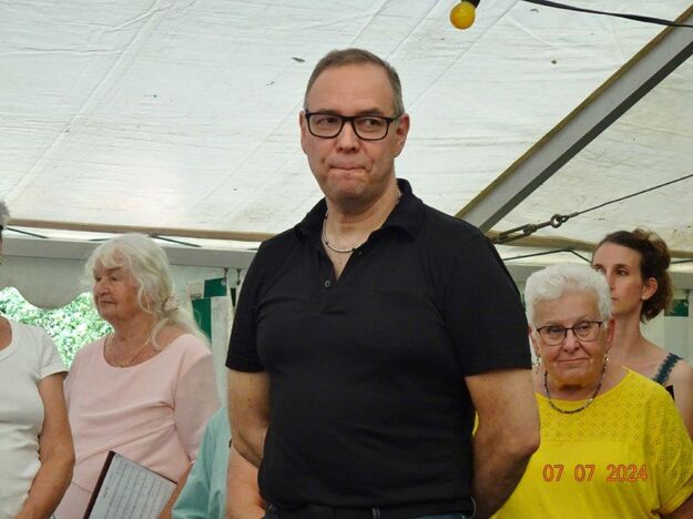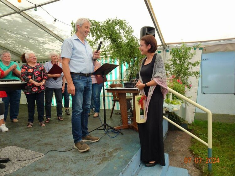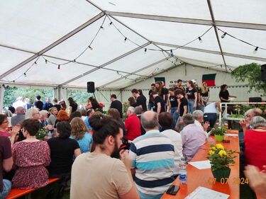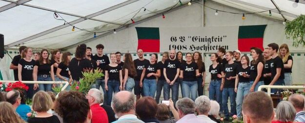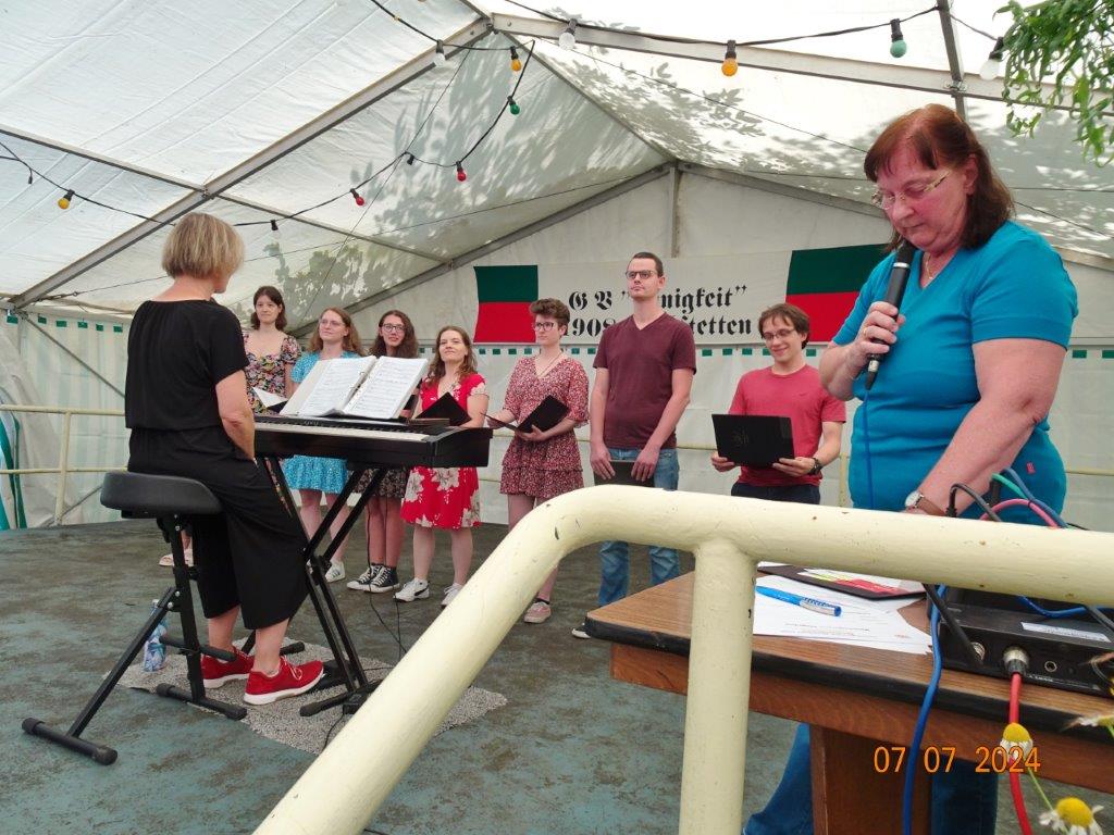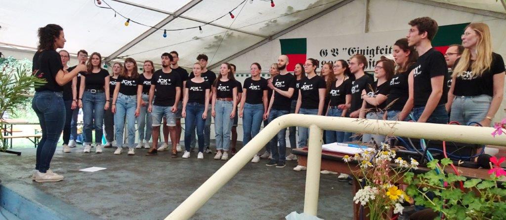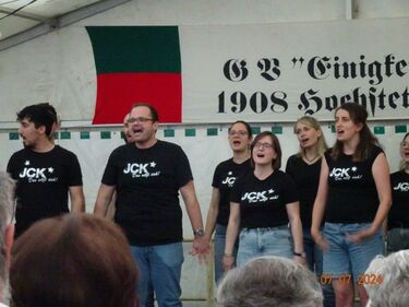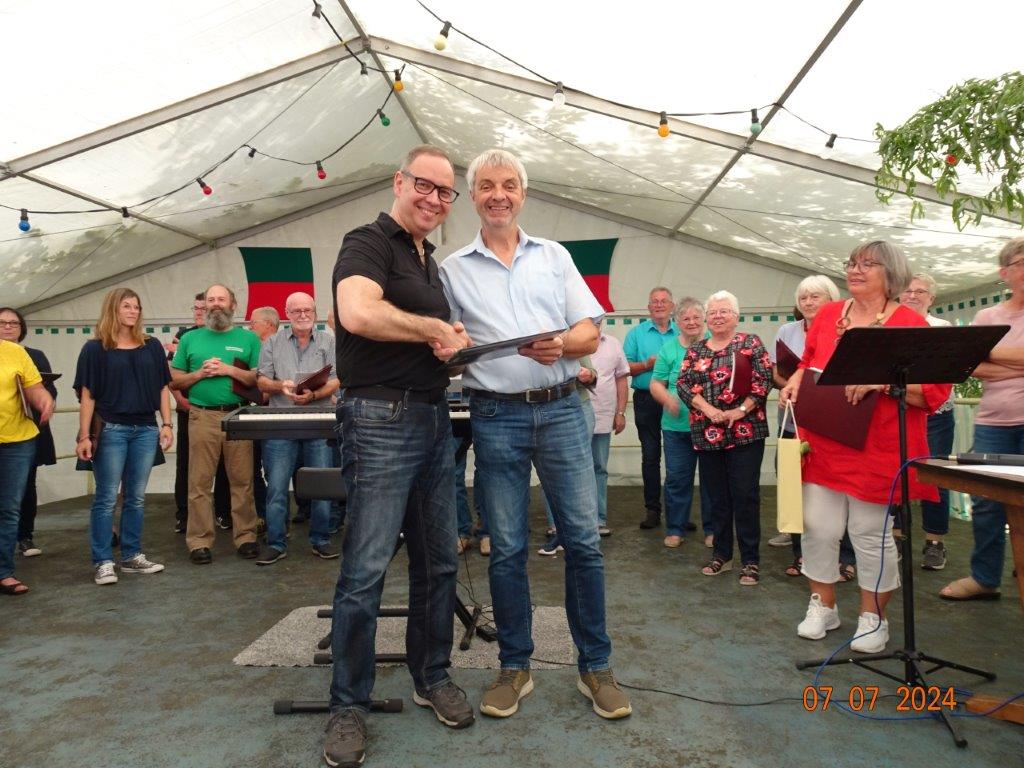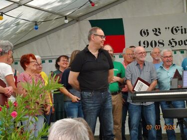 Höhepunkt des Abends war die Ehrung unseres Dirigenten Aldo Martinez, der unseren Chor nun schon seit 10 Jahren leitet. Rainer Ritz hielt eine wunderbare Laudatio auf ihn und unser Vorsitzender Klaus Reinhardt überreichte Aldo einen Gutschein für einen gemeinsamen Abend im Palazzo mit seiner Frau, die auch ein kleines Präsent bekam. Im weiteren Programm folgte der Rhythmuschor des Liederkranz Spöck und „Remix“, der Jugendchor des Vereins, beide Chöre begeisterten, die acht Jugendlichen von Remix im Besonderen! „DaCapo“, der moderne Chor des Liederkranz Graben gefiel ebenso, wie der nächste Auftritt des „Coro Minuetto“ von unserem Bruderverein Sängerbund Linkenheim. Mitreißender Gesang und Choreographie wurden geboten und von unserem Highlight, dem „JCK“ - Jazzchor am KIT, fortgesetzt. Clara Ries hat die Leitung des JCK erfolgreich übernommen. Am 27.und 28. Juli kann man den Chor bei seinen Sommer-Konzerten besuchen. Der Jazzchor bot noch einige Zugaben außerhalb des Festzeltes, wer wollte, konnte mitsingen und so setzte sich der Abend bis zum Ende in guter Stimmung fort.