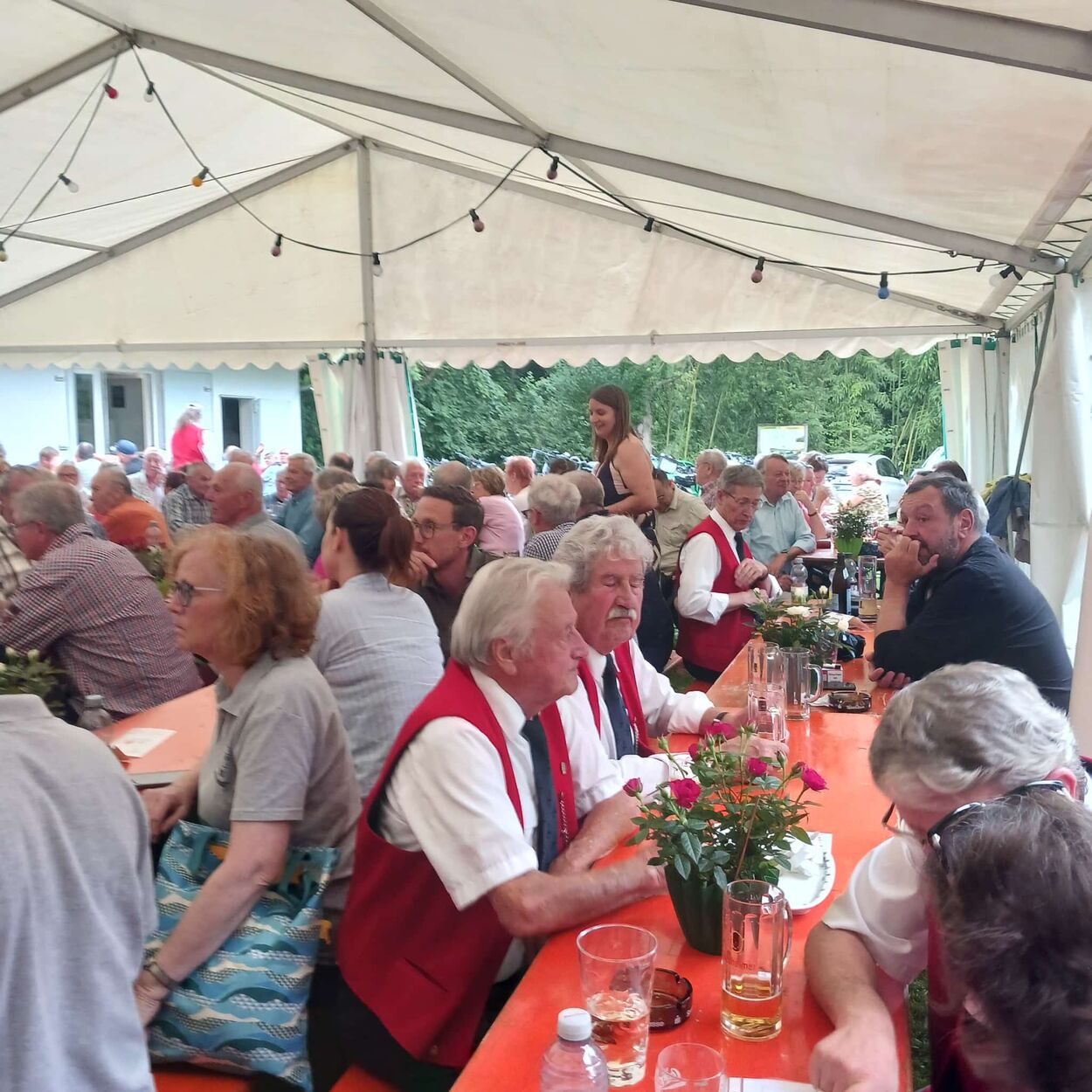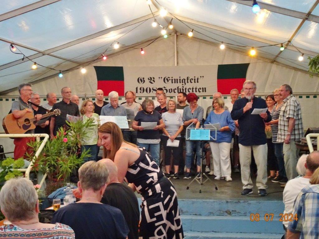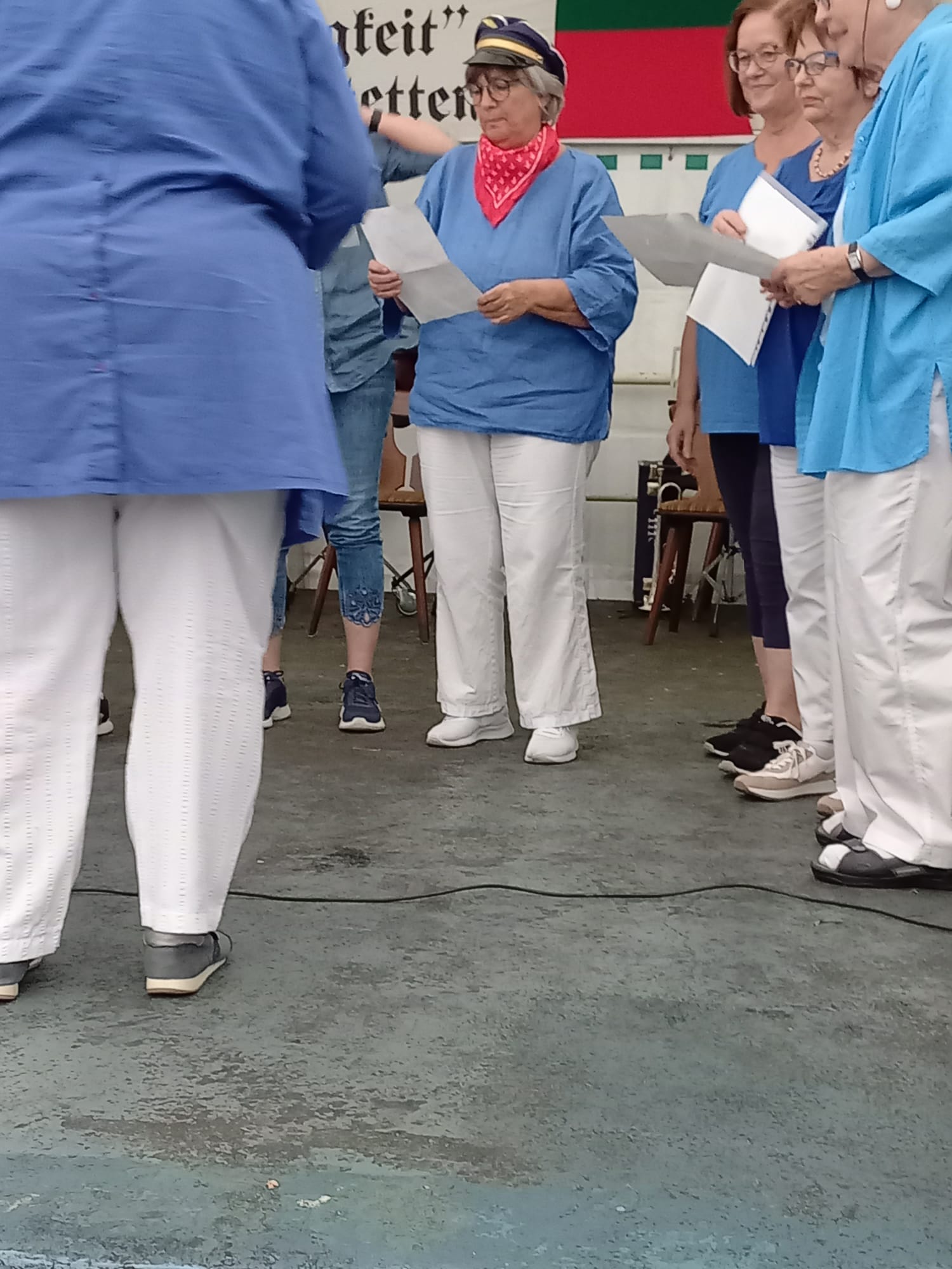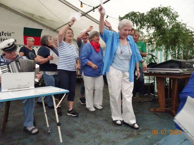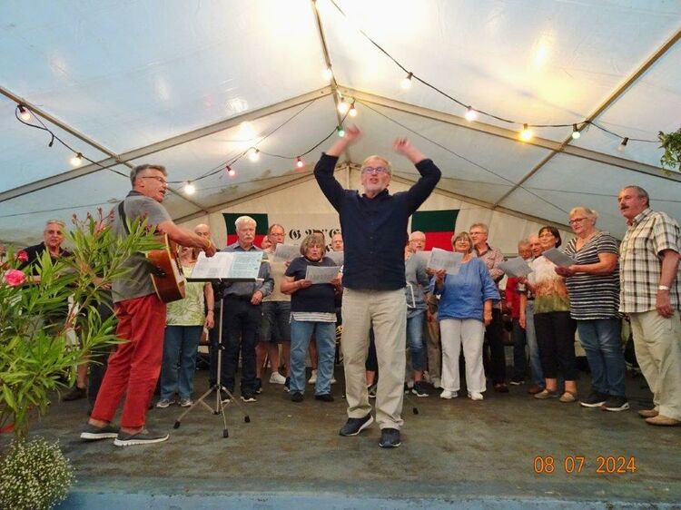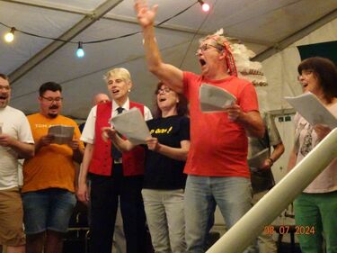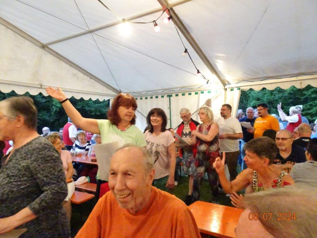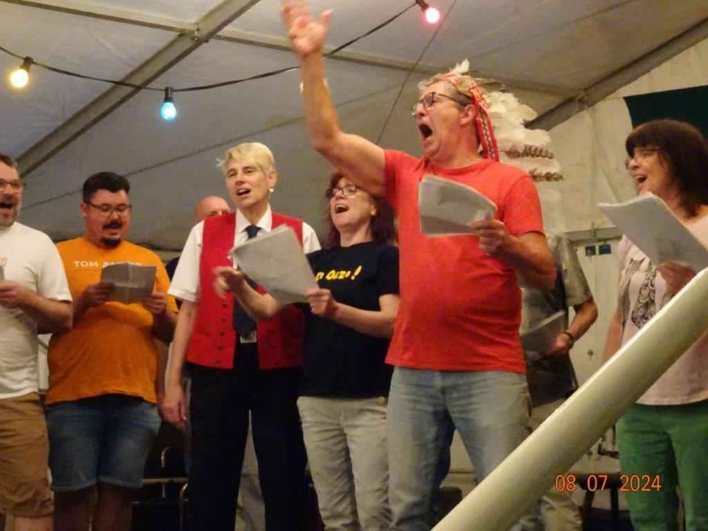 Am Sängerfest-Montag waren schon früh wieder fleißige Chorleute im Vereinsheim, um zu putzen und zu richten für den Festbetrieb ab 16.00 Uhr. Uschi und Rolf waren erneut prädestiniert, die Zwiebeln für die Steaks vorzubereiten, supergut!! Der Nachmittag lief langsam an, aber nach 18.00 Uhr füllte sich das Zelt, denn nach 19.30 Uhr gings los mit dem Bunten Abend. Dieser wurde wieder obligatorisch vom Musikzug der FFW eröffnet und der Begrüßung der Gäste und teilnehmenden Gruppen durch unseren ersten Vorsitzenden Klaus Reinhardt. Die Gymnastikdamen des FVH, begleitet von Klaus Eichsteller auf dem Akkordeon und dirigiert von Brigitte Lang, brachten als nächstes gekonnt den Wellerman auf die Bühne, bevor ihnen ein Team der Rathausbelegschaft folgte. Bürgermeister Michael Möslang hatte sein Versprechen vom letzten Jahr wahrgemacht und einen stattlichen „Rathaus-Chor“vorzuweisen. Verschiedene umgetextete Lieder, die den Alltag der Gemeindebediensteten auf die Schippe nahmen, darunter auch Reinhard Meys „Antrag auf Erteilung eines Formulars“, brachten das Publikum in Laune. Michael Möslang richtete anschließend Dankesworte an unseren GV und an alle Beteiligten für die Leistung, so ein Fest zu stemmen, aber vor allem an unseren 1. Vorsitzenden Klaus. Als Vorstand eines Vereins hat man unzählige Aufgaben zu erledigen, zu organisieren, Verantwortung zu tragen und überall den Blick zu haben, das wird oft nicht wirklich gewürdigt. Kurzum, auch von uns Aktiven dafür ein ganz herzliches Dankeschön an Klaus! Die Trimm-Dich-Truppe des FVH Fußball, unter der Leitung von Klaus und Wolfgang König, brachtens sportlich. Mit dem Lied „Ein bißchen Frieden“, wurde es besinnlicher und das Publikum sang gerne mit, ist doch der Wunsch nach Frieden auf der Welt in uns allen gegenwärtig. Monika mit ihren Prismaten, inzwischen eine stattliche Truppe, kamen dann schon singend ins Zelt. Sie hatten „Zwei kleine Italiener“ dabei und weitere Stimmungslieder, mit denen sie das Publikum noch mehr anheizten, um dann mit „Da sprach der alte Häuptling der Indianer“, passendem Federschmuck, Trommeln und Indianergeheul die Bühne zu verlassen. Das Publikum tobte und stimmte mit ein und belohnte die Prismaten mit viel Beifall, sind sie doch bei uns immer ein Publikumsmagnet und gerne gesehen, ebenso natürlich der Musikzug der FFW Li-Ho., unter der Leitung von Uwe Dürr, der nun wieder die Bühne einnahm. Darunter das Geburtstagskind Tanja, die mit einem Geburtstagslied und einer Flasche Sekt gratuliert bekam – alles Gute weiterhin. Die Gesangsgruppe der FFW, mit Uwe Dürr, ihrem Textschreiber und Komponist Harry Zwecker, Rolf Alber und Roger Seitz, trieb das Stimmungsbarometer in die Höhe mit dem Erlich-Lied, bevor der Eberhard, der 'ne harte Leber hat und der Paul mit seim Gaul die Bühne eroberten. Danach wurde von jeder Gesangsgruppe ein Vertreter auf die Bühne gerufen und erhielt ein gutes Tröpfchen für die Beteiligung an unserem Bunten Abend – ihr wart alle Spitze!