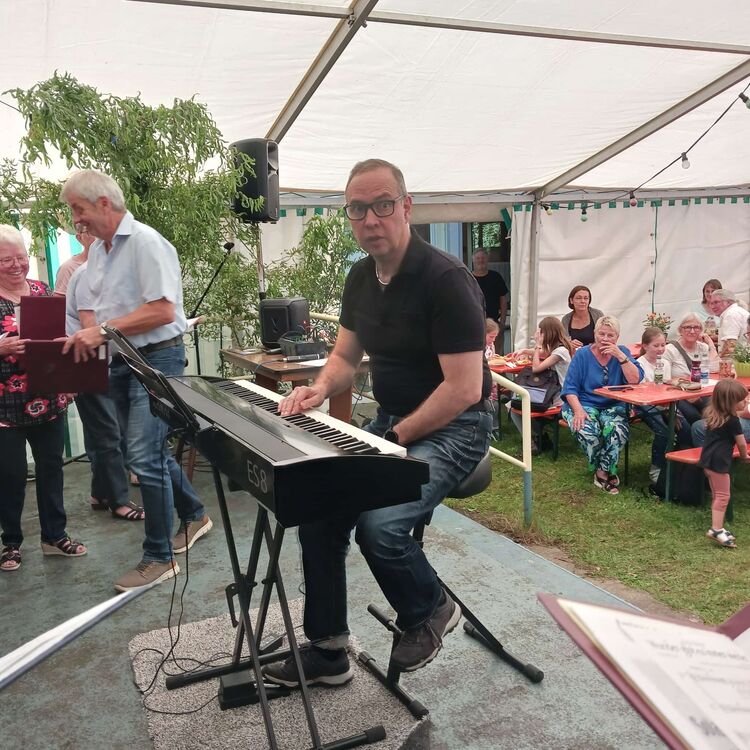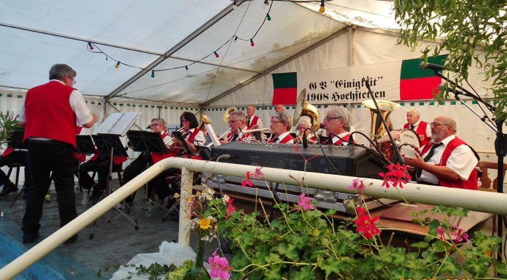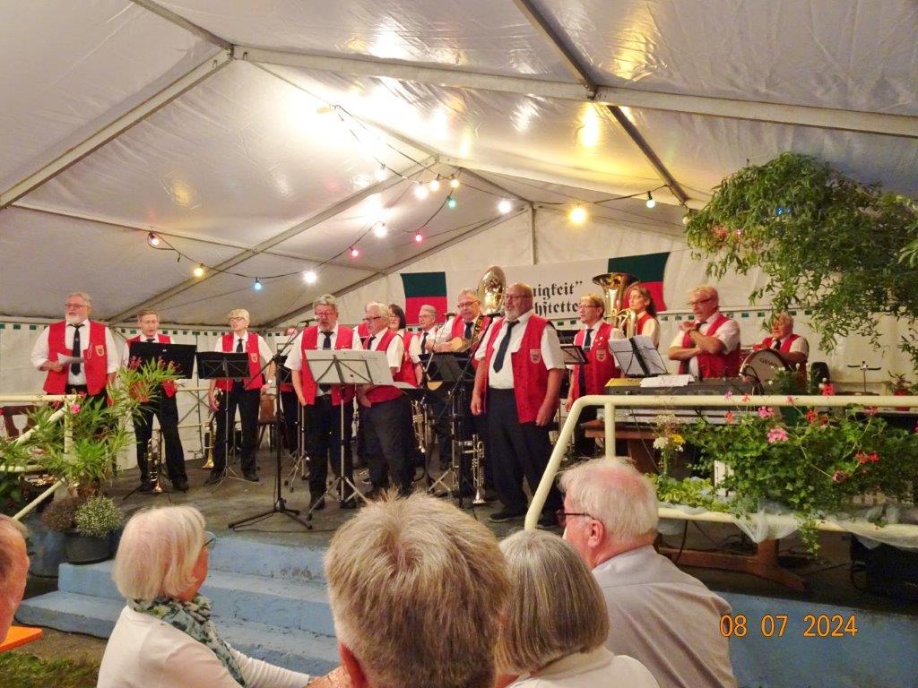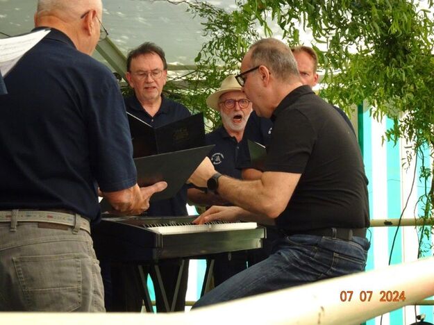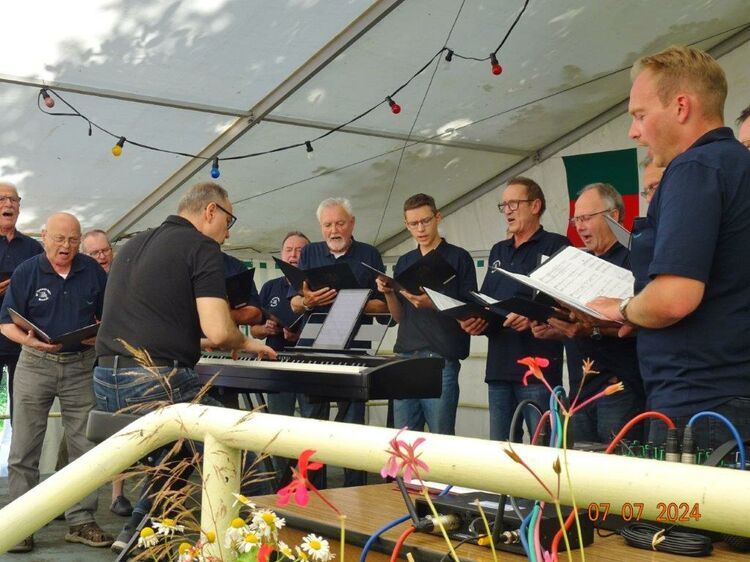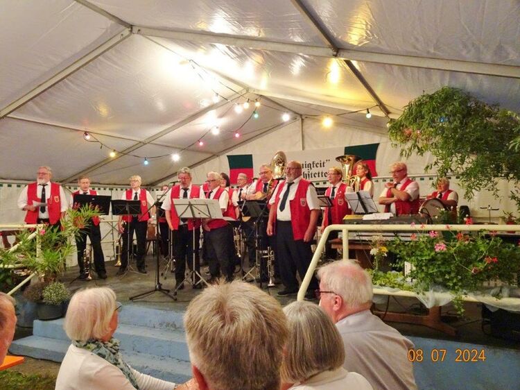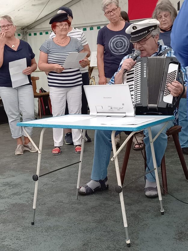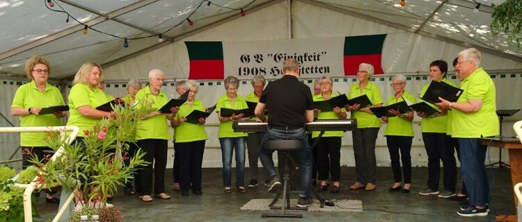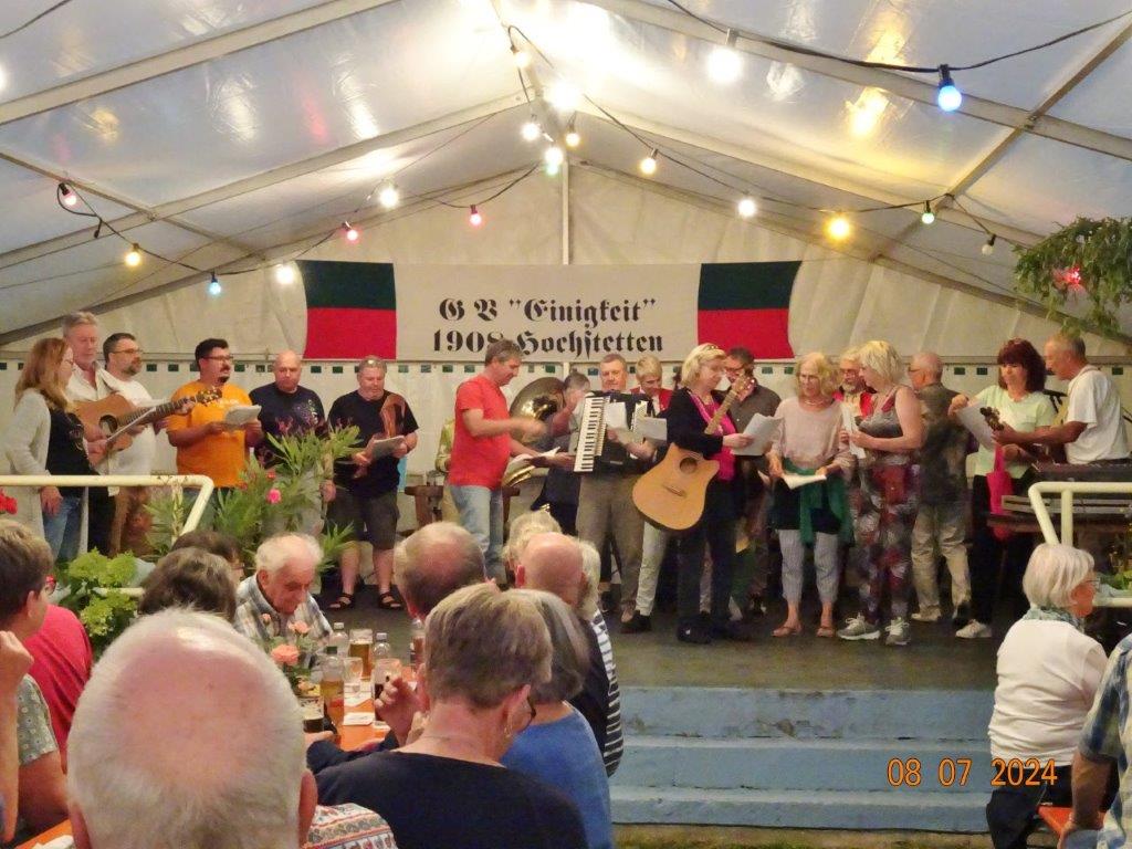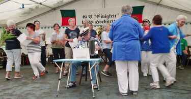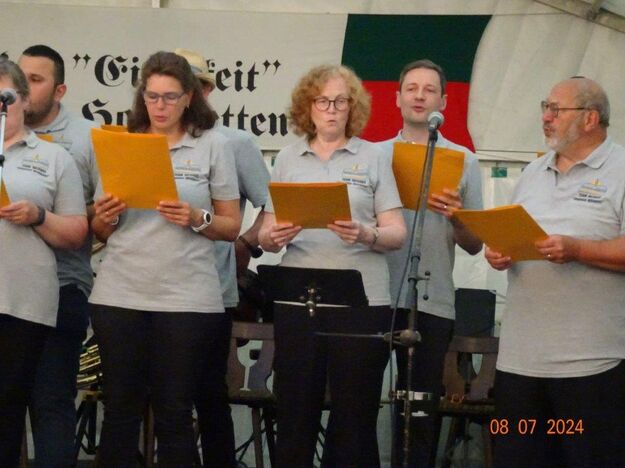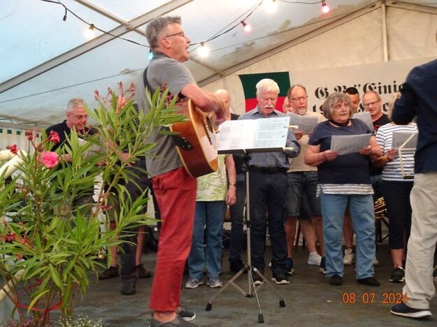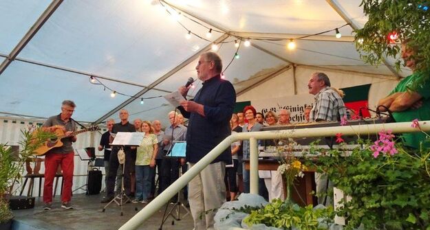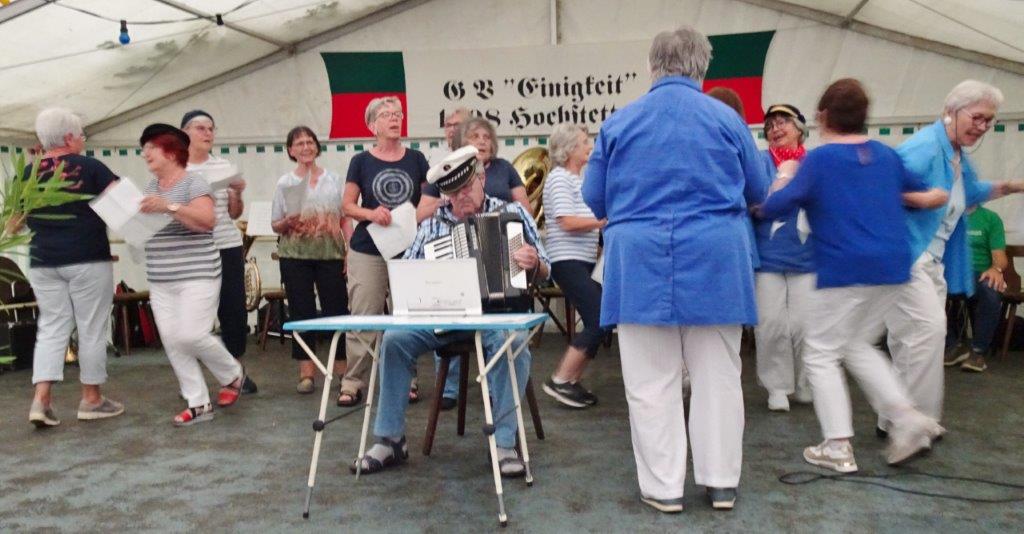 Am Sängerfest-Montag waren schon früh wieder fleißige Chorleute im Vereinsheim, um zu putzen und zu richten für den Festbetrieb ab 16.00 Uhr. Uschi und Rolf waren erneut prädestiniert, die Zwiebeln für die Steaks vorzubereiten, supergut!! Der Nachmittag lief langsam an, aber nach 18.00 Uhr füllte sich das Zelt, denn nach 19.30 Uhr gings los mit dem Bunten Abend. Dieser wurde wieder obligatorisch vom Musikzug der FFW eröffnet und der Begrüßung der Gäste und teilnehmenden Gruppen durch unseren ersten Vorsitzenden Klaus Reinhardt. Die Gymnastikdamen des FVH, begleitet von Klaus Eichsteller auf dem Akkordeon und dirigiert von Brigitte Lang, brachten als nächstes gekonnt den Wellerman auf die Bühne, bevor ihnen ein Team der Rathausbelegschaft folgte. Bürgermeister Michael Möslang hatte sein Versprechen vom letzten Jahr wahrgemacht und einen stattlichen „Rathaus-Chor“vorzuweisen. Verschiedene umgetextete Lieder, die den Alltag der Gemeindebediensteten auf die Schippe nahmen, darunter auch Reinhard Meys „Antrag auf Erteilung eines Formulars“, brachten das Publikum in Laune. Michael Möslang richtete anschließend Dankesworte an unseren GV und an alle Beteiligten für die Leistung, so ein Fest zu stemmen, aber vor allem an unseren 1. Vorsitzenden Klaus. Als Vorstand eines Vereins hat man unzählige Aufgaben zu erledigen, zu organisieren, Verantwortung zu tragen und überall den Blick zu haben, das wird oft nicht wirklich gewürdigt. Kurzum, auch von uns Aktiven dafür ein ganz herzliches Dankeschön an Klaus! Die Trimm-Dich-Truppe des FVH Fußball, unter der Leitung von Klaus und Wolfgang König, brachtens sportlich. Mit dem Lied „Ein bißchen Frieden“, wurde es besinnlicher und das Publikum sang gerne mit, ist doch der Wunsch nach Frieden auf der Welt in uns allen gegenwärtig. Monika mit ihren Prismaten, inzwischen eine stattliche Truppe, kamen dann schon singend ins Zelt. Sie hatten „Zwei kleine Italiener“ dabei und weitere Stimmungslieder, mit denen sie das Publikum noch mehr anheizten, um dann mit „Da sprach der alte Häuptling der Indianer“, passendem Federschmuck, Trommeln und Indianergeheul die Bühne zu verlassen. Das Publikum tobte und stimmte mit ein und belohnte die Prismaten mit viel Beifall, sind sie doch bei uns immer ein Publikumsmagnet und gerne gesehen, ebenso natürlich der Musikzug der FFW Li-Ho., unter der Leitung von Uwe Dürr, der nun wieder die Bühne einnahm. Darunter das Geburtstagskind Tanja, die mit einem Geburtstagslied und einer Flasche Sekt gratuliert bekam – alles Gute weiterhin. Die Gesangsgruppe der FFW, mit Uwe Dürr, ihrem Textschreiber und Komponist Harry Zwecker, Rolf Alber und Roger Seitz, trieb das Stimmungsbarometer in die Höhe mit dem Erlich-Lied, bevor der Eberhard, der 'ne harte Leber hat und der Paul mit seim Gaul die Bühne eroberten. Danach wurde von jeder Gesangsgruppe ein Vertreter auf die Bühne gerufen und erhielt ein gutes Tröpfchen für die Beteiligung an unserem Bunten Abend – ihr wart alle Spitze!