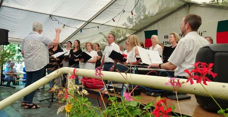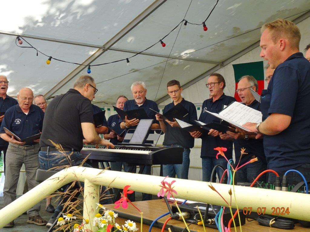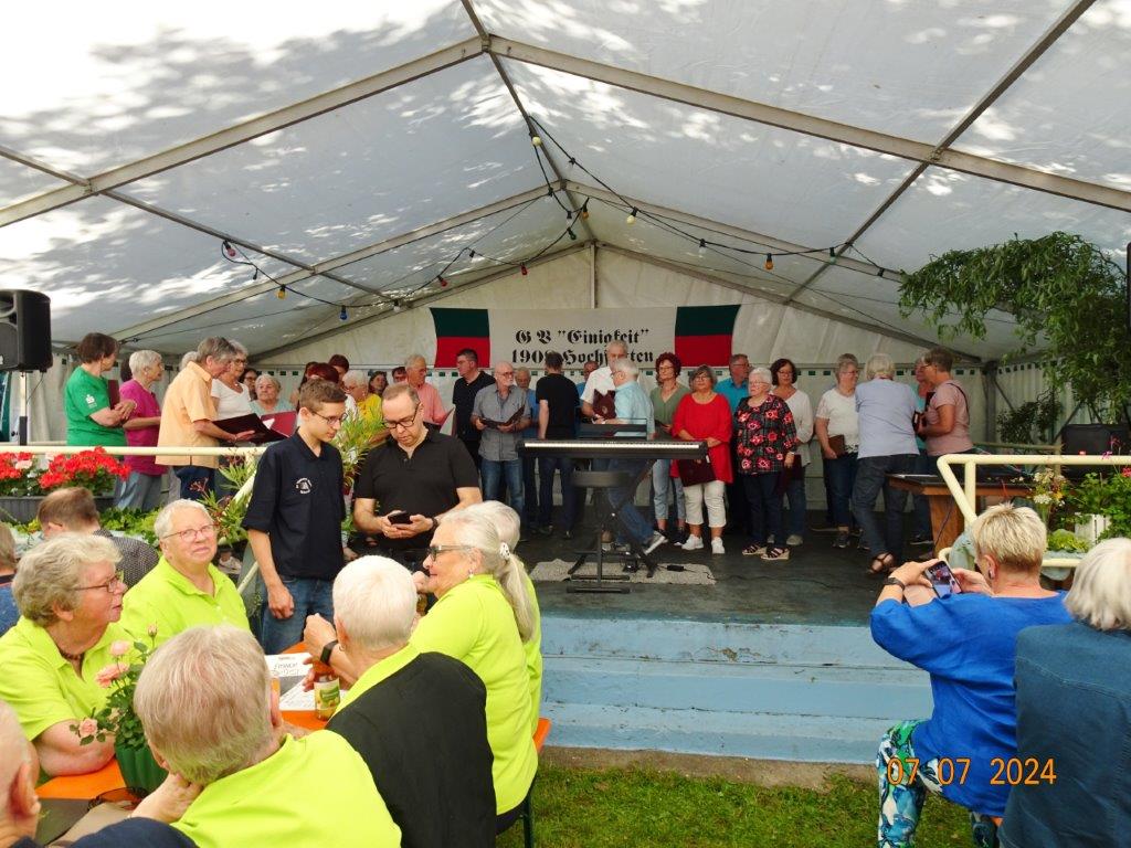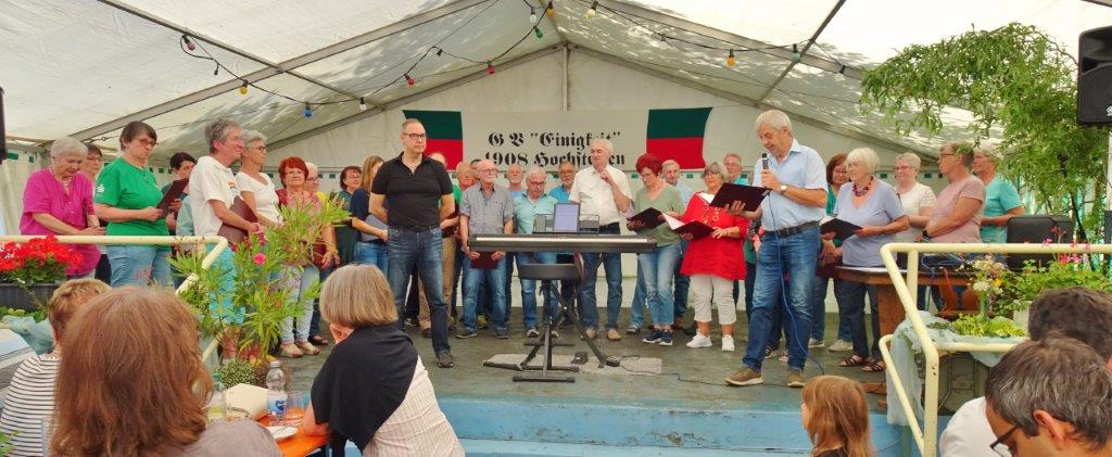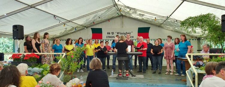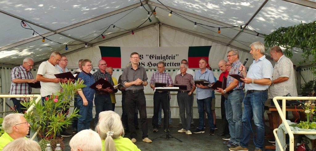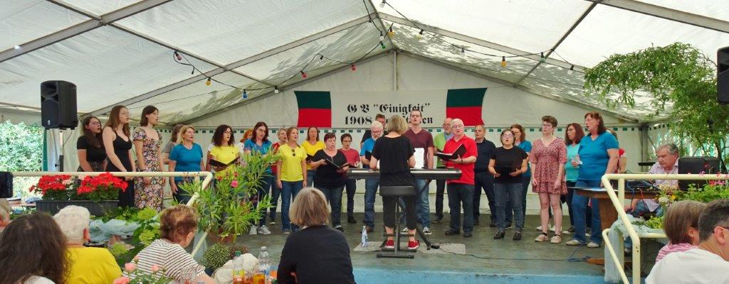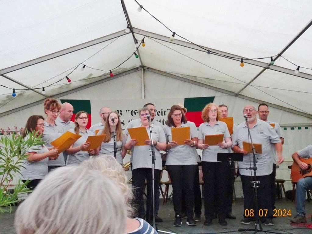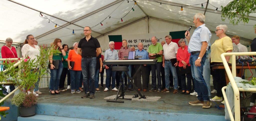 Um 14.00 Uhr begann das offizielle Programm mit den Traditionschören, das wir gemeinsam mit dem Eventchor eröffneten. Unsere drei Lieder kamen gut an und unser erster Vorsitzender Klaus Reinhardt begrüßte alle Anwesenden im gut besuchten Zelt. Als nächstes trug der Männerchor der Sängervereinigung Liedolsheim klangvoll seine Lieder vor, auch der gemischte Chor des Liederkranz Graben. Die Eintracht Spöck war unter Aldo´s Leitung mit dem Frauenchor und dem Männerchor bestens vertreten und Aldo hatte ebenso mit dem gemischten Chor des Sängerbund Friedrichstal eine gute Formation zu bieten. Dann gabs erstmal eine Pause zum Stärken und Plaudern, bevor wir gegen 18.00 Uhr den „Abend der Modernen Chöre“ mit drei weiteren Liedern eröffneten.