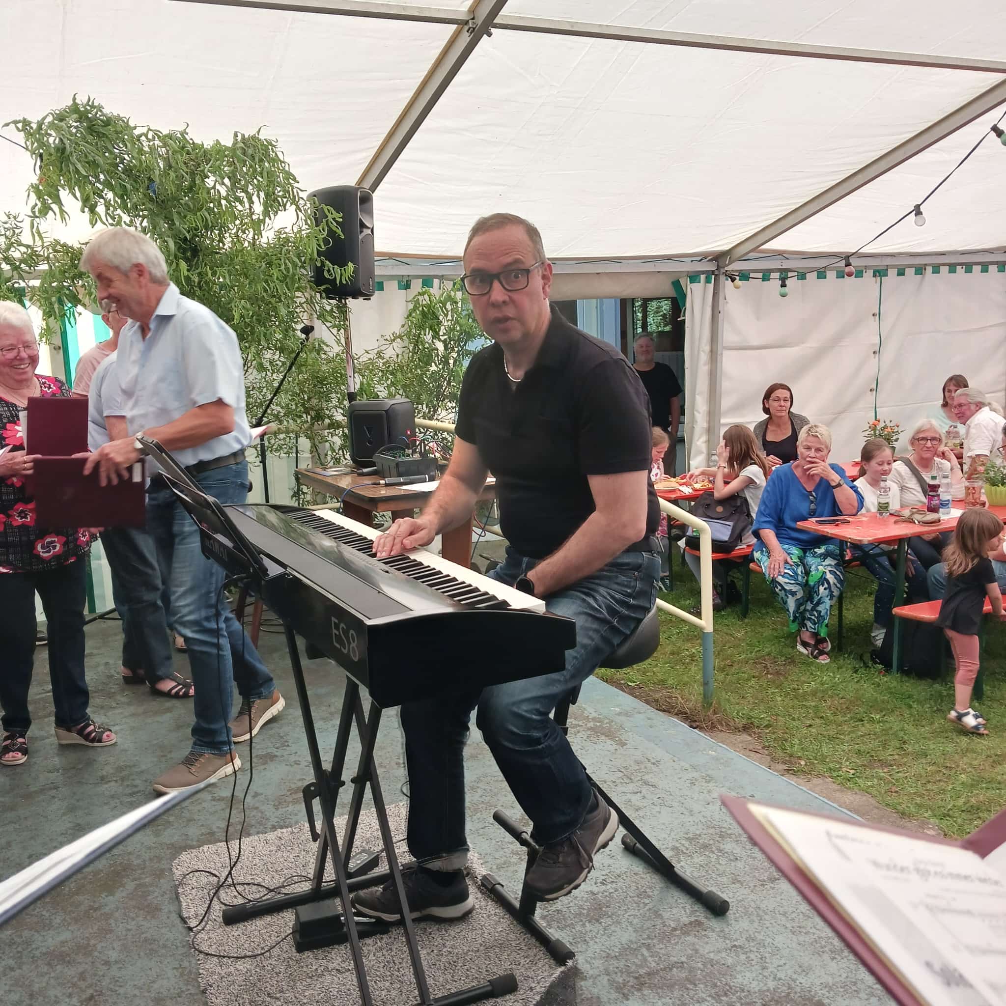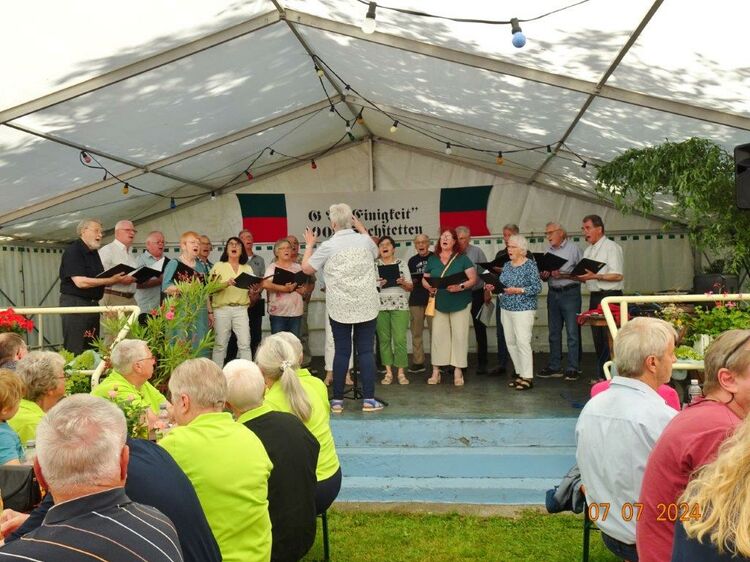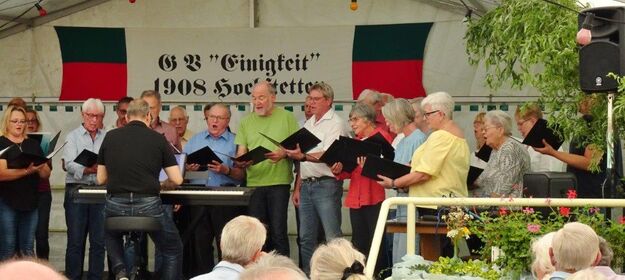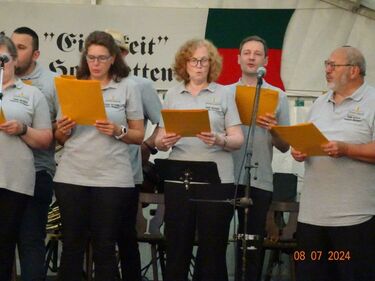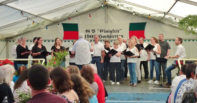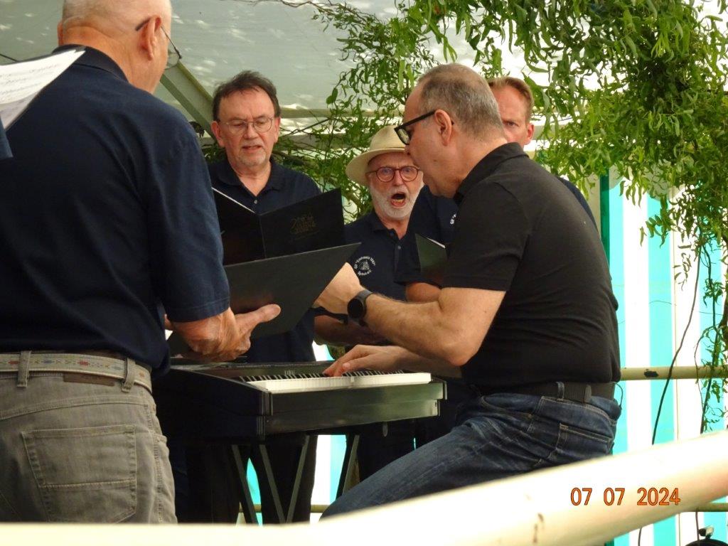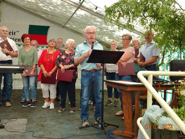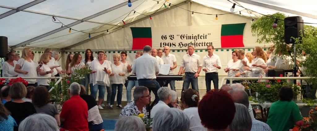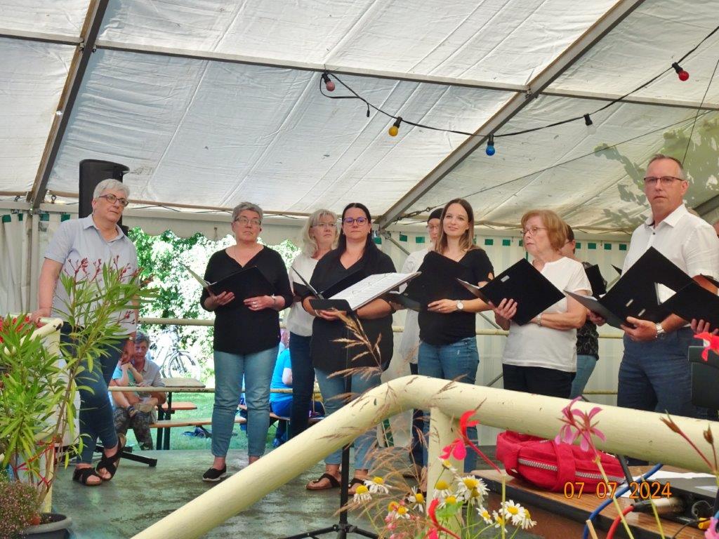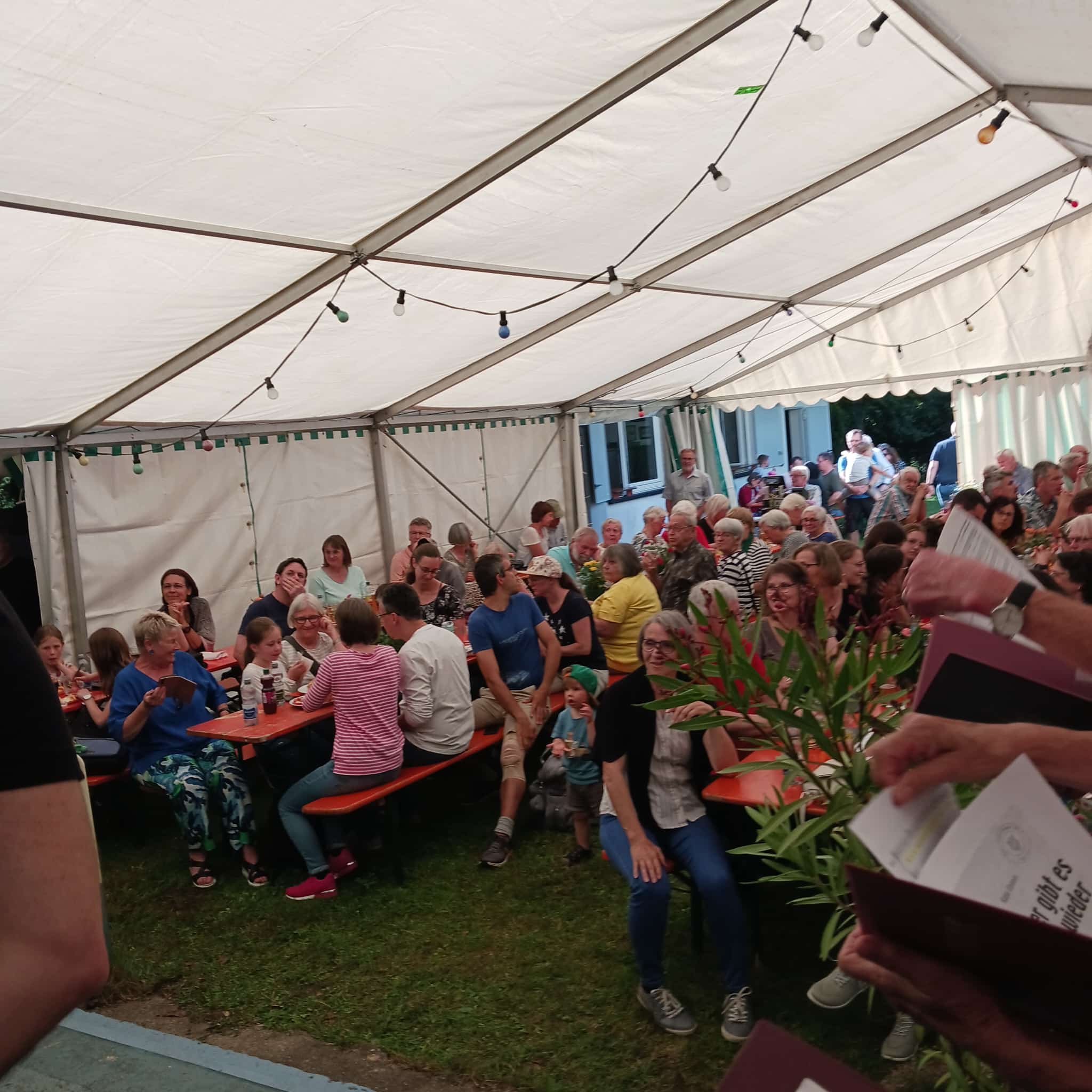 Um 14.00 Uhr begann das offizielle Programm mit den Traditionschören, das wir gemeinsam mit dem Eventchor eröffneten. Unsere drei Lieder kamen gut an und unser erster Vorsitzender Klaus Reinhardt begrüßte alle Anwesenden im gut besuchten Zelt. Als nächstes trug der Männerchor der Sängervereinigung Liedolsheim klangvoll seine Lieder vor, auch der gemischte Chor des Liederkranz Graben. Die Eintracht Spöck war unter Aldo´s Leitung mit dem Frauenchor und dem Männerchor bestens vertreten und Aldo hatte ebenso mit dem gemischten Chor des Sängerbund Friedrichstal eine gute Formation zu bieten. Dann gabs erstmal eine Pause zum Stärken und Plaudern, bevor wir gegen 18.00 Uhr den „Abend der Modernen Chöre“ mit drei weiteren Liedern eröffneten.