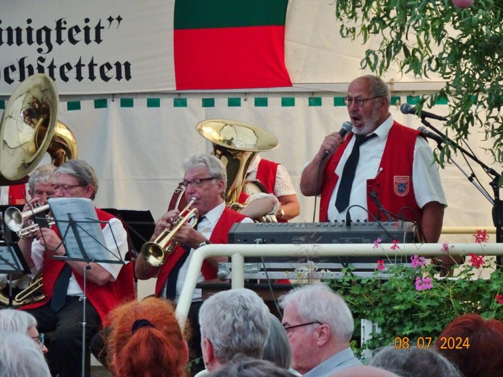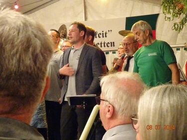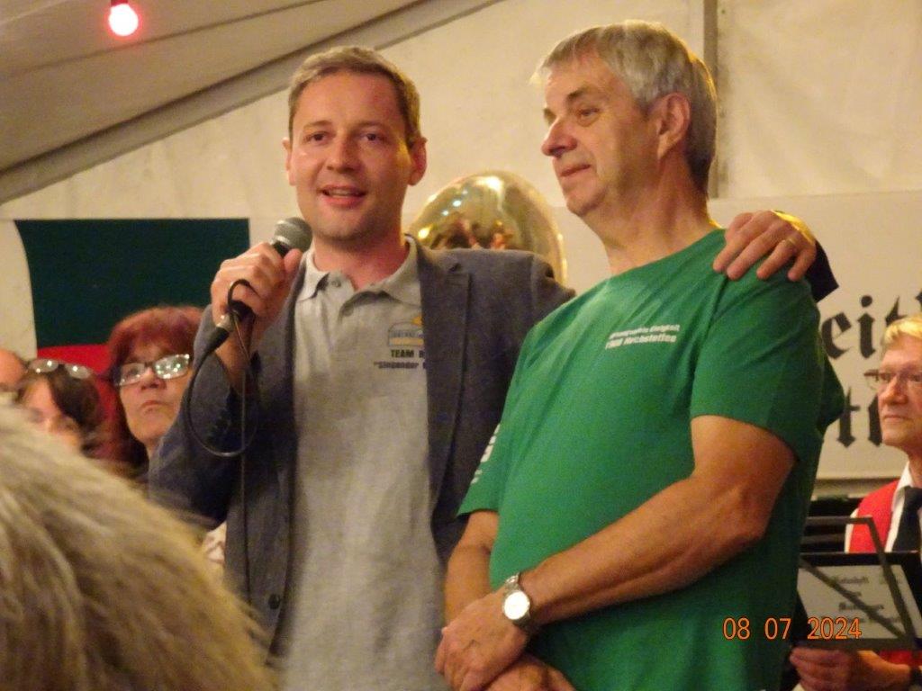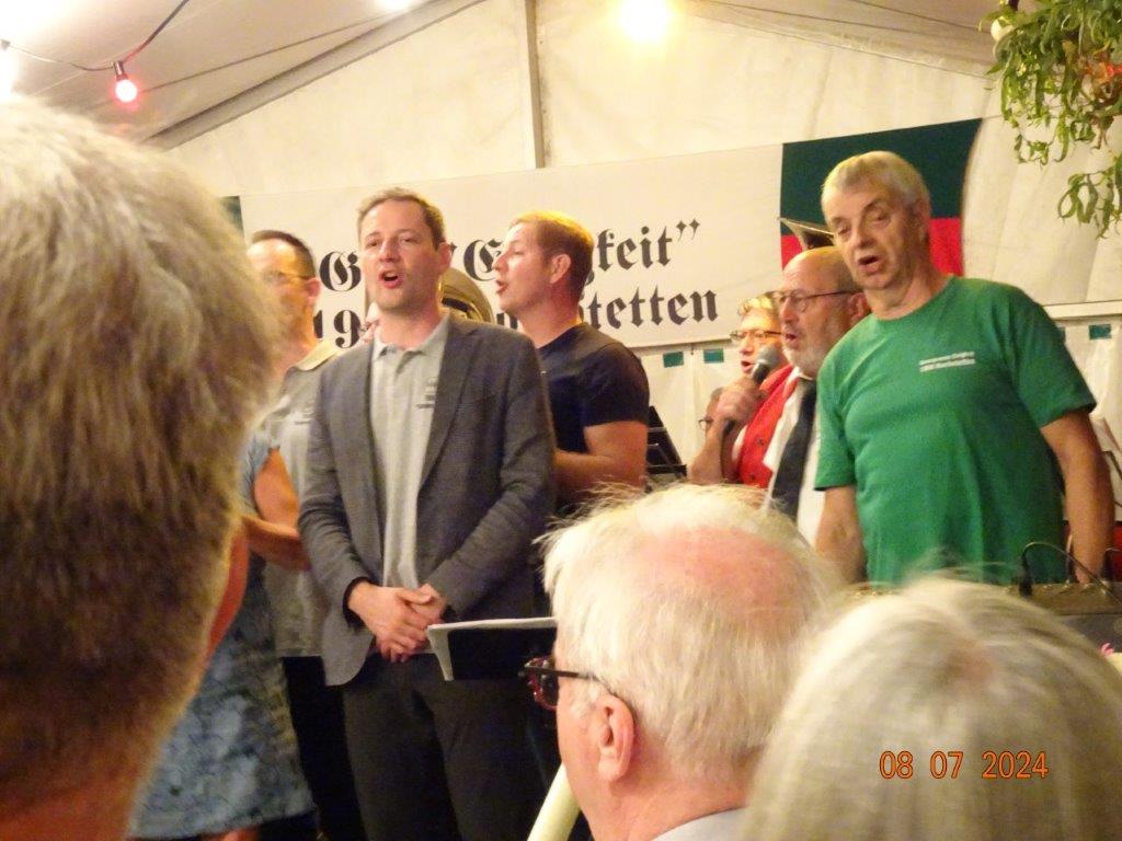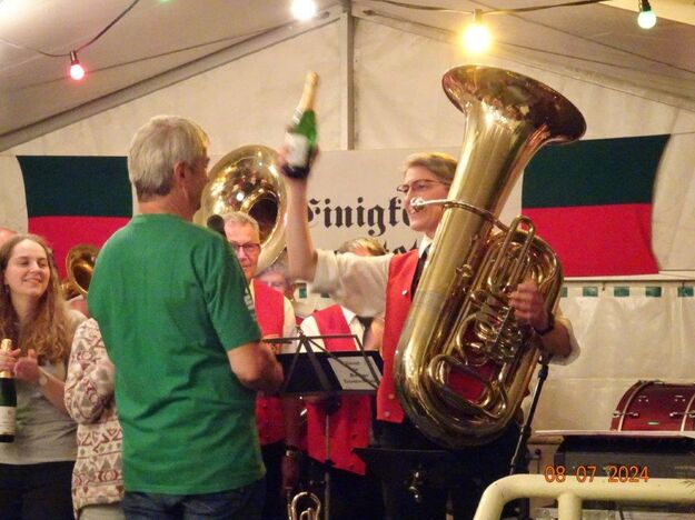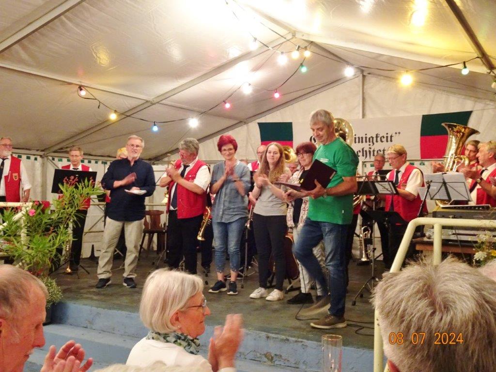 Zu guter Letzt stand das obligatorische Badnerlied an. Michael Möslang kam auf die Bühne, dieses Mal nicht von den Altbürgermeistern begleitet, sondern er rief seine neu gewählten Gemeinderäte, die teilweise noch anwesend waren, nach oben und stimmte mit ihnen das Badnerlied an. Das Publikum hatte sich zum mitsingen erhoben und so ging der offizielle Teil des Abends traditionell zu Ende. Ein Dankeschön auch dafür und auch nochmal denjenigen, die am Montag für die Bewirtung aller Anwesenden sorgten, damit sich jeder bei uns im Erlich wohl fühlen konnte. Am nächsten Tag folgten natürlich die Aufräum- und Putzarbeiten und der Zeltabbau. Ein Danke an den Anglerverein für die Bereitstellung des Zeltes und der Mithilfe beim Auf- und Abbau und erneut an alle Helfenden, die sich vor, nach und über die Festtage in jedweder Form bei uns engagiert haben. Ohne euch alle könnten wir nie so ein Fest bewältigen. Zwei Tage ein volles Zelt war der Lohn dafür, großartig! Auch an all unsere Besucher ganz herzlichen Dank und vielleicht bis nächstes Jahr auf ein Neues....