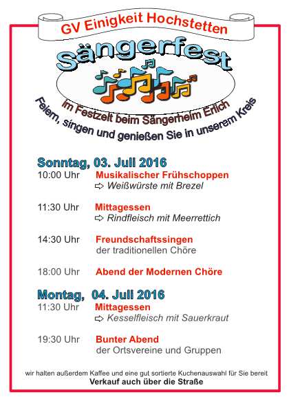Unser Chor eröffnete sonntags pünktlich um 10.00 Uhr das Sängerfest. Die Eintracht Graben, die Fidelia Leopoldshafen, der Sängerbund Friedrichstal, die Sängervereinigung Liedolsheim und der Liederkranz Friedrichstal umrahmten, unter der wieder gekonnt humorvollen Moderation von Rainer Ritz, musikalisch das Weißwurstfrühstück. Das Küchenpersonal hatte zur Mittagszeit alle Hände voll zu tun, das Wetter war angenehm, so fanden viele Besucher den Weg zu uns in den Erlich. Es hat sich auf jeden Fall gelohnt, denn die Chöre waren absolut hörenswert.