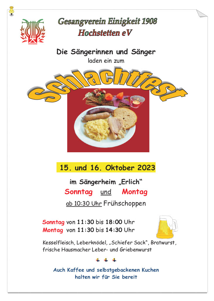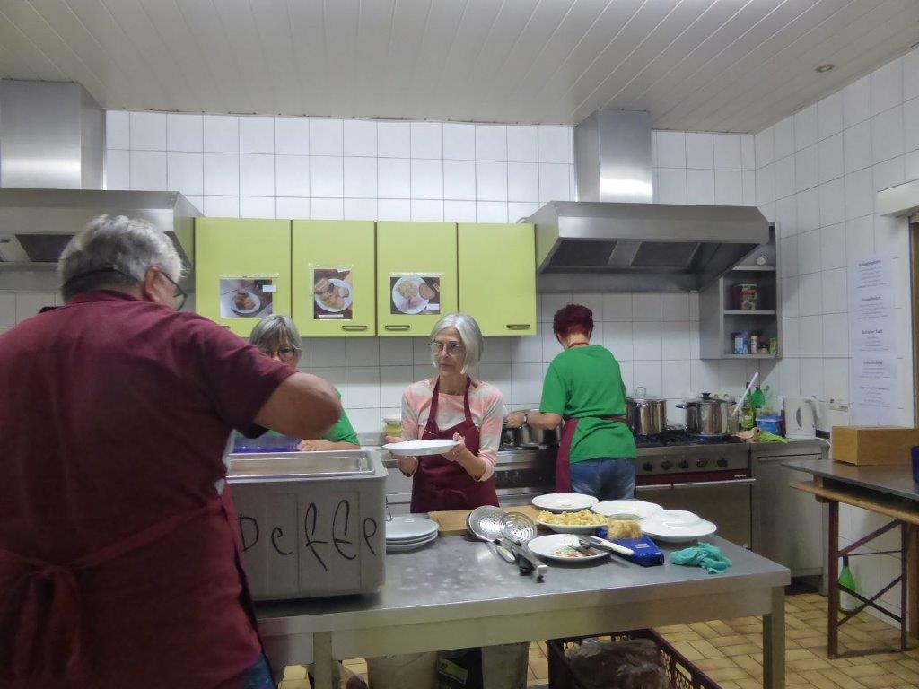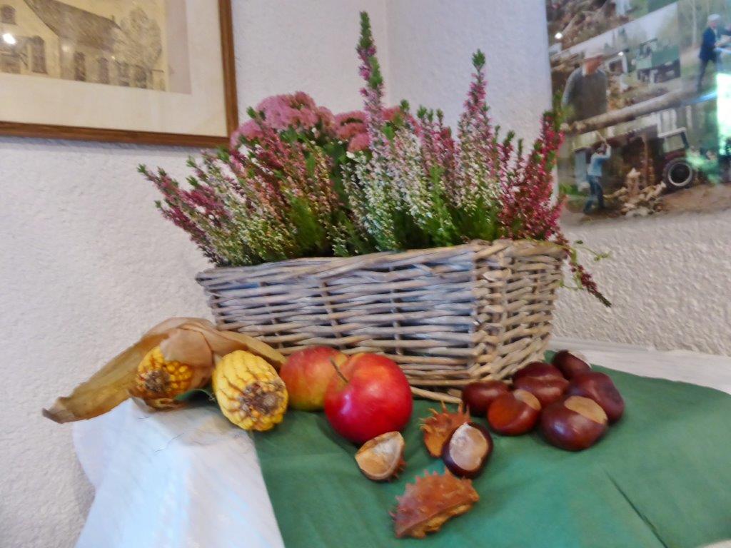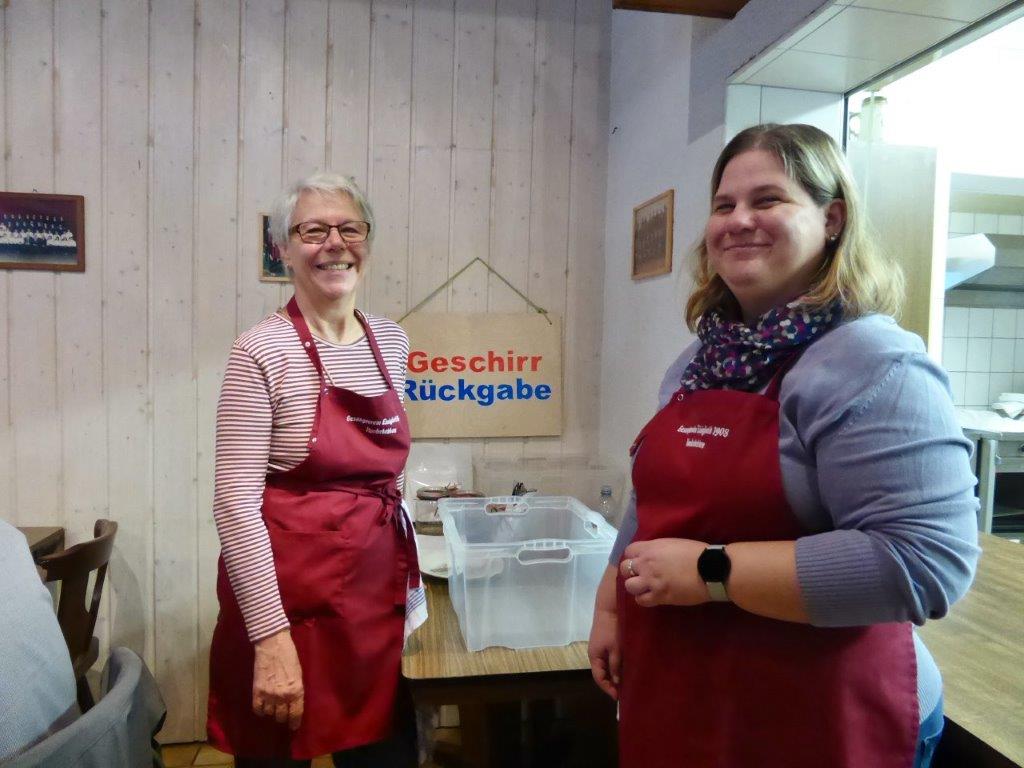 Samstags ab 9.30 Uhr fanden sich fleißige Helferinnen und Helfer im Vereinsheim im Erlich ein, um Vorbereitungen für das Schlachtfest zu treffen. Das Mobiliar wurde aufgestellt, inklusive der Kuchentheke und Vorkehrungen in der Küche getroffen. Unsere Rosi hatte ihren Garten geplündert und Ute`s Blumenschmuck ergänzt, so konnte es an die Tischdeko gehen, dazu passten auch wieder gut Kastanien. Die Kühlschränke wurden mit Getränken gefüllt, denn auch da wollten wir den Pfälzern nicht nachstehen. Sonntags ging es früh in der Küche los, um rechtzeitig alles für die Besucher gerichtet zu haben. Würden sie trotz Kirwe kommen? Ja, sie kamen, wir waren überwältigt. Die Sonne zeigte sich und wir konnten sogar draußen einige Biergarnituren aufstellen, die ruckzuck belegt waren. Das deftige Essen war begehrt und hat rundum geschmeckt und auch die Kuchentheke war immer wieder belagert. Wir danken all unseren Besuchern, schön, dass Ihr da wart und allen, die am Sonntag im Einsatz waren, Ihr wart großartig!!