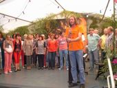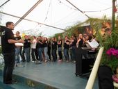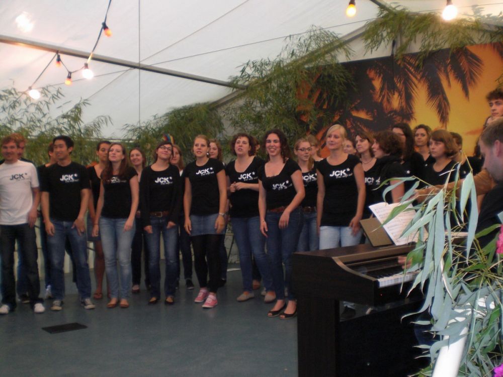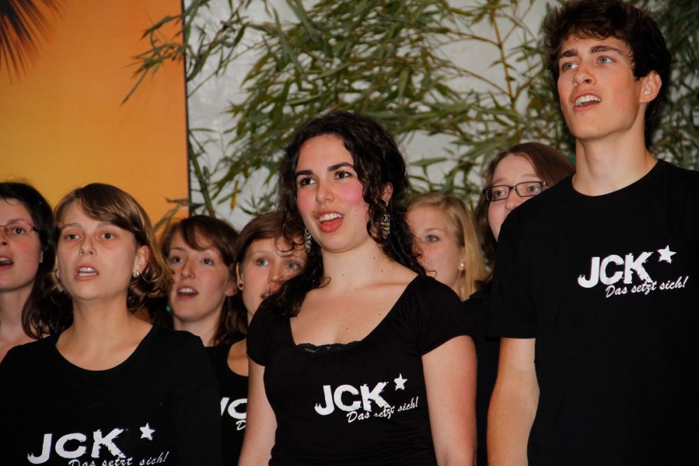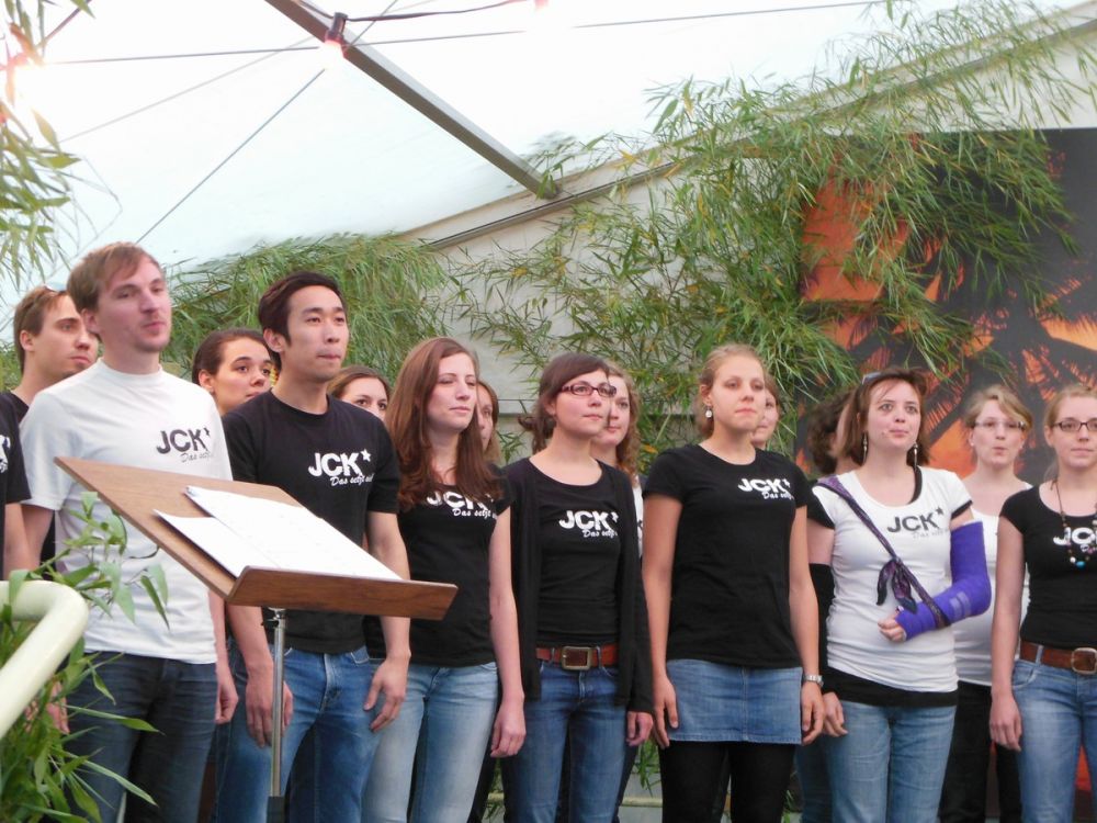 Der Jazzchor vom KIT Karlsruhe „JCK-das setzt sich“, mit Chorleiter Michael Hegenauer, brachte zum Abschluss des Abends das Zelt zum Toben. Anspruchsvolle Jazzstücke, locker leicht und perfekt vorgetragen, wurden von stehenden Ovationen belohnt, das begeisterte Publikum wollte die jungen Leute gar nicht mehr von der Bühne lassen. Urkomisch war die spontane Einlage von Uli Kofler als Sänger und Tänzer, nachdem er mit anhaltenden „Uli, Uli“ Rufen dazu aufgefordert worden war.