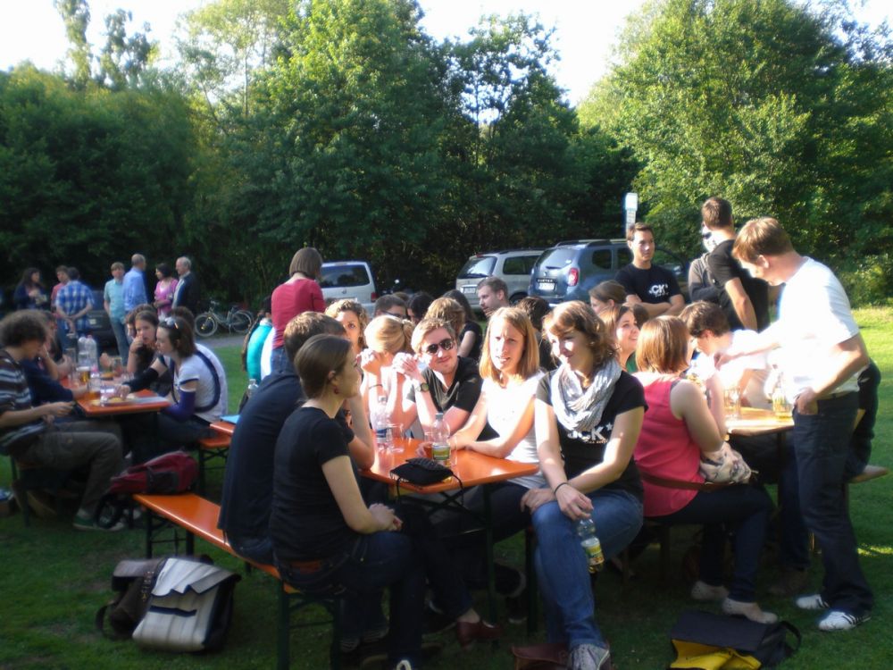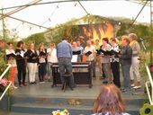 Auch diese Chöre wurden von Rainer Ritz jeweils mit einem Witz verabschiedet, manchmal mit Retourkutsche eines Sängers. Während der Gesangsvorträge trafen auch schon die ersten modernen Chöre für den Abend ein. Das Festzelt war noch voll besetzt, deshalb wurden schnell Tische und Bänke im Freien aufgebaut. Die jungen Leute vom Jazzchor spendeten herzlichen Applaus für die gesangliche Leistung der älteren Generation.