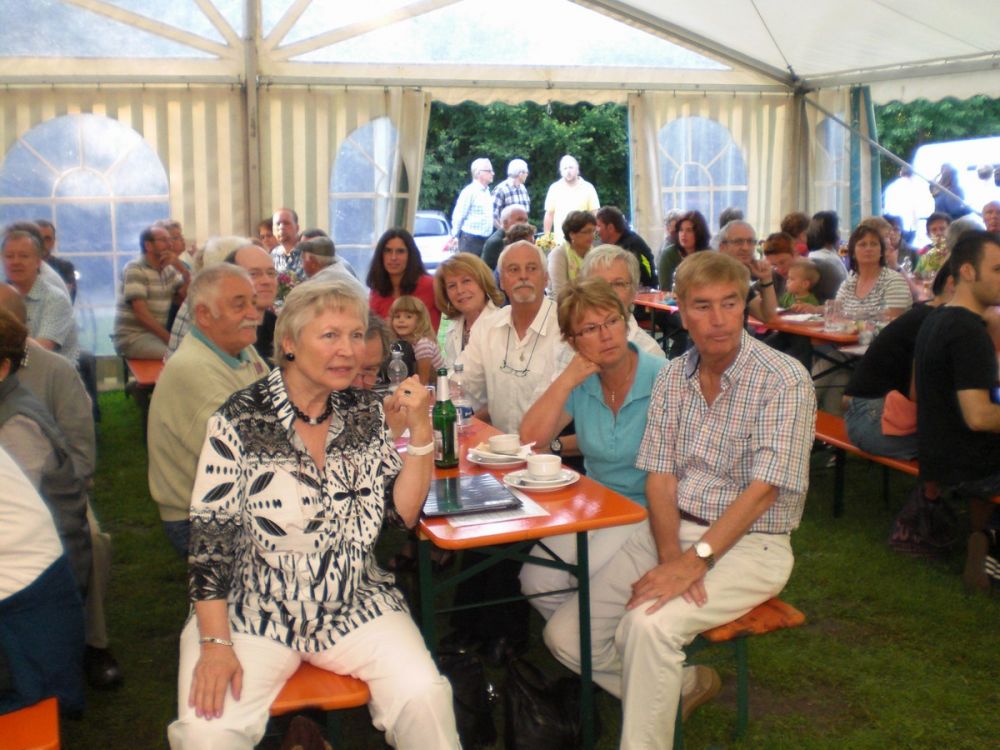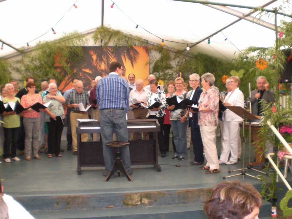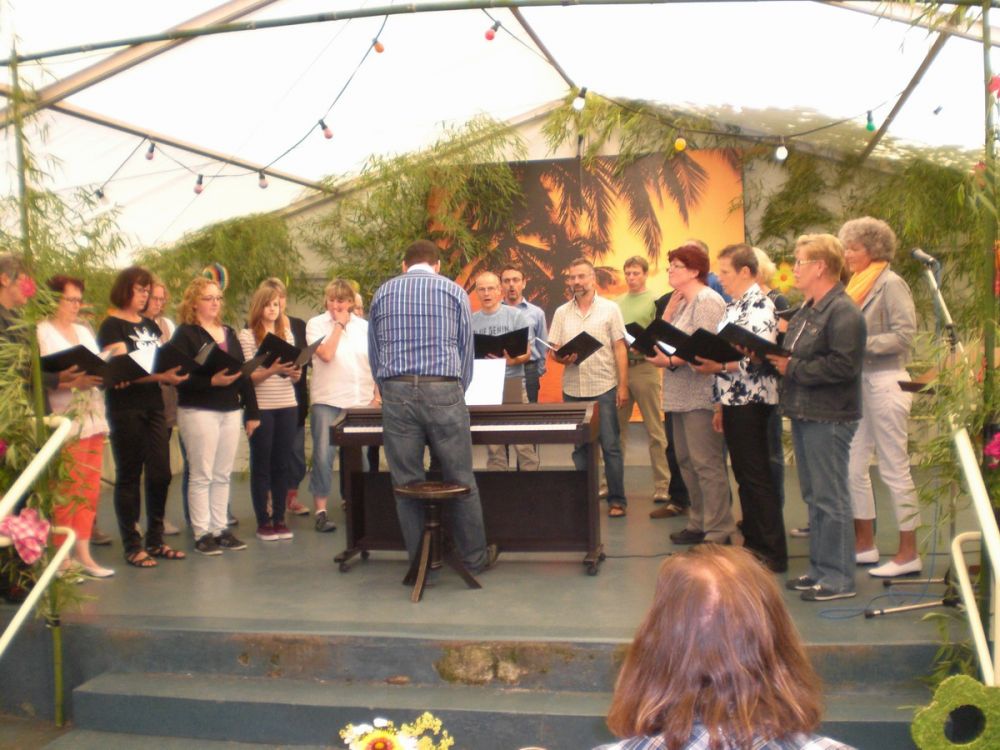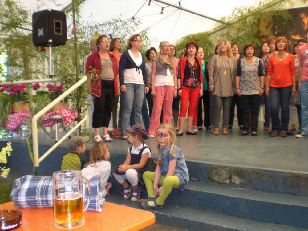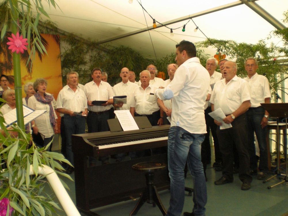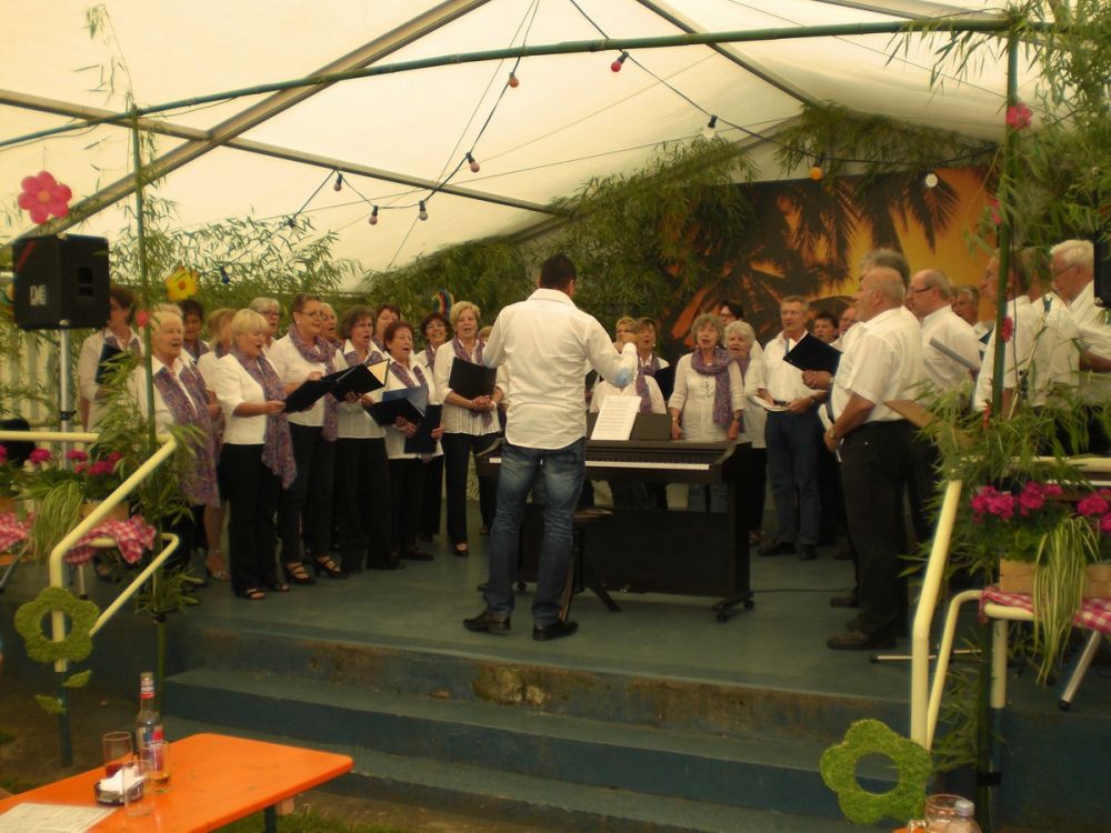 Der „Coro Minuetto“ unseres Brudervereins Sängerbund Linkenheim, geleitet von Thomas Kästner, beeindruckte unter anderem mit „Übern See“ von Maierhofer und der „Bohemian Rhapsody“ von Queen. Für gute Laune sorgte Uli Kofler, Pianist und Entertainer mit Leib und Seele, mit seiner „Modern Harmony“ aus Neuburg in der Pfalz. „Sommer“ von den Wise Guys und „Haus am See“ von Peter Fox, bekamen stürmischen Beifall, bei „Lady in black“ von Uriah Heep sang das ganze Zelt Background.