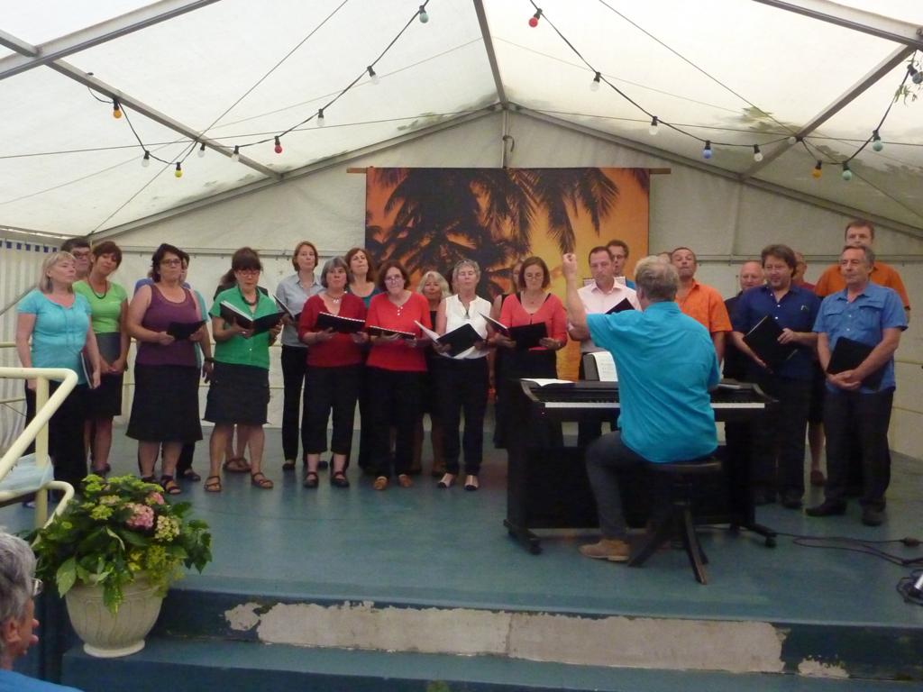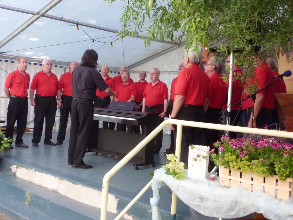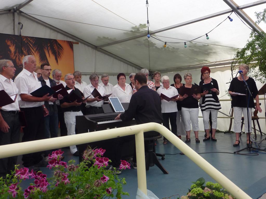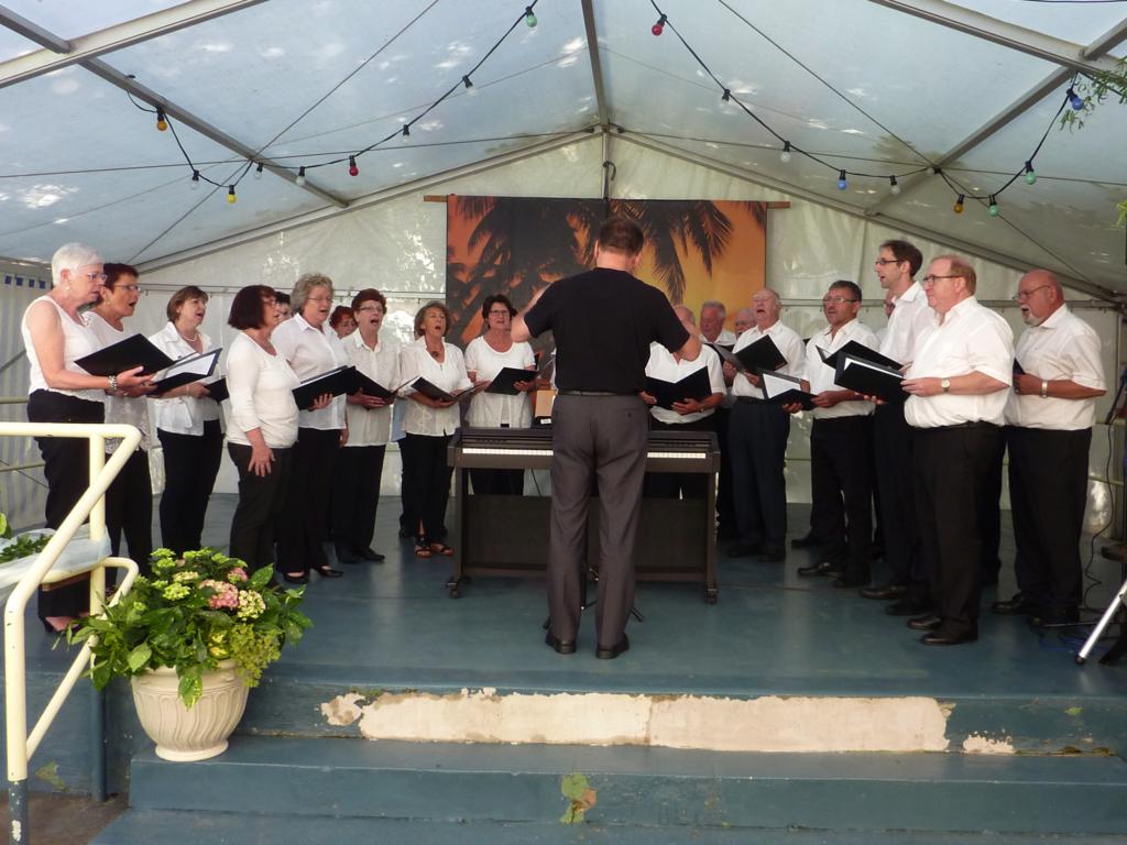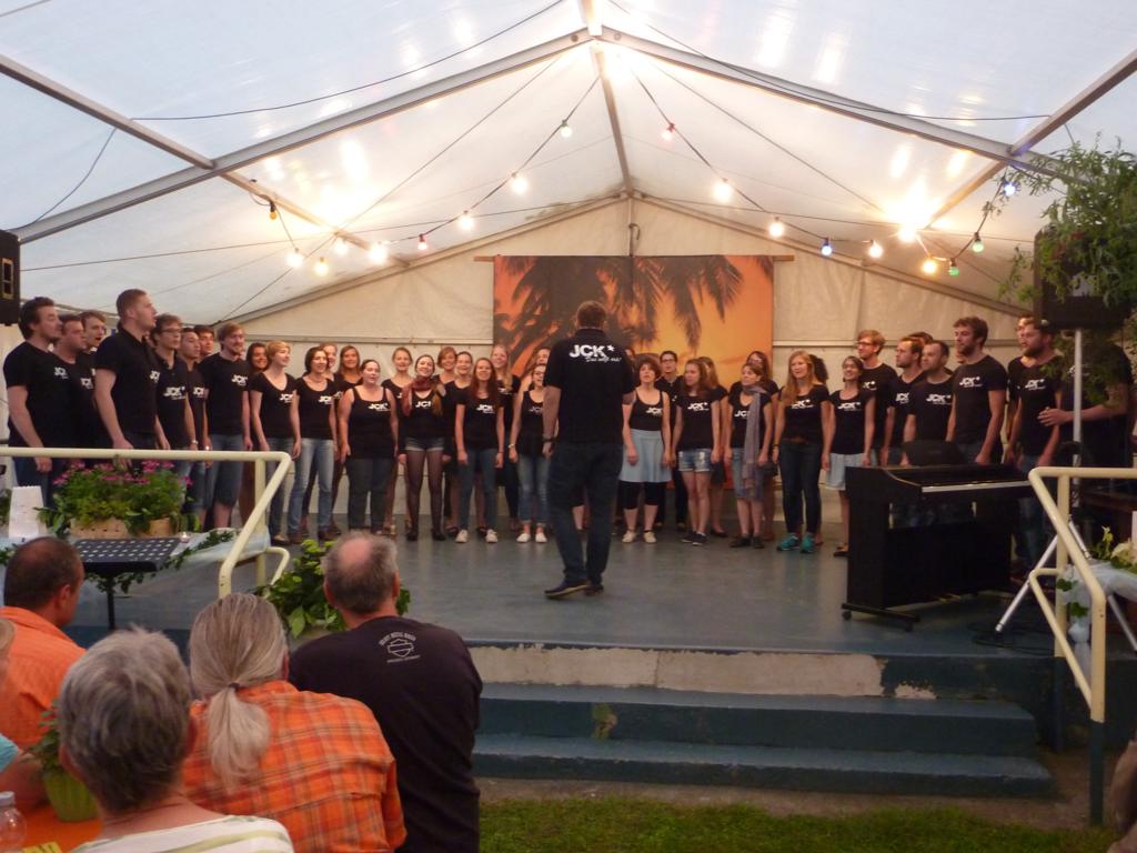 Am Sonntagabend war Einsingen unseres Chores im schönen Garten von Vreni und Norbert, danke für die Erfrischung. So vorbereitet eröffneten wir um 18.00 Uhr mit drei Liedern den "Abend der modernen Chöre". Maika Torge übernahm hier in bester Manier, mit musikalischen Anekdoten und Fragen zu traditionellem Liedgut an die jungen Chöre, die Moderation - super, danke Maika! Mit den Chören "da Capo" (Liederkranz Graben), "die Vocaleras" (Frauenchor aus Karlsruhe), Mikadochor (Nordstadt Karlsruhe), "Klinikchor" (Städtisches Klinikum Karlsruhe) "Gsang for fun" (Sängerbund/Liederkranz Heidelsheim), "Coro minuetto" (Sängerbund Linkenheim)und "JCK-das setzt sich" (KIT Campus Süd) hatten wir ein Programm, das viele Herzen höher schlugen ließ. Jeder Chor präsentierte sich wunderbar auf seine Weise und man konnte die Bandbreite der modernen Chormusik erahnen. Das war wirklich ein Highlight unseres Festes!