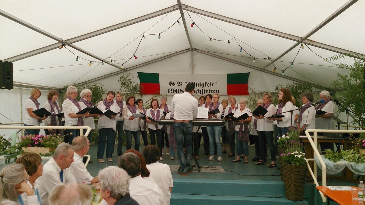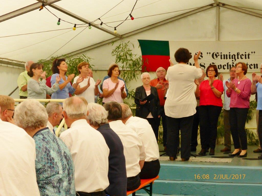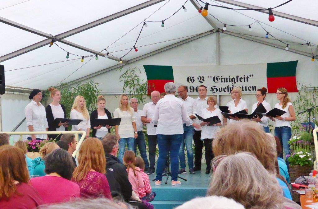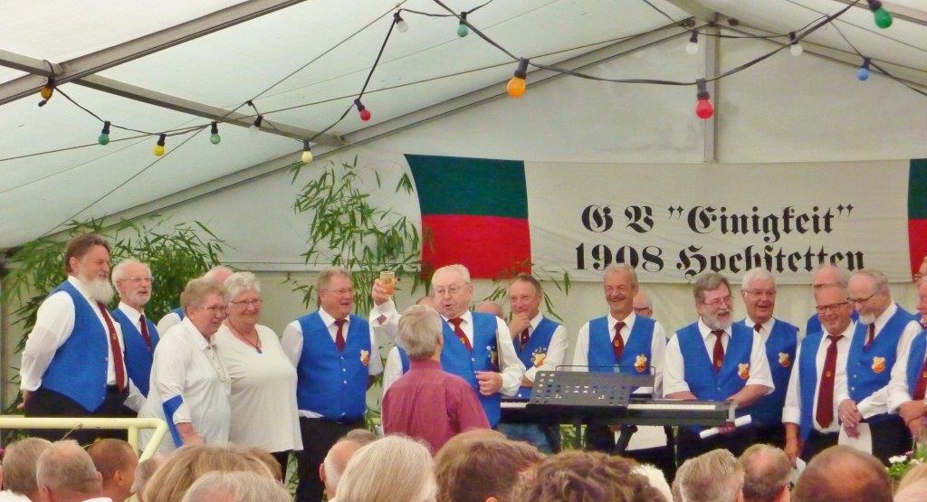 Samstags vor dem Fest liefen die Vorbereitungen im Erlich auf Hochtouren für unser Sommerfest. Am Sonntagmorgen um 10.00 Uhr begann der musikalische Frühschoppen und unser Chor eröffnete den Reigen mit drei Liedern, bevor unser 1.Vorsitzender Klaus Reinhardt die anwesenden Gäste begrüßte. Es folgten der Männerchor (mit Frauen) der Eintracht Graben, der Frauenchor des Sängerbundes Friedrichstal, der Männerchor der Sängervereinigung Liedolsheim und der gemischte Chor der Eintracht Neuburg, letzterer unter der Leitung von Uli Kofler. Rainer Ritz moderierte am Morgen wieder mit Witz und Schlagfertigkeit durchs Programm und erklärte, wir hätten Uli Kofler das Duppenglas in unserem Bestand zu verdanken. Uli Kofler erzählte dann auch von seinem letzten Besuch beim Hochstetter Sängerfest, welches für ihn auf dem Heimweg schmerzlich endete. Nun war er jedoch wieder absolut da und testete das Publikum mit „Kein schöner Land“ auf seine Textsicherheit. Das klappte ganz gut und das morgendliche Programm stimmte mit den verschiedenen, sehr gelungenen Liedvorträgen der Chöre auf einen schönen Tag ein.