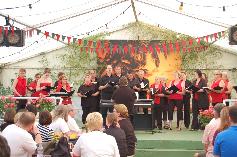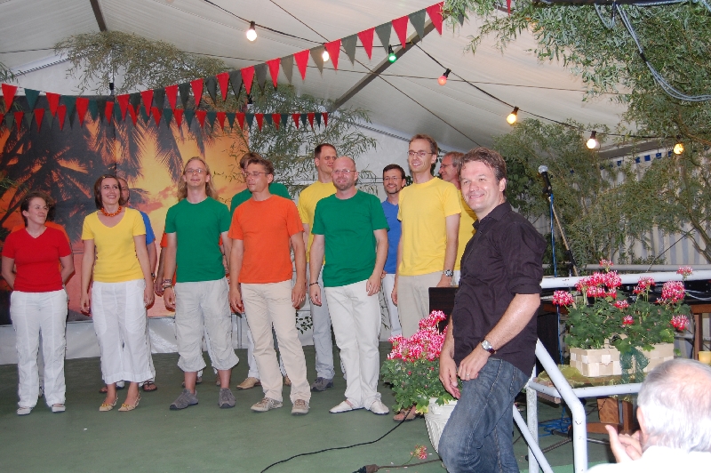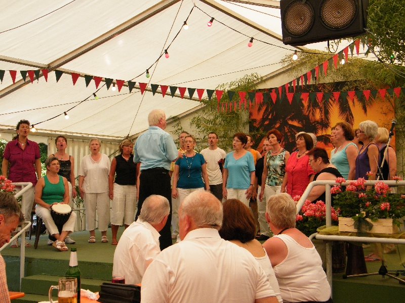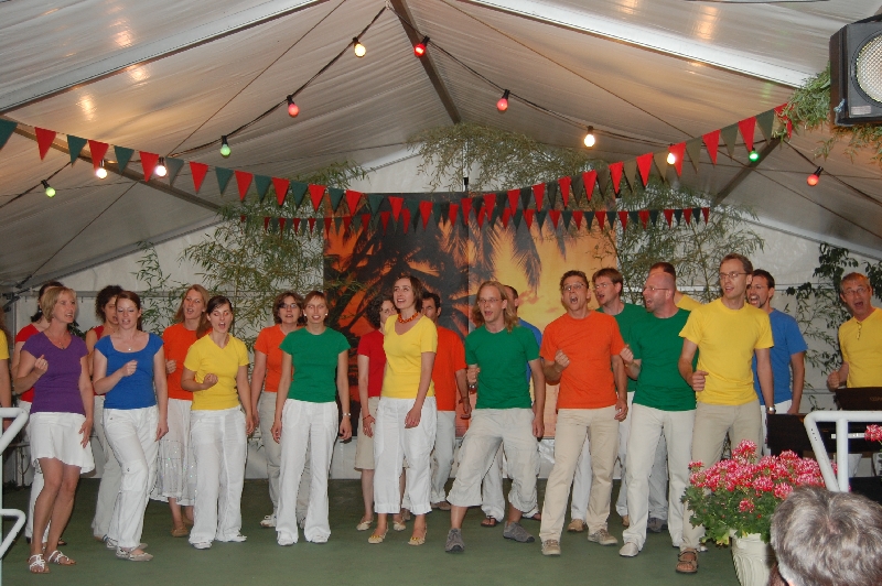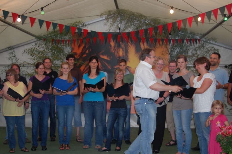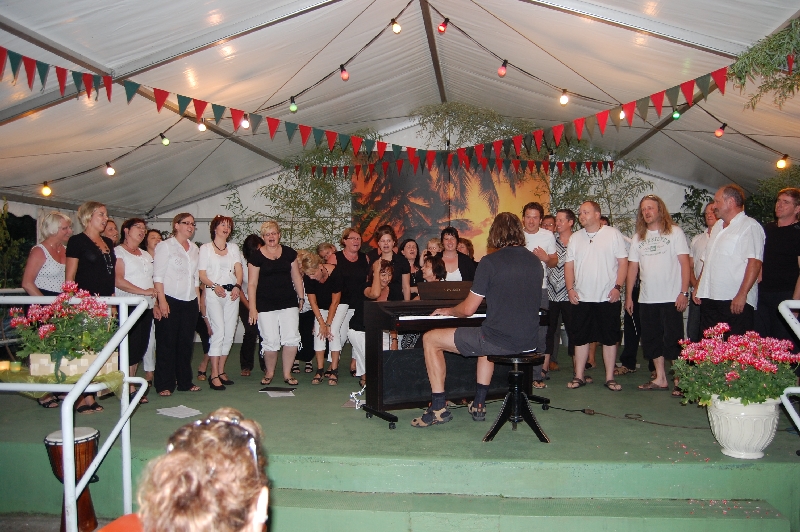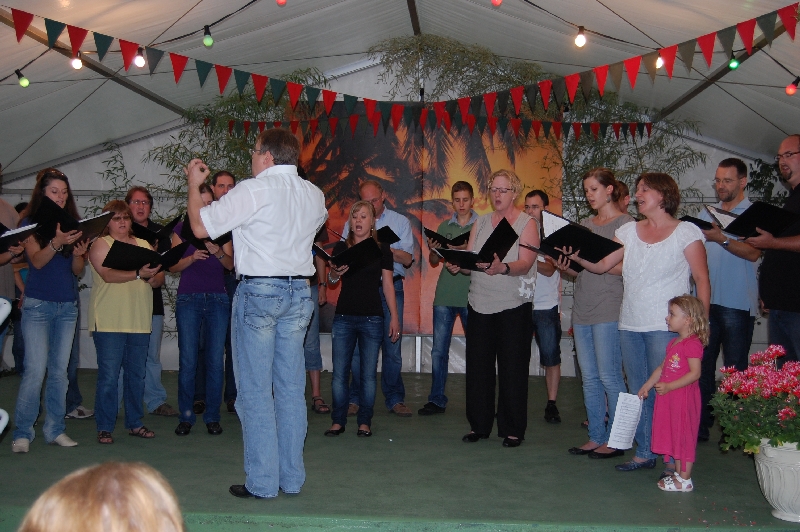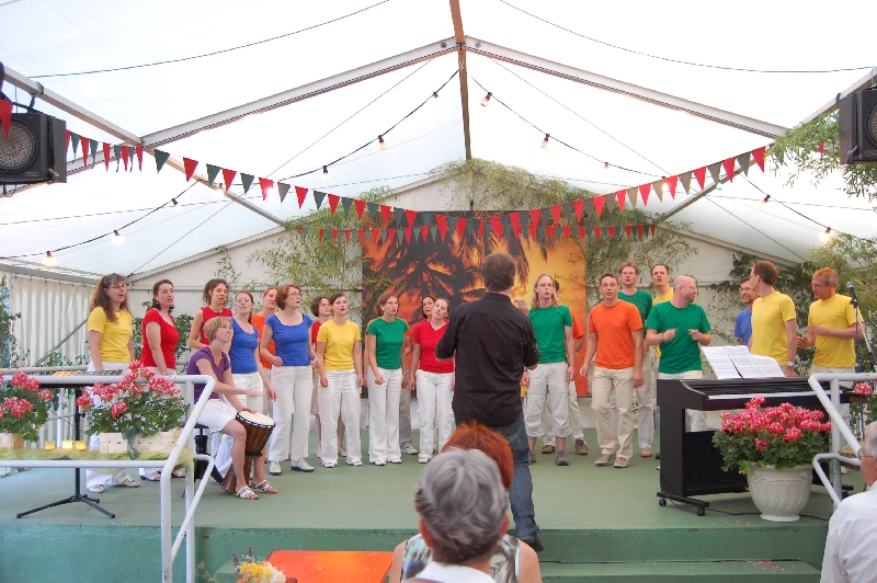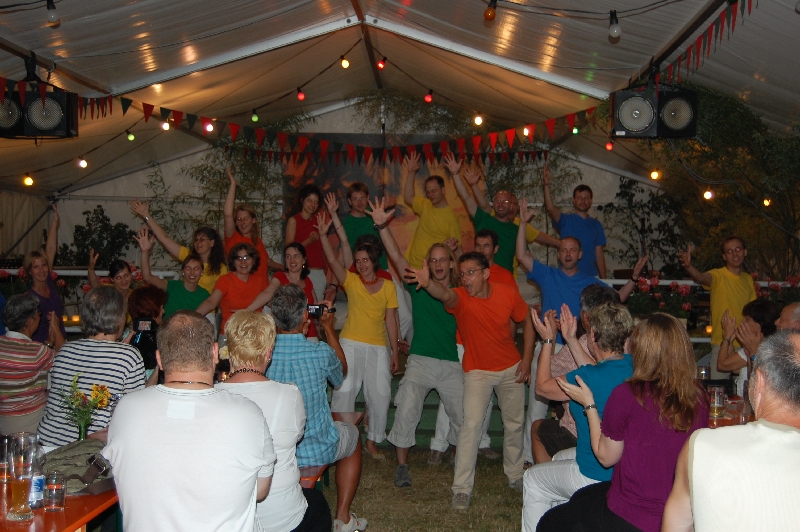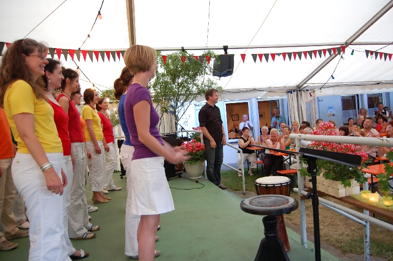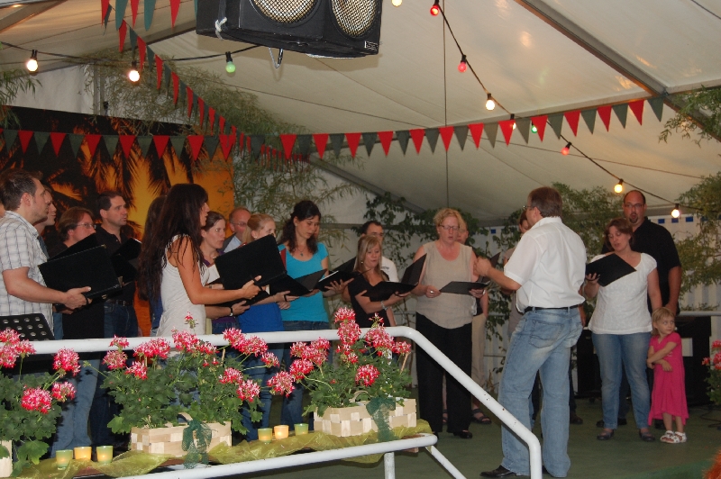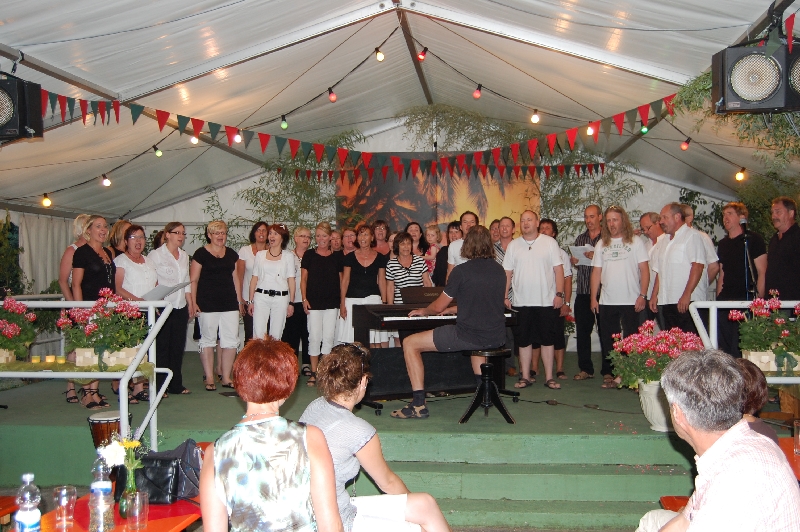 Zum „Abend der modernen Chormusik“ waren sieben Gastchöre angemeldet. Vorsorglich hatten wir ein größeres Zelt als letztes Jahr aufgestellt, trotzdem mussten die Seitenwände geöffnet und Tische und Bänke im Freien aufgestellt werden. Die Chorgruppe „In´takt“ als Gastgeber eröffnete den Abend mit drei Liedern. Zur Freude der Trommelcombo wurde wieder einmal getrommelt und passend zur WM die südafrikanische Nationalhymne gesungen.