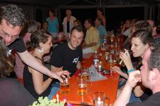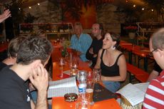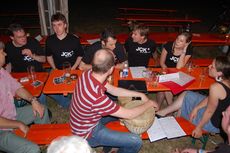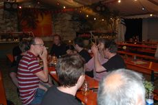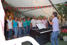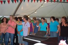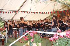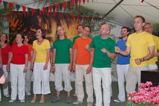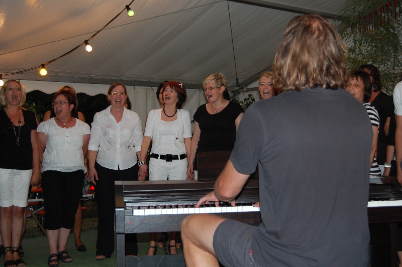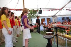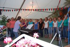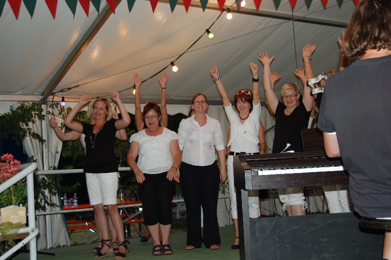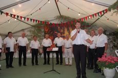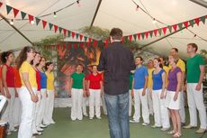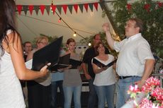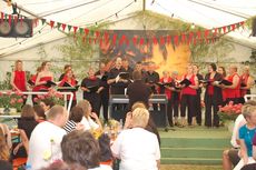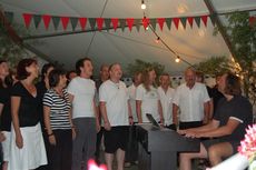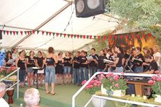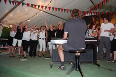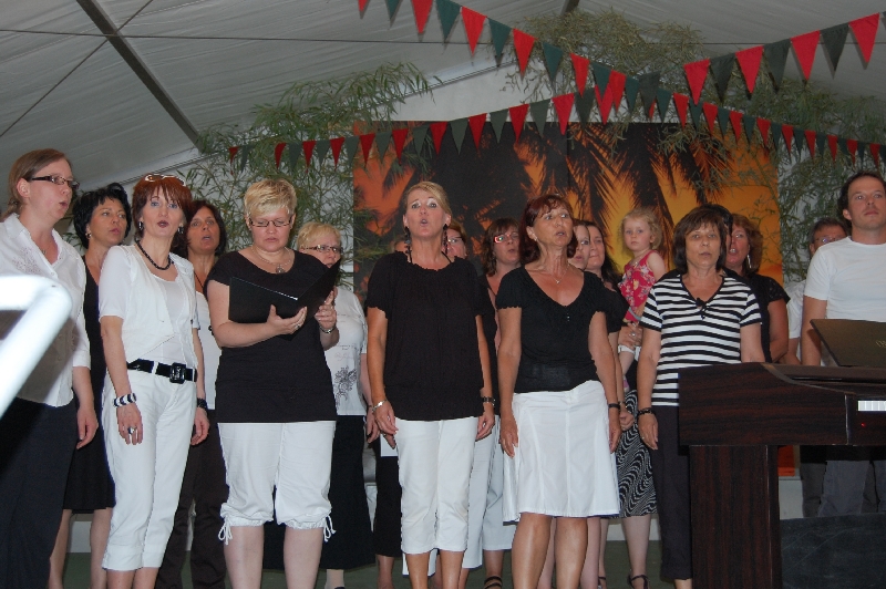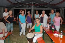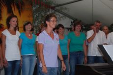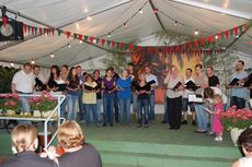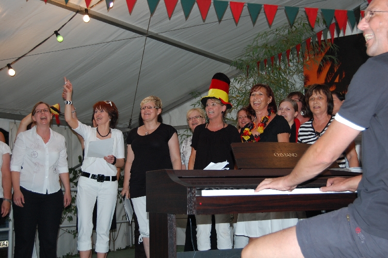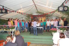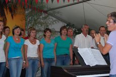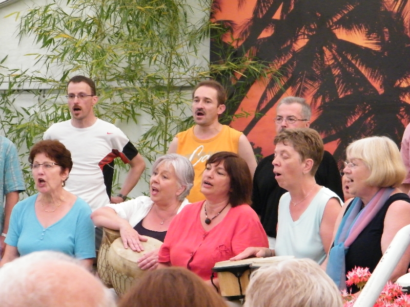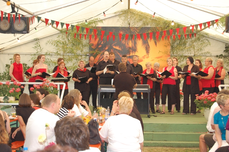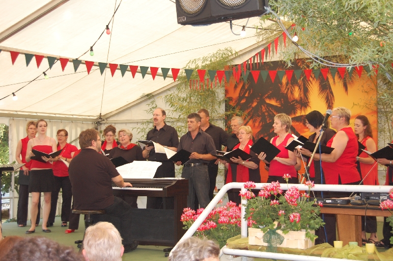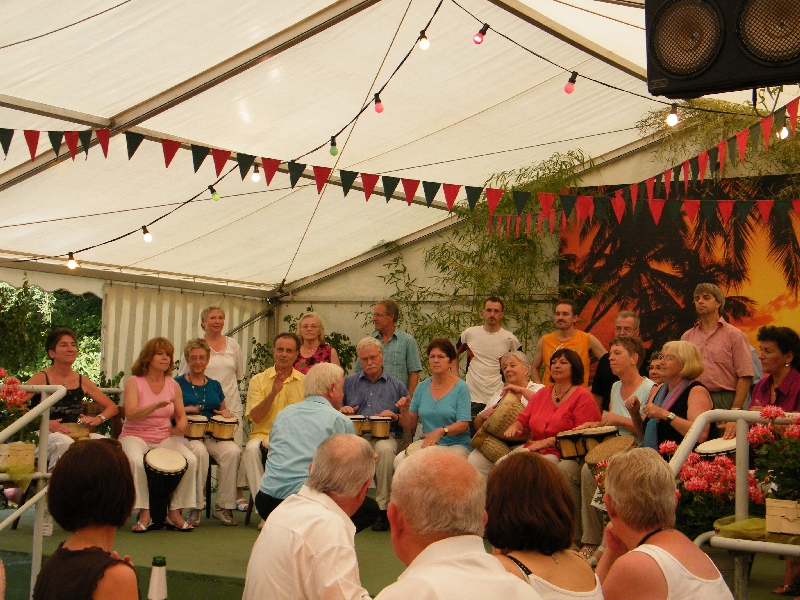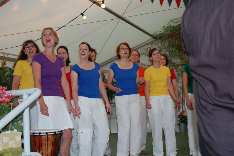 Zum „Abend der modernen Chormusik“ waren sieben Gastchöre angemeldet. Vorsorglich hatten wir ein größeres Zelt als letztes Jahr aufgestellt, trotzdem mussten die Seitenwände geöffnet und Tische und Bänke im Freien aufgestellt werden. Die Chorgruppe „In´takt“ als Gastgeber eröffnete den Abend mit drei Liedern. Zur Freude der Trommelcombo wurde wieder einmal getrommelt und passend zur WM die südafrikanische Nationalhymne gesungen.