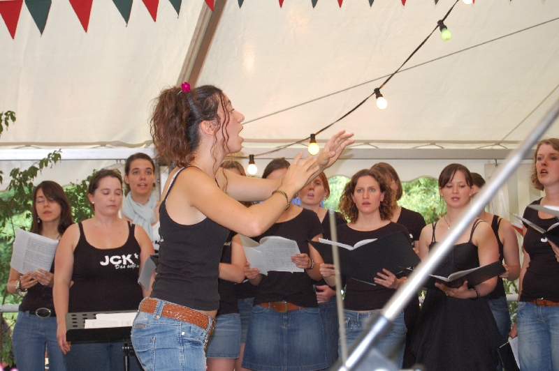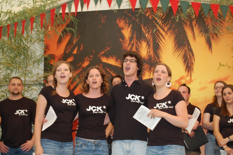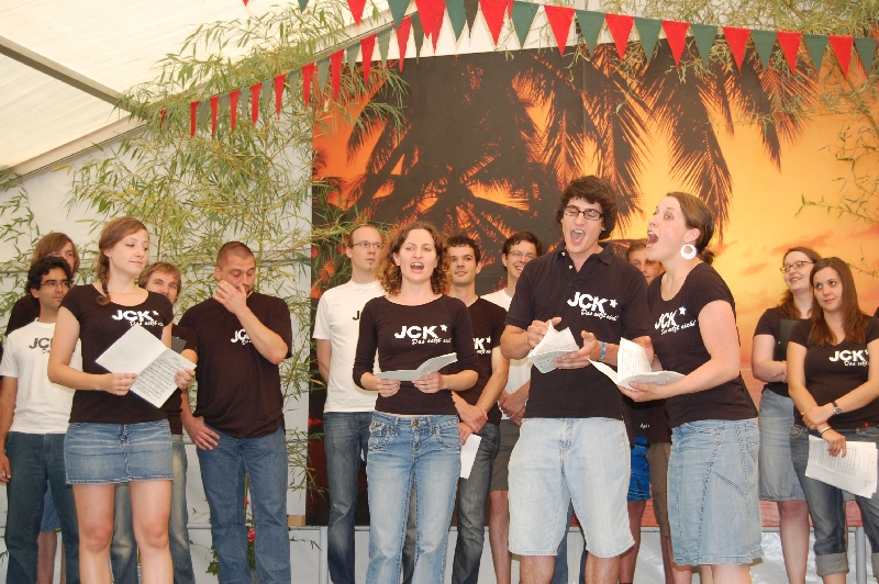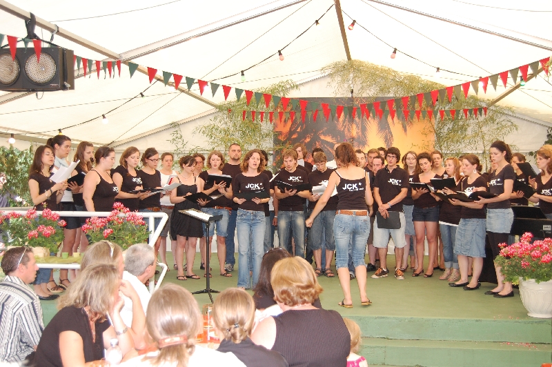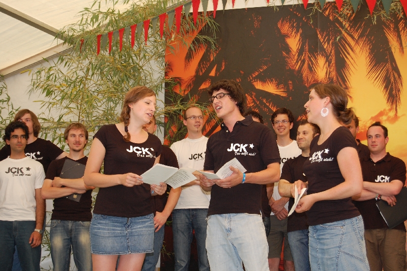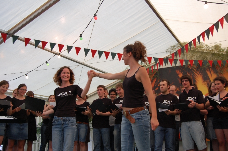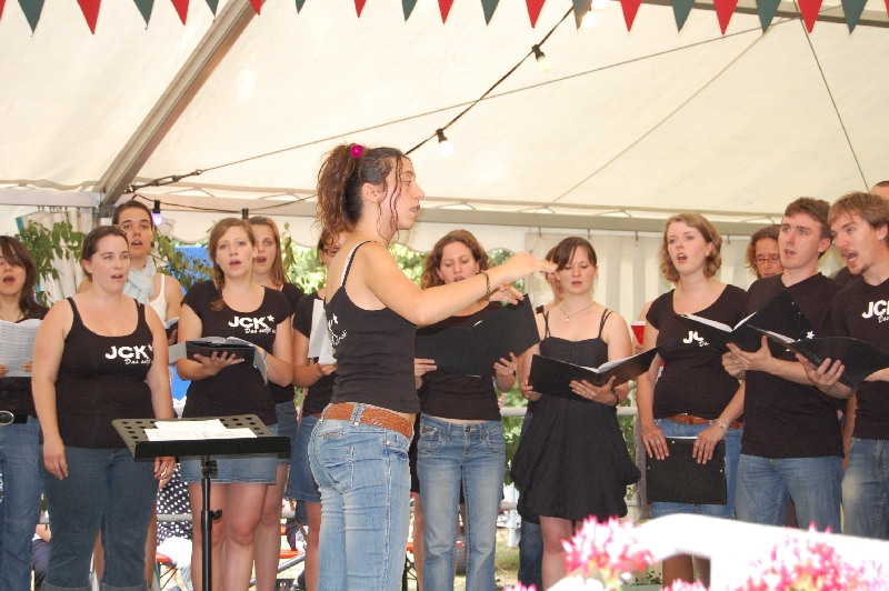 Die junge Chorleiterin Virginie Auvrai wurde in Paris geboren, studierte Chor- und Orchesterleitung und trat schon während ihres Studiums mit professionellen Orchestern auf, die Philharmonie Baden-Baden und das Kurpfälzische und das Stuttgarter Kammerorchester gehören dazu. An der Staatlichen Hochschule für Musik Karlsruhe machte sie vor kurzem ihren Master. Diese hohe Qualifikation paart Virginie mit ihrem französischen Charme und man spürt die Begeisterung, mit der sie diesen Chor seit drei Jahren dirigiert. Unter ihrer Leitung zeigte der JCK mit einer ganzen Reihe von Beiträgen sein großes Potenzial. Eine Gruppe von drei Damen und einem Herrn sang sich in die Herzen der Zuhörer. Nebenbei wurde noch auf das Konzert des JCK im Studentenhaus des KIT am 18.07.2010 hingewiesen.