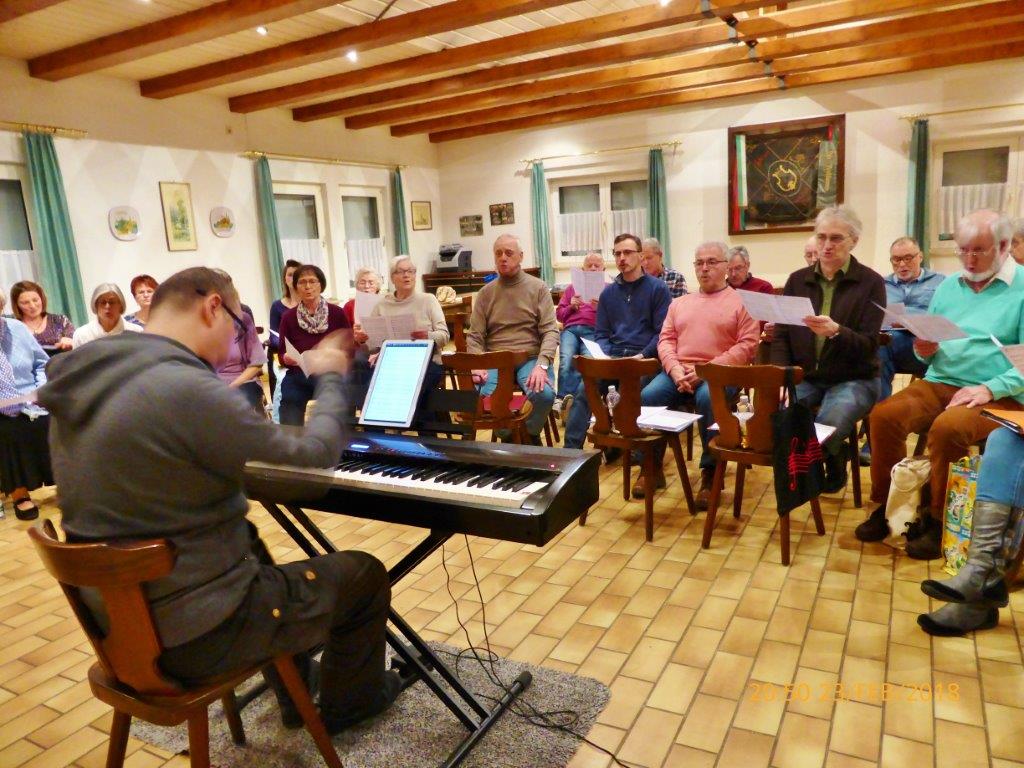 ...welch einen Zustrom unser Chorprojekt am 11. März erfahren hat - wir sind begeistert. Viele waren unserem Aufruf gefolgt und auch unser Dirigent hatte maßgeblichen Anteil, dass sich über 30 Sängerinnen und Sänger für unseren Projektchor einfanden. Da lachte Aldos Dirigentenherz, auch über sein neues Klavier und diese Stimmung übertrug sich auf die Chorprobe, die mit viel Spaß und Freude absolviert wurde. Alle folgten mit höchster Aufmerksamkeit den Erklärungen und Tipps des Chorleiters und Schritt für Schritt wurden zwei der drei Konzertlieder zu üben begonnen. Es hat schon sehr gut geklappt, was auch unseren anwesenden Sängerfreundinnen und -freunden aus Spöck und Friedrichstal zu verdanken war. Die beiden Vereine werden auch von Aldo Martinez dirigiert und er hat dort für uns die Werbetrommel gerührt. Das ist ihm offensichtlich gelungen, aber auch viele Interessierte aus Linkenheim-Hochstetten kamen zu uns ins Vereinsheim. Ist dies doch die Möglichkeit, unseren Verein kennenzulernen und uns einfach nur bei unserem Konzert zu verstärken, oder bei Sympathie auch regelmäßig freitags zur Chorprobe zu kommen, mit Begeisterung daran teilzunehmen und danach mit guter Laune ins Wochenende zu starten. Diese Option ist mit unserem Chorleiter garantiert und wer jetzt doch auch Lust zum Singen bekommen hat, kann gerne am 2. Termin,