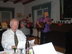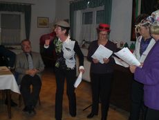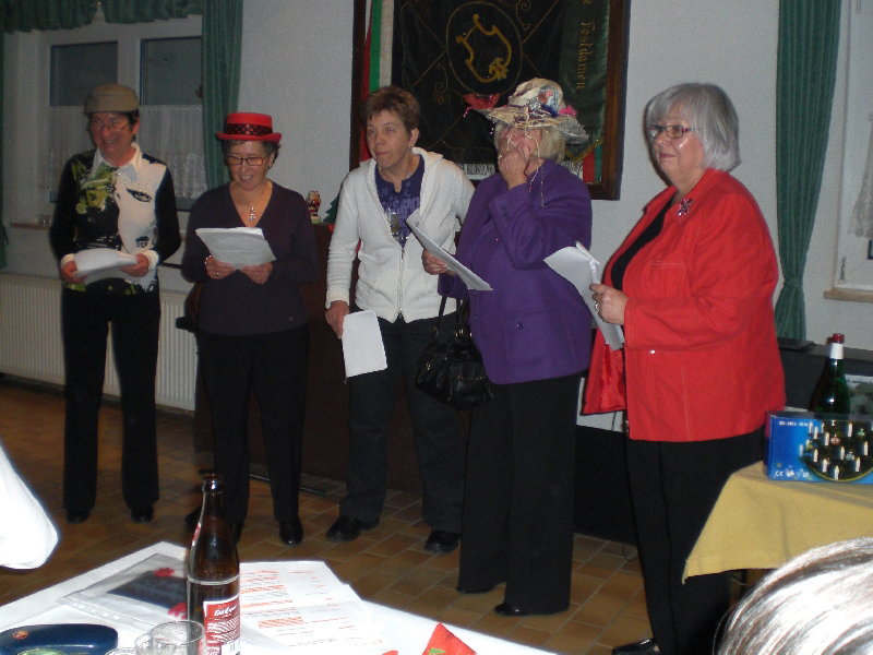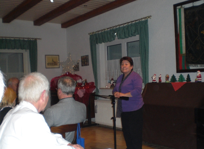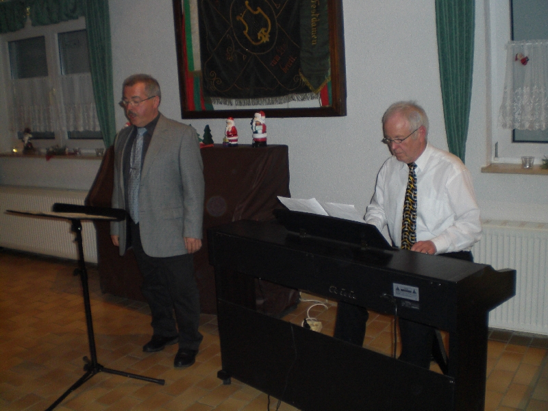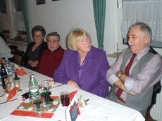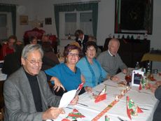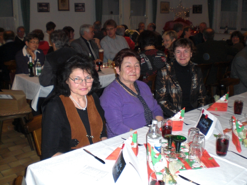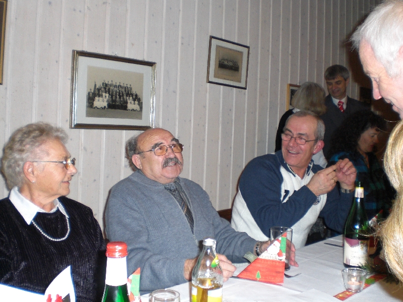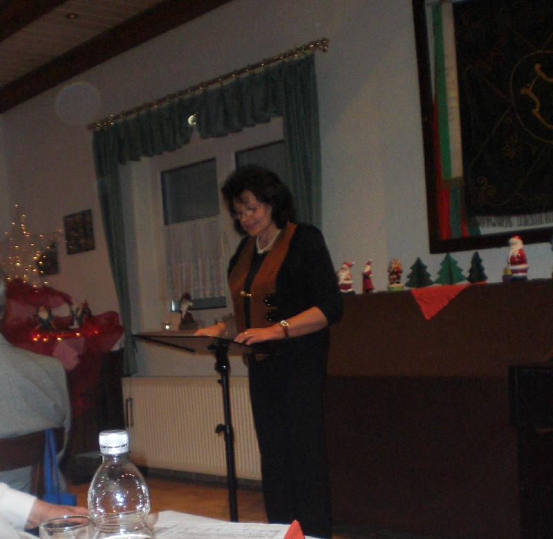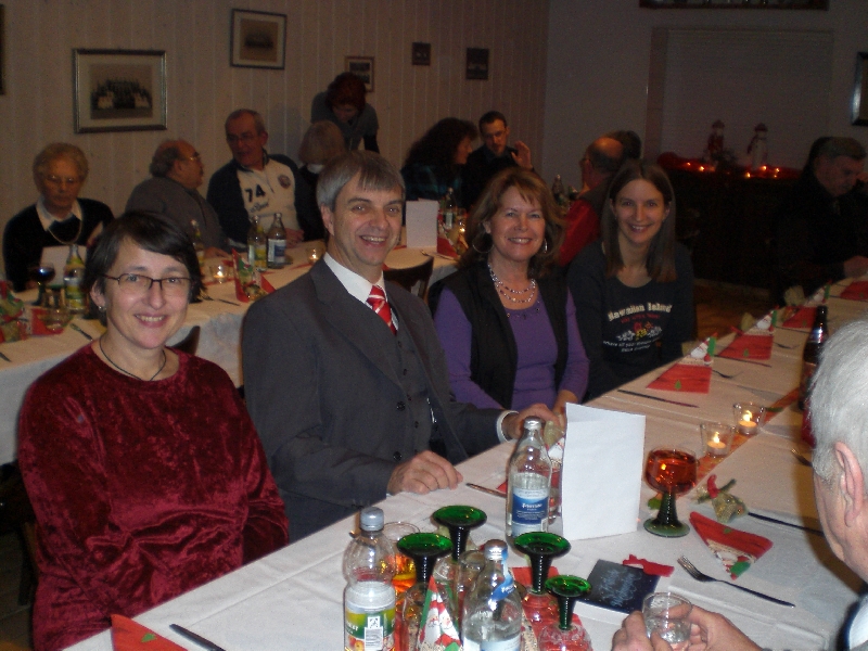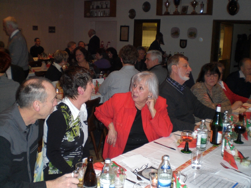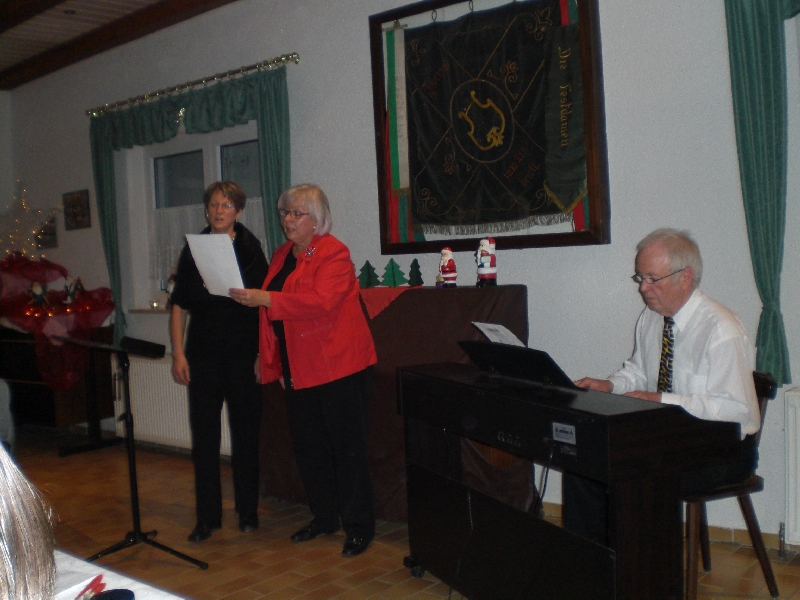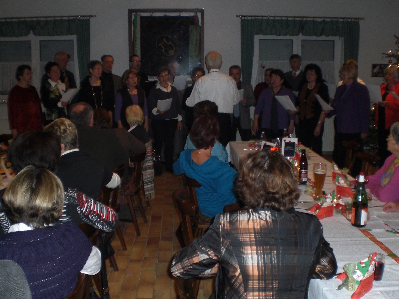 Unser Vorsitzender Klaus Reinhardt begrüßte die erschienenen Ehrenmitglieder und Mitglieder mit Partnern im festlichen geschmückten Sängerheim. Gemischter Chor und Chorgruppe In´takt stimmten mit klangvollen Weihnachtsliedern auf den Abend ein, zwischen den Liedvorträgen konnte man sich am Büffet bedienen und gemeinsam zu Abend essen. Die wohlschmeckenden Hauptspeisen hatte uns ein örtlicher Wirt geliefert, Salate und Desserts hatten die Sängerinnen in reichhaltiger Auswahl mitgebracht. Nach dem Essen unterhielten einige freiwillige Akteure die Gäste abwechselnd mit Geschichten, Liedvorträgen und Gedichten, der bewährte Moderator Rainer Ritz verband die Auftritte mit passenden humorigen Ansagen. Er selbst brachte auch ein heimeliges Lied zu Gehör und regte mit einer besinnlichen Geschichte zum Nachdenken an. Die lustigste Geschichte erzählte Christiane Wittstock mit: „Weiße Weihnachten“, erst herbeigesehnt entwickelte sich die weiße Pracht schließlich zum Albtraum. Reinhilde Fürniß hatte ein Rätsel vorbereitet, das es zu knacken galt, die schnellsten Ratefüchse konnten sich einen Preis aussuchen. Damit die Gäste auch aktiv am Programm teilnehmen konnten, stimmte Reinhilde mit der Gitarre beliebte Weihnachtslieder an, Dirigent Hans Vogt genoss die Entlastung und sang gerne mit. Er hatte vorher die Liedvorträge am E-Piano begleitet. Der lustigste Teil des Abends und mit Spannung erwartet, war eine Kombination aus zwei Sketchen. Im ersten Sketch bewies Christel Wagner ihre Zungenfertigkeit in einem ganz und gar ungewöhnlichen Verkaufsgespräch mit Reinhilde Fürniß, die Silbenverdreher forderten viel Grips. Beim zweiten Sketch, der besonders gut ankam, wirkten noch Silvia Kühn, Verena Dietrich, Sieglinde Meinzer und Christa Jung-Wittiger mit. Wie im richtigen Leben wurde aus einer vagen Vermutung ein Gerücht das immer schlimmere Formen annahm und sich schließlich in Wohlgefallen auflöste. Bei Kaffee, Kuchen und Weihnachtsgebäck unterhielt man sich noch angeregt und ließ den schönen Abend ausklingen.