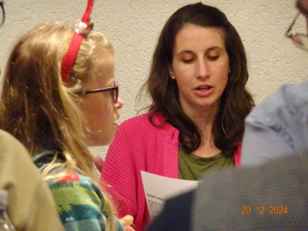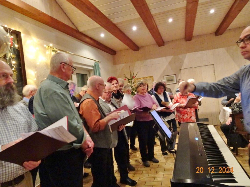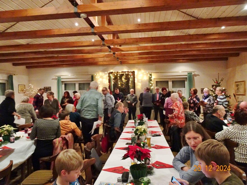 Unsere Weihnachtsfeier fand am 20. Dezember im richtig schön geschmückten Vereinsheim statt und war sehr gut besucht. Aldo Martinez traf mit Frau und Sohn pünktlich im Erlich ein und wir begannen den festlichen Abend mit vier Weihnachtsliedern, die wir gekonnt absolvierten. Der 1. Vorsitzende Klaus Reinhardt begrüßte freudig alle Anwesenden und eröffnete danach das Buffet. Ein Partyservice hatte uns die warmen Speisen geliefert und von den Sängerinnen wurden wieder tolle Salate und Desserts beigesteuert. Nach dem Essen eröffnete Klaus Eichsteller mit einem Hirtenlied und einer Wintermärchen-Liebesballade auf seinem Keyboard das Unterhaltungsprogramm, durch das uns unser Sänger Hartmut auf lockere Art führte. Reinhilde Fürniß trug zuerst ein Gedicht vor, bevor sie uns dann mit ihrer Gitarre ein Lied über die weiße Weihnacht spielte und sang – gut gemacht Reinhilde. Christa Jung-Wittiger las ein Gedicht über eine freche Weihnachtsmaus vor, die wohl über Tage für den Schwund der Weihnachtsbrödlen verantwortlich war. Das gefiel besonders den anwesenden Kindern, die dabei sein und mit uns feiern durften. Hannelore Dürr´s Engelsgedicht zeigte einige Erkenntnisse auf, die uns zwar bewusst, aber leider doch oft nicht umgesetzt werden. Das regte zum Nachdenken an, bevor wir uns dem reich bestückten Dessertbuffet widmen durften, mmhm, lecker!! Es ging uns gut an diesem Abend, auch dank unserer Küchenfeen Alexandra und Heidi, sowie Marion, die uns mit Getränken versorgte, so ließ es sich bestens aushalten. Nach diesen Schlemmereien war es an der Zeit, unserem Dirigenten ein Präsent zu überreichen. Klaus Reinhardt tat dies mit einigen Dankesworten an Aldo Martinez, mit dem das Üben in der Chorprobe Woche für Woche riesigen Spaß macht. Wer dies auch mal testen möchte, kann gerne freitags in den Erlich kommen. Zu Klaus Reinhardt`s Überraschung erhielt auch er eine Weihnachtstüte, als kleine Anerkennung für seine Arbeit als 1. Vorsitzender, die er das ganze Jahr über leistet. Ein Dank auch für den wunderschön geschmückten Weihnachtsbaum, den uns Klaus jedes Jahr für unsere Feier im Erlich zur Verfügung stellt.