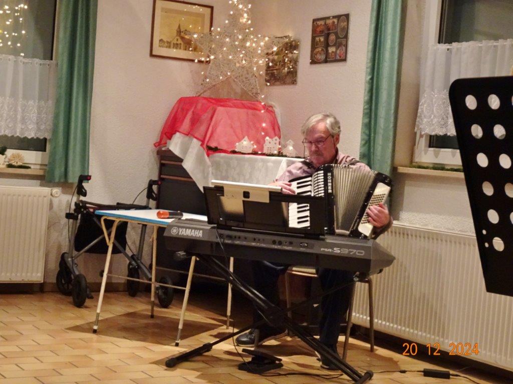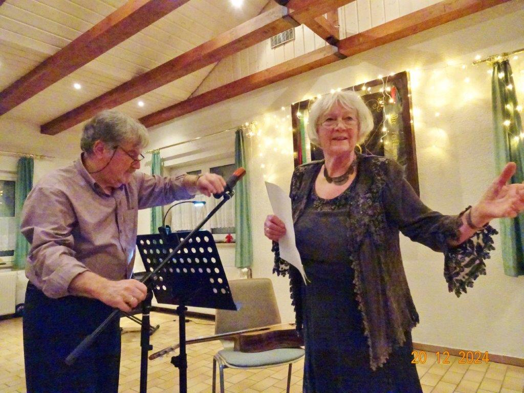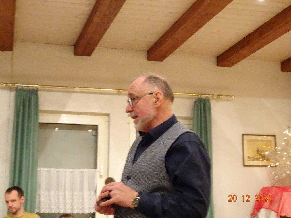 Hartmut führte uns nun wieder souverän durch den 2. Teil unserer Feier, bei dem uns Commander Klaus Eichsteller, bzw. Mc. Beth in seinem Raumschiff Entenfang durch die Galaxien führte und letztendlich mit Leonard Cohens Hallelujah in den Stall des Jesuskindes und dem Sinn der Weihnacht entführte. Brigitte Lang wusste uns eine lustige Geschichte vom doppelten Santa Claus zu erzählen und Klaus Reinhardt hatte eine Geschichte über „Selbstverständlichkeiten“ mitgebracht, wie wahr, dass doch vieles als selbstverständlich betrachtet wird und einem dies erst bewusst wird, wenn man es verloren hat, oder es mit den Augen eines Kindes betrachten kann. Zum Schluss des Programms spielte Klaus Eichsteller das schöne irische Weihnachtslied Fairytale of New York und gemeinsam sangen wir noch einige Weihnachtslieder, bevor dieser schöne Abend langsam zu Ende ging. Ein großes Danke hier wieder an Klaus Eichsteller, der mit seinen musikalischen und anderen Beiträgen einen Großteil des Programms gestaltete und natürlich an Hartmut, der einen guten Conferencier abgab, ebenso allen anderen, die sich am Programm beteiligten. Zudem an alle, die den Erlich so toll gerichtet, dekoriert und hinterher wieder aufgeräumt haben, Ute für die Blumendeko und allen, die für unser leibliches Wohl Leckeres zubereitet hatten. Ihr habt uns allen ein schönes Fest beschert – herzlichen Dank.