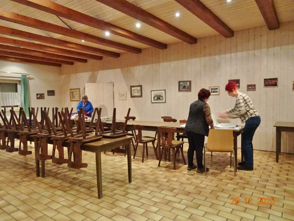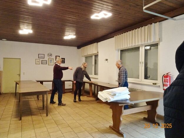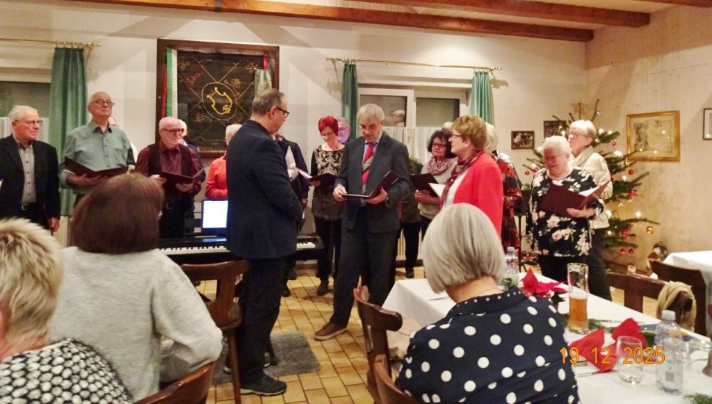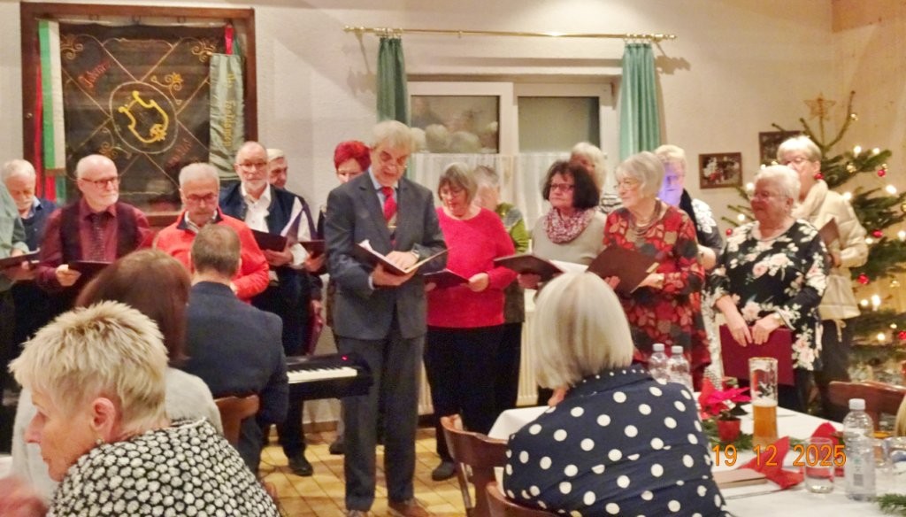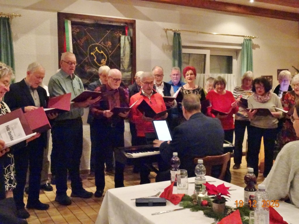 Am Tag zuvor fanden sich ein paar fleißige Helferinnen und Helfer ein, um Tische zu stellen für die Weihnachtsfeier und zum anschließenden Dekorieren. Dekomaterial vor Ort ist genügend vorhanden, da ist so mancher Schatz dabei und es wurde die Saal- und Tischdeko liebevoll zusammengestellt. Ergänzt mit Blumenstöckchen und Tannengrün ergab das ein schönes Bild für die Weihnachtsfeier am nächsten Tag. Nach und nach trafen die Besucher im Erlich ein, darunter unser Ehrenbürger Waldemar Schütz und seine Partnerin. Der Partyservice kam auch pünktlich und brachte die ausgewählten und von Klaus Eichsteller bestellten warmen Speisen, danke Klaus. Die Sängerinnen und Sänger trugen mit Salaten und Desserts zum lukullischen Genuss bei.