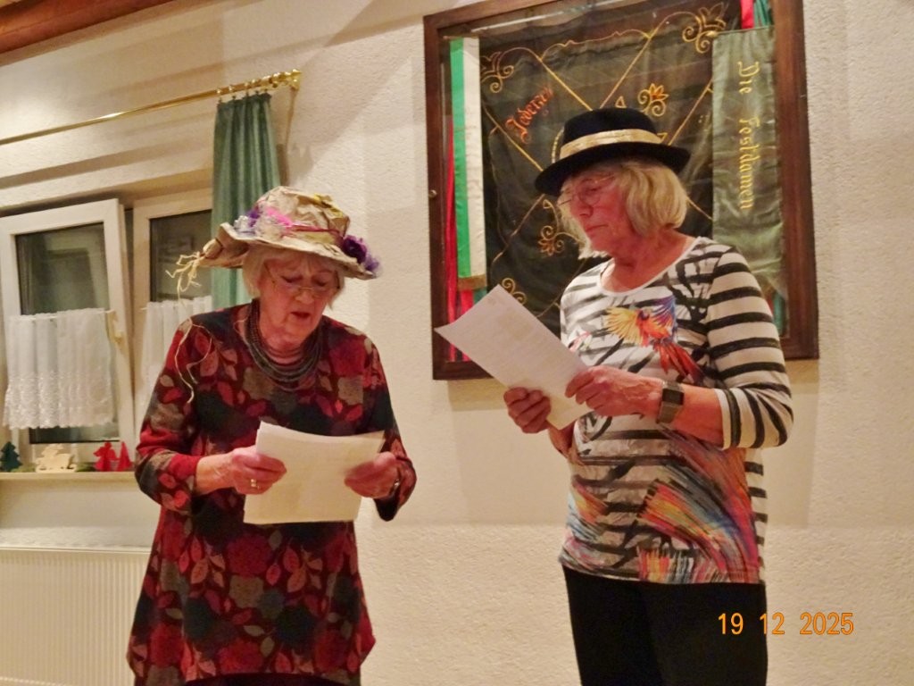 Ein ganz großes Dankeschön an alle Aktiven: die den Saal vorbereitet, geschmückt und am Tag nach der Feier wieder aufgeräumt haben, die uns bei der Feier in Küche und Saal bestens versorgt haben, die uns ein kurzweiliges Programm boten, die Salate und Desserts zubereitet haben, unserer Ute für die Blumenspende, unserem Conferéncier Hartmut, unserem Vorstand Klaus für den schön geschmückten Weihnachtsbaum und natürlich an alle, die da waren um mit uns einen schönen Abend zu verbringen.