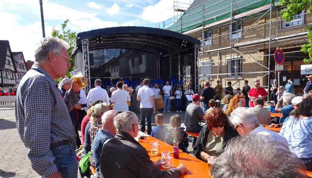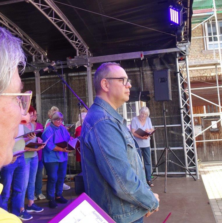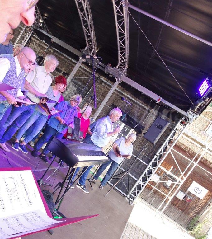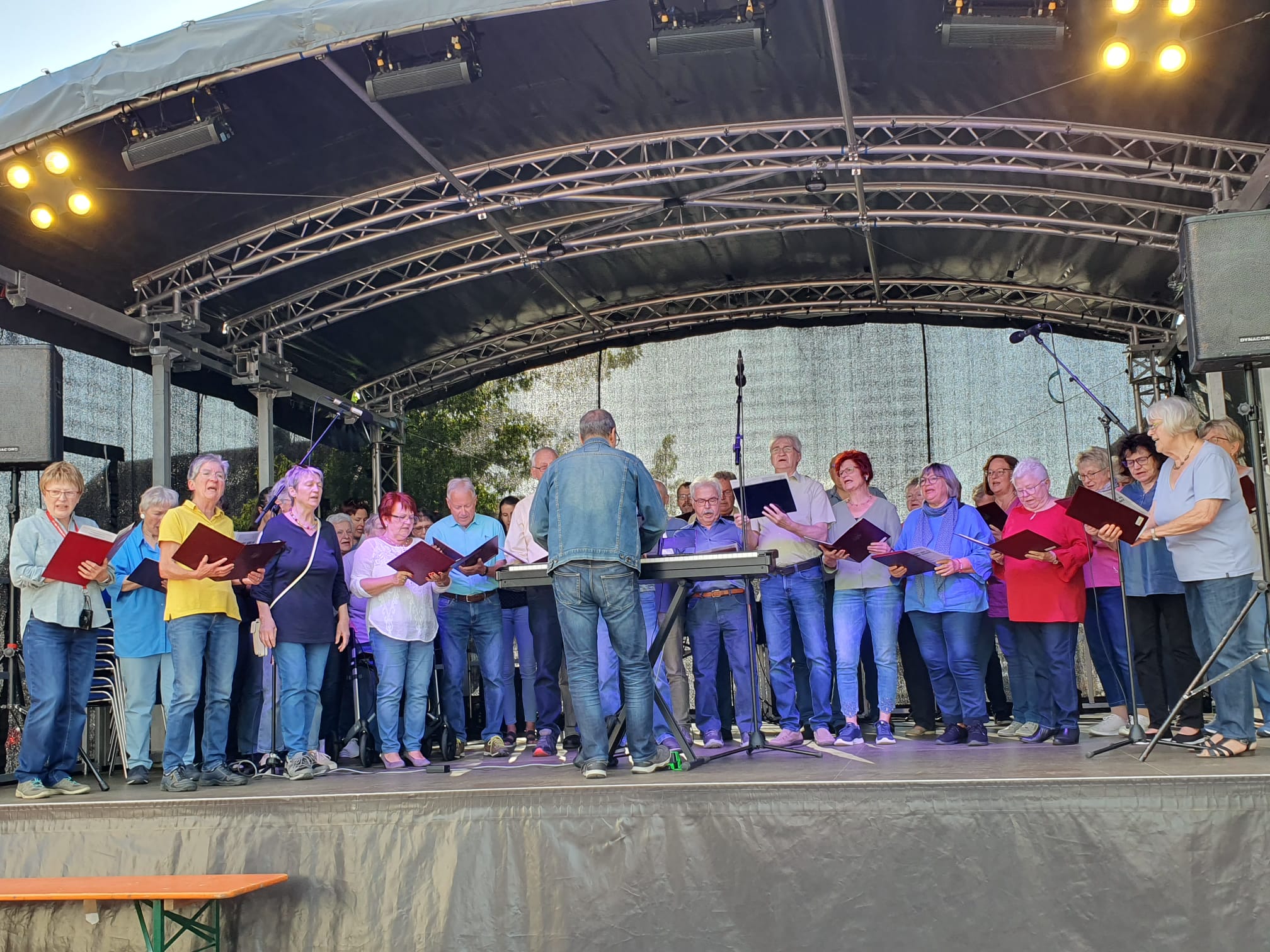 Der Wettergott zögerte morgens noch, aber nachmittags schenkte er uns allen für das Weschbugglfeschd das passende Wetter. Ab 9.30 Uhr hatten schon die Arbeitseinsätze im Erlich und auf dem Weschbugglfeschd-Gelände begonnen. Überall wurde fleißig gewerkelt mit Vorfreude auf die kommenden Besucher. Das letzte Weschbugglfeschd war 2018 und so war auch eine gewisse Aufregung bei den teilnehmenden Vereinen, wie das Fest wohl angenommen wird. Die Eröffnung war um 16.00 Uhr durch den Musikverein Linkenheim-Hochstetten und der Begrüßung unseres Bürgermeisters Michael Möslang und dem Vorsitzenden des Musikvereins Ulrich Radhofer. Es wurde ein toller musikalischer Auftakt des Orchesters unter der Leitung von Thorsten Reinau geboten und dann folgte der Fassanstich durch unseren Bürgermeister, der mit „ozapft is“ den begehrten Bierausschank mit Herrn Radhofer und Herrn Raetsch bewältigte. Ein weiteres Highlight war der Auftritt einer Percussion-Gruppe mit einigen Musikern des MV und einer Musikschule, die uns mit heißen Rhythmen nach Südamerika entführten und zum Mitbewegen animierten, absolut super! Unser Auftritt war kurz vor 19.00 Uhr und wir gingen mit dem Eventchor auf die Bühne. Zuerst sang nur unser Chor die Lieder „Wunder gibt es immer wieder“ und „Eres tu“ und mit dem Eventchor „Über sieben Brücken“, Verlieben, verlorn...“ und als Abschluss „Amigos para siempre“. Dem Publikum vor der Bühne hat´s gefallen und wir bekamen reichlich Applaus.