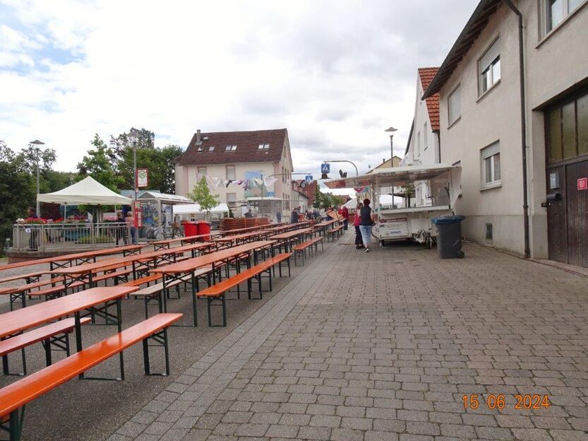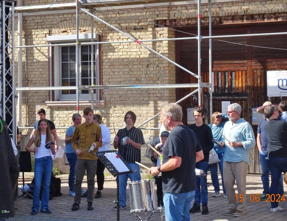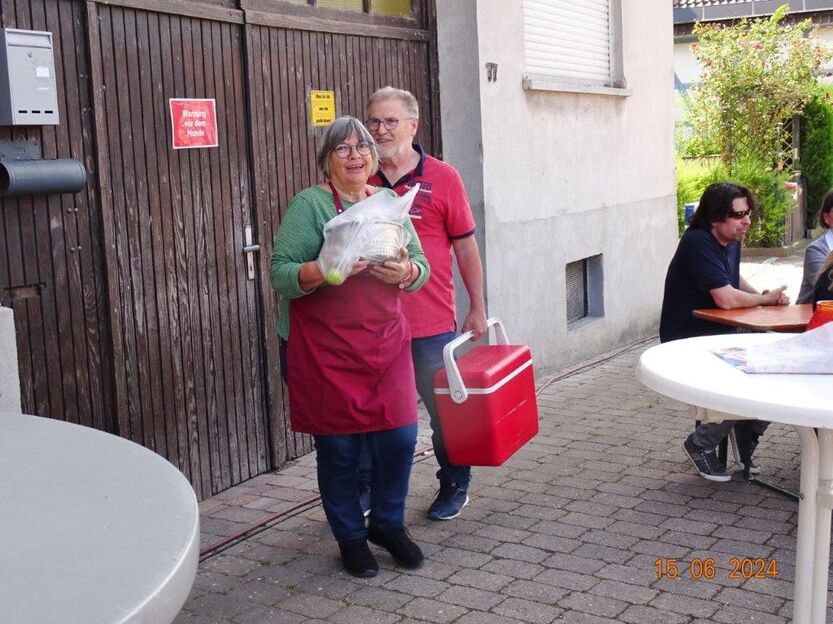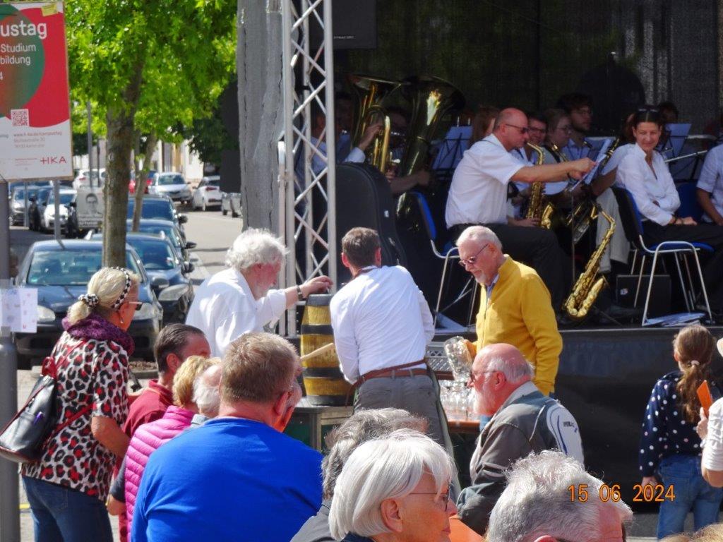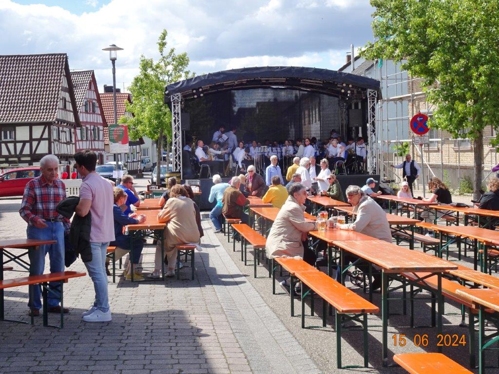 Der Wettergott zögerte morgens noch, aber nachmittags schenkte er uns allen für das Weschbugglfeschd das passende Wetter. Ab 9.30 Uhr hatten schon die Arbeitseinsätze im Erlich und auf dem Weschbugglfeschd-Gelände begonnen. Überall wurde fleißig gewerkelt mit Vorfreude auf die kommenden Besucher. Das letzte Weschbugglfeschd war 2018 und so war auch eine gewisse Aufregung bei den teilnehmenden Vereinen, wie das Fest wohl angenommen wird. Die Eröffnung war um 16.00 Uhr durch den Musikverein Linkenheim-Hochstetten und der Begrüßung unseres Bürgermeisters Michael Möslang und dem Vorsitzenden des Musikvereins Ulrich Radhofer. Es wurde ein toller musikalischer Auftakt des Orchesters unter der Leitung von Thorsten Reinau geboten und dann folgte der Fassanstich durch unseren Bürgermeister, der mit „ozapft is“ den begehrten Bierausschank mit Herrn Radhofer und Herrn Raetsch bewältigte. Ein weiteres Highlight war der Auftritt einer Percussion-Gruppe mit einigen Musikern des MV und einer Musikschule, die uns mit heißen Rhythmen nach Südamerika entführten und zum Mitbewegen animierten, absolut super! Unser Auftritt war kurz vor 19.00 Uhr und wir gingen mit dem Eventchor auf die Bühne. Zuerst sang nur unser Chor die Lieder „Wunder gibt es immer wieder“ und „Eres tu“ und mit dem Eventchor „Über sieben Brücken“, Verlieben, verlorn...“ und als Abschluss „Amigos para siempre“. Dem Publikum vor der Bühne hat´s gefallen und wir bekamen reichlich Applaus.