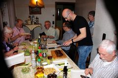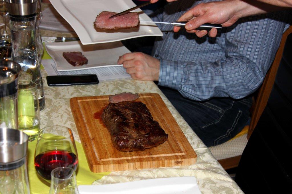 Apropos Abendessen, wir hatten nun fünf der edlen Stoffe genossen und nun war es an der Zeit Grundlage, sprich Essen nachzulegen. Hannelore hatte ein Roastbeef vorbereitet, das bei 60 °C schon vier Stunden im Backofen garte. Dann nochmal kurz auf beiden Seiten angebraten und schon konnte dieses Wunderwerk serviert werden. Mit gemischtem Salat und selbst gemachten sog. „Adlerknöpfle“, eine ganz besondere Teigware (Rezept geheim), hieß es dann nur noch Genuss pur – dieses Essen konnte sicher auch mit dem besten Whisky mithalten. Damit wir auch eine Whiskypause einlegen konnten, reichte Harald zum Essen Wein, Bier, Wasser je nach Gusto.