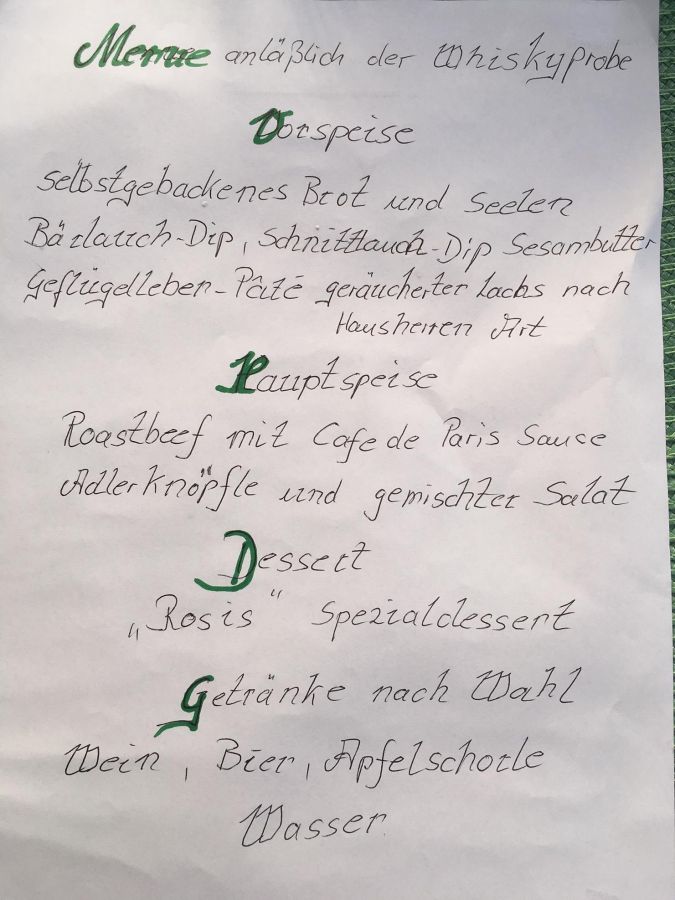 Ganz besonderen Dank möchten wir alle sagen an Hannelore und Harald Dürr für die Gastfreundschaft und das wunderbare Essen, an Rosi für den Traum von einem Nachtisch und last but not least an unseren Oberwhiskymann Henry, der uns nicht nur immer mehr in die Geheimnisse dieses wunderbaren Getränkes einweiht, sondern auch noch den Whisky mitgebracht hat – vielen herzlichen Dank euch allen und bis zum nächsten Mal, wenn es wieder heißt: Whiskyprobe beim Gesangverein Einigkeit.