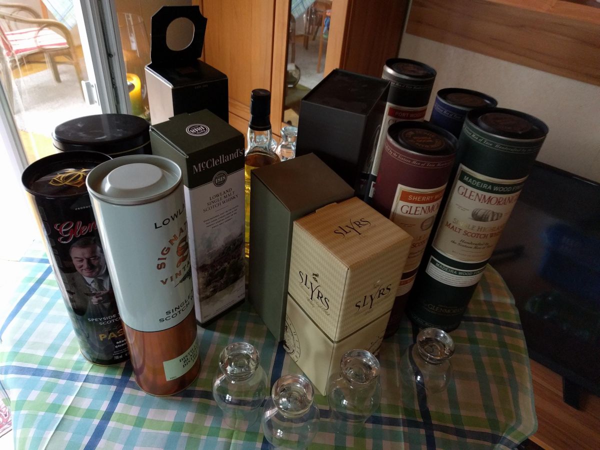 Am 22.04.2017 war es wieder mal soweit, die dritte Whiskyprobe der Einigkeit stand an. Lange erwartet, mausert sich diese Verkostung des edlen Getränkes langsam zur Traditionsveranstaltung. Acht Männer waren voller Vorfreude im Wohnzimmer unserer Gastgeber Harald und Hannelore zusammen gekommen, um unter fachkundiger Anleitung von „Whiskyprofessor“ Henry sich in die Geheimnisse dieses feinen Stoffes einweihen zu lassen. Das Motto das Henry diesmal vorgab hieß: „Fassvariationen“, das heißt er machte uns deutlich, wie unterschiedlich die Lagerung (übrigens meist in gebrauchten Fässern) sich auf Geschmack und Farbe auswirkt. Zunächst mussten wir uns vor der ersten Probe nochmal das schottische Ritual beim Whiskytrinken klarmachen. 1. Man schnüffelt mit dem linken Nasenloch und sagt zum Whisky „Hello“, dann führt man das Glas an das rechte Nasenloch und sagt „How do you do“, wieder zum linken mit dem Gruß „Nice to meet you“ und noch mal nach rechts mit der Verabschiedung „Hope to see you again“. Der Whiskyerklärer sagt dann: „Sláinte mhath“ (so etwa: zur Gesundheit) und die Whiskyschüler antworten „Sláinte mhor“ (noch mehr Gesundheit). Diese Ausdrücke sind in Lautschrift leider nicht darstellbar, fragen Sie einfach einen von uns wie das ausgesprochen wird, am besten bei einem guten Whisky.