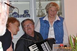 Bevor die letzen beiden Whiskies kredenzt wurden, servierten uns die Damen noch Rosis wunderbaren Nachtisch "Maronencreme mit Sahne und Kirsche" wirklich traumhaft. Da fragt sich der geneigte Leser: "Wo bleibt der eingangs erwähnte Gesang?" Gemach, gemach... denn mit steigender Anzahl der Proben steigt auch der Drang zum Singen, so konnten wir es kaum erwarten nach der letzten Probe loszulegen. Da Robert Burns auch Lieder geschrieben hat, war es natürlich selbstverständlich sein bekanntestes Lied "Should Auld Acquaintance..." als erstes zu singen. Und, da Klaus Eichsteller wie zufällig sein Akkordeon dabei hatte, gab es nun kein Halten mehr. Zum Glück haben Hucks verständisvolle Nachbarn.