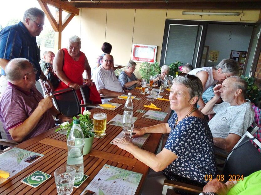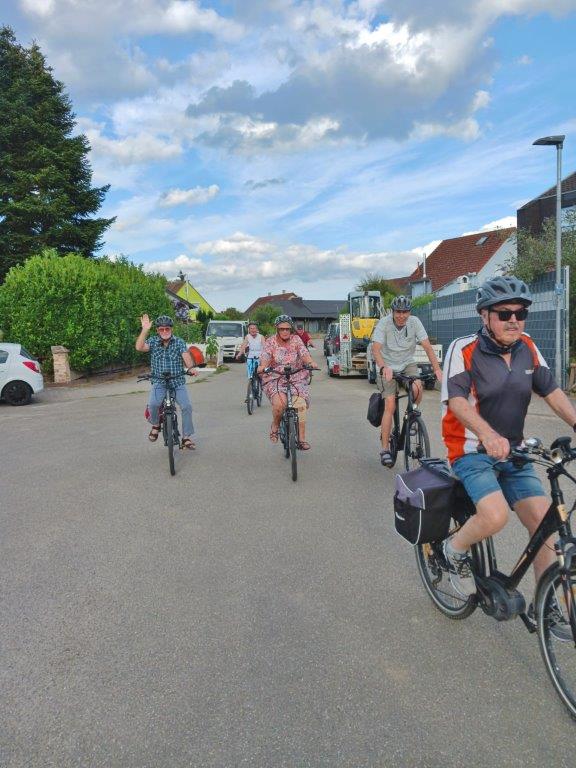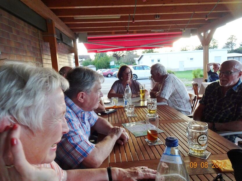 Am 9. August fand sich pünktlich um 18.00 Uhr eine Gruppe von 10 Radlern ein, die sich mit Rainer und Susanne auf eine schöne Runde aufmachte. Durch Wiesen, Wälder und Felder ging´s über Graben, Richtung Rußheim und schließlich über Liedolsheim zurück nach Hochstetten. Dort setzte die Gruppe zum Einkehrschwung beim TVH an und wurde von den Nichtradlern vor Ort bereits erwartet. Wir waren eine stattliche Gruppe von über 20 Personen, die im Außenbereich des Restaurants von Vanny und ihrem Personal bestens mit Speis und Trank versorgt wurden. Bei guter Stimmung gab´s einiges zu erzählen, unter anderem war auch unser geplanter Ausflug im Oktober Gespräch.