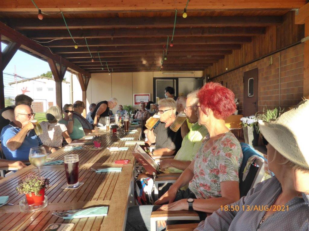 Einige Nichtradler warteten schon auf die Gruppe und schnell wurden die reservierten Plätze eingenommen und die Getränke bei Vanny geordert. Heiß verdient war das kühle Nass und ließ die Strapazen der schweißtreibenden Tour schnell vergessen. Mit leckeren Gerichten wurden dann die Energiespeicher weiter aufgefüllt und bei angeregter Unterhaltung verging schnell die Zeit. Schön war das gesellige Beisammensein, das sich jedoch zu fortgeschrittener Stunde wegen den zahlreich anrückenden Schnaken jäh auflöste.