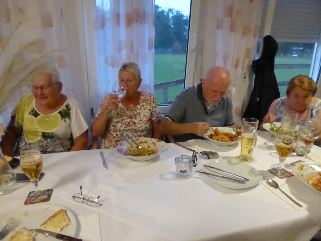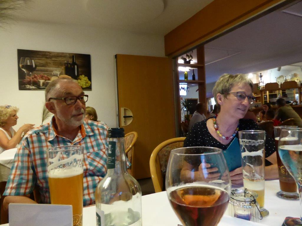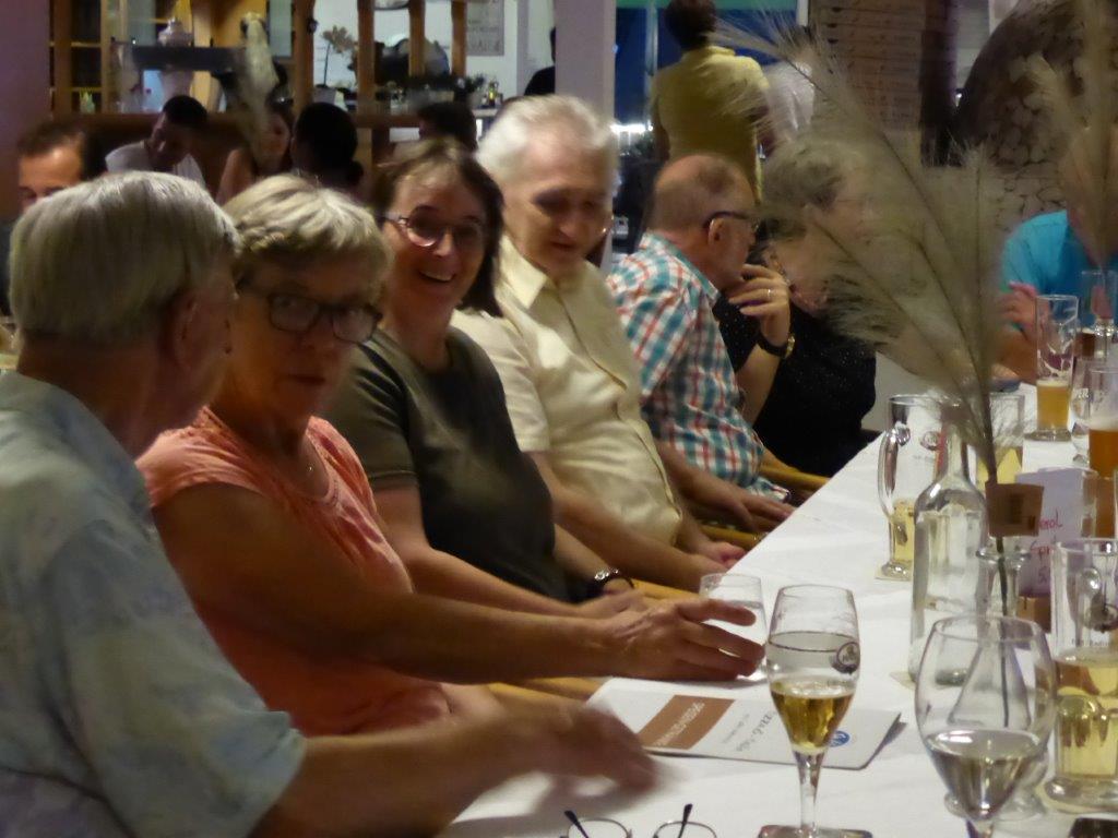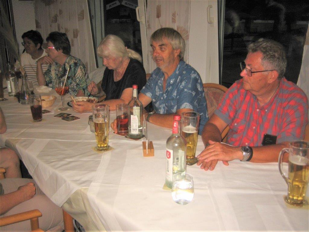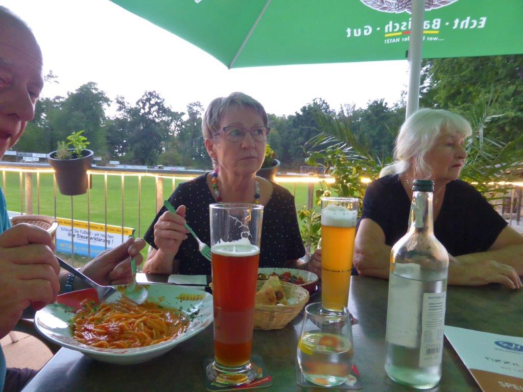 wurde wieder gut angenommen. Obwohl die Wetter-Apps dieses Mal sehr unterschiedliche Prognosen stellten, regnet es um 18.00 Uhr, oder nicht, trauten sich letztendlich neun Radler*innen an den Start. Und die Gruppe hatte Glück, eine schöne Tour durch Feld und Flur und durch den Hardtwald, mit dem Restaurant beim FVH als Ziel, war optimal getimet! Als die Radelgruppe zum Einkehrschwung ansetzte, donnerte es gewaltig und sie konnten gerade noch vor dem heftigen Regen die Räder parken und das Lokal erreichen. Mit einem Platz auf der Terrasse war es leider nichts, aber für den heiß ersehnten Regen, nahmen wir auch gerne im Innenraum des Lokals Platz. Dort warteten schon die Nichtradler*innen und die Gruppe wuchs auf 18 Personen an. Bei leckeren Speisen und Getränken war es wieder ein unterhaltsamer Abend und hier erneut ein herzliches Danke an Rainer, der diese schönen Touren führt.