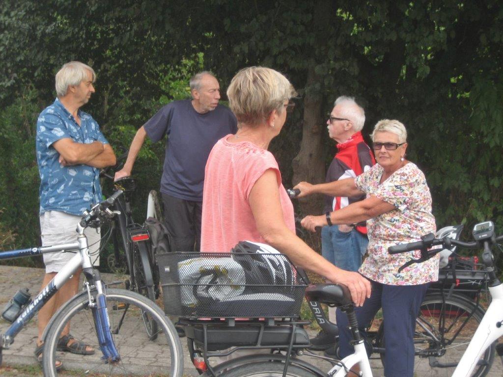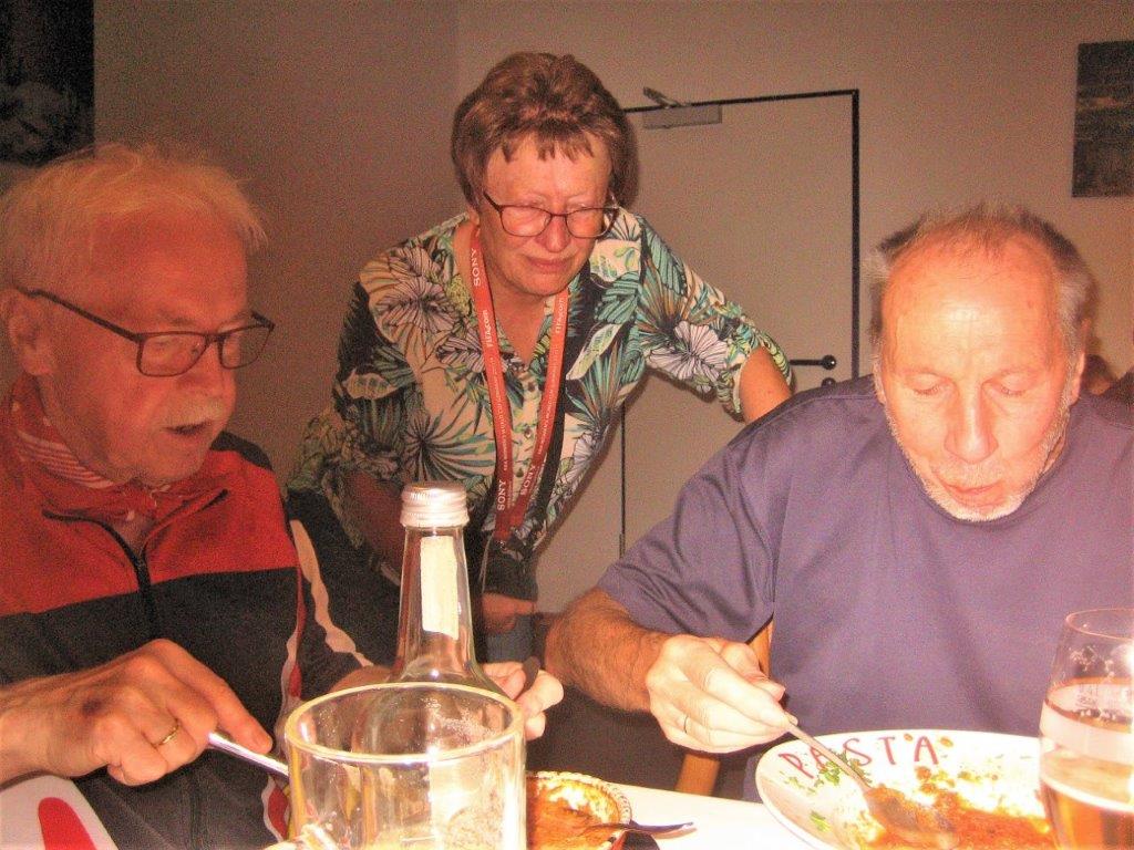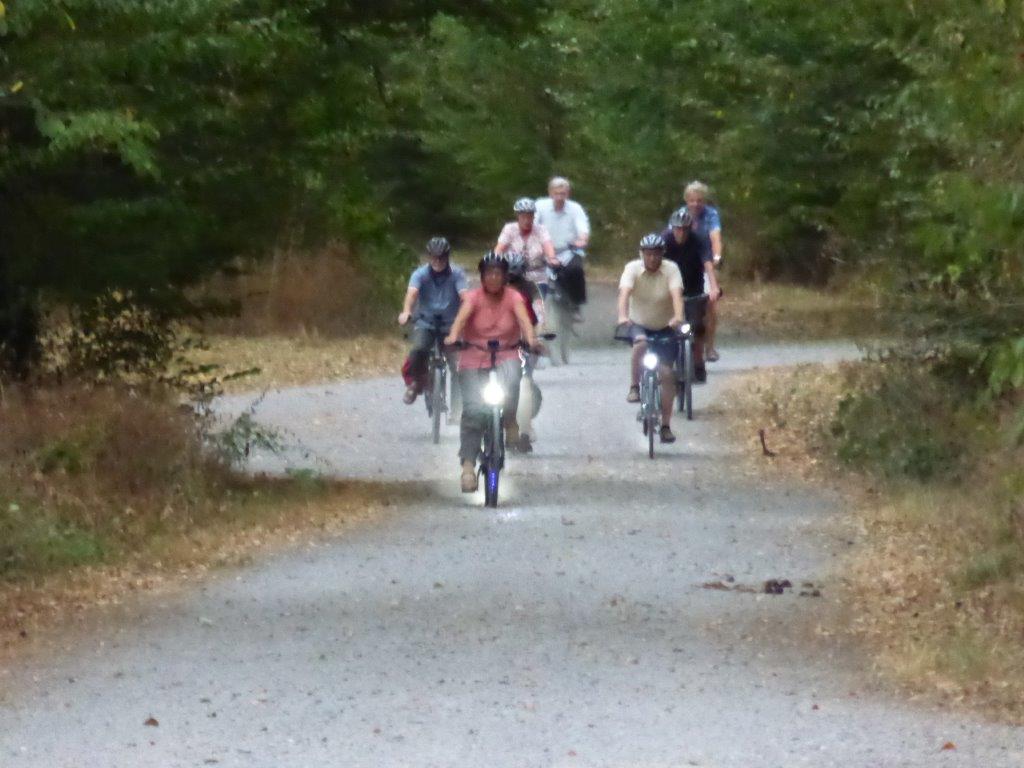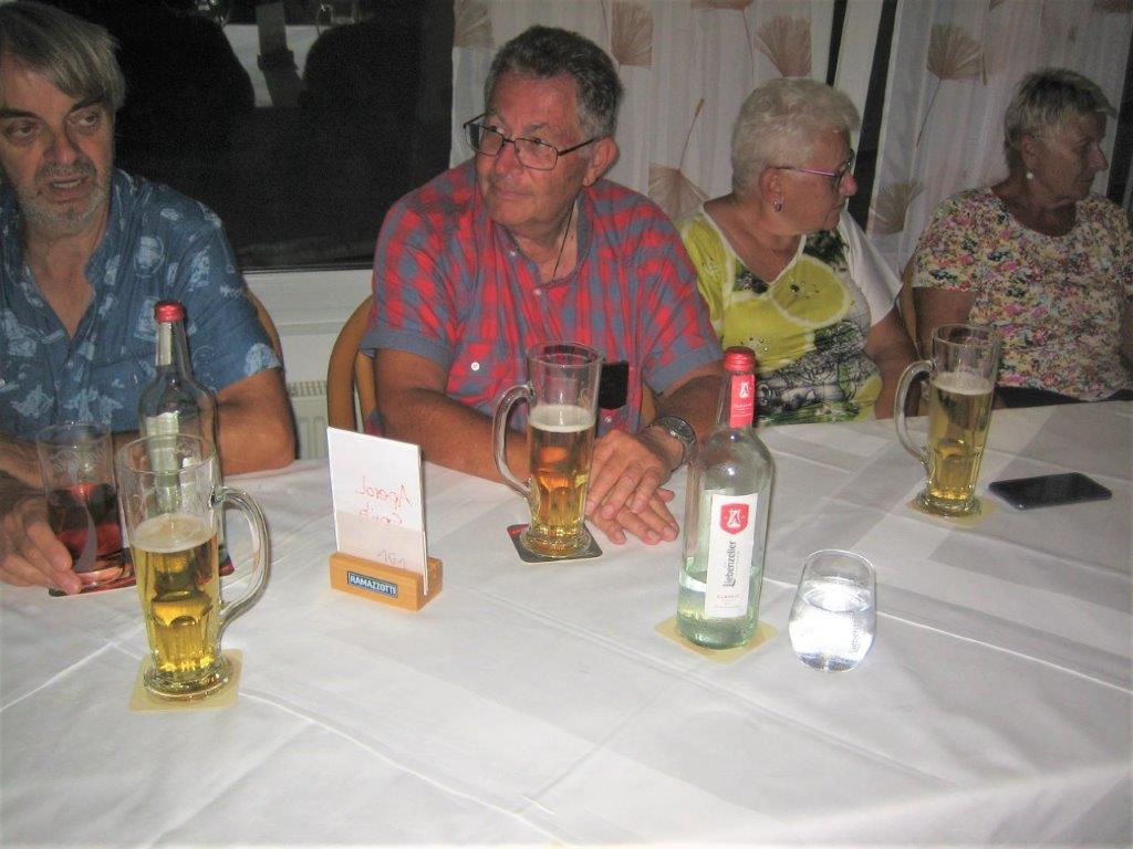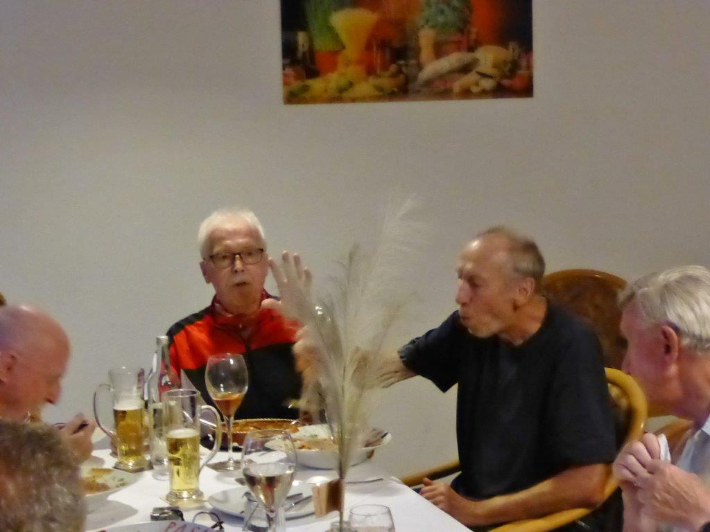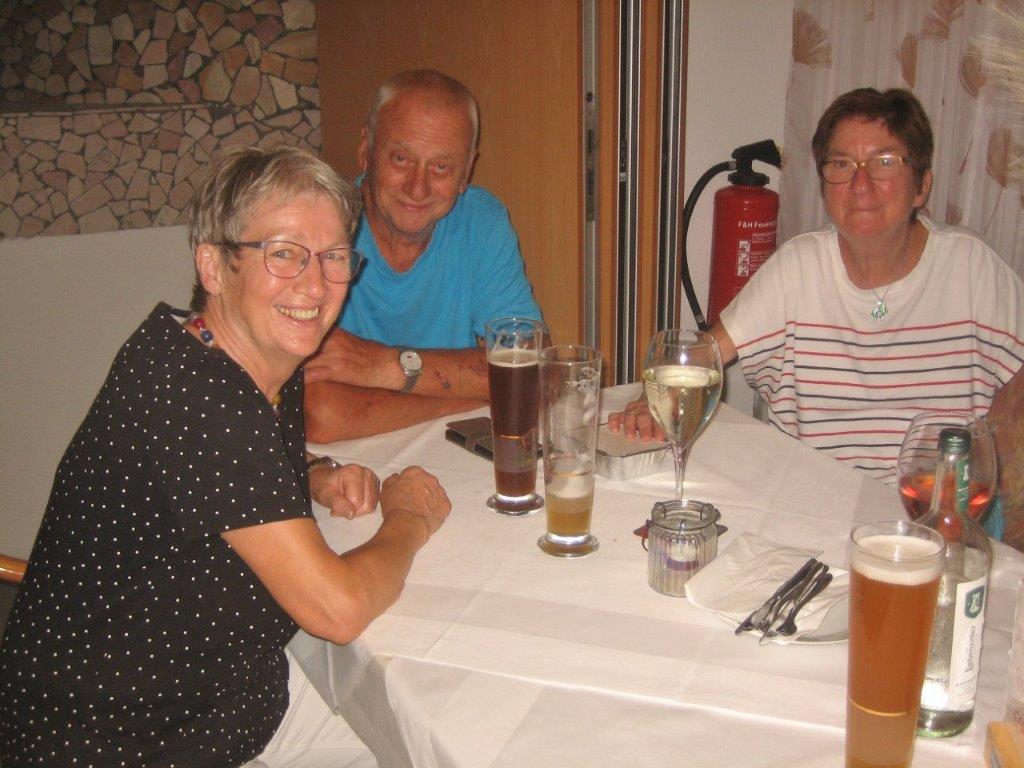 wurde wieder gut angenommen. Obwohl die Wetter-Apps dieses Mal sehr unterschiedliche Prognosen stellten, regnet es um 18.00 Uhr, oder nicht, trauten sich letztendlich neun Radler*innen an den Start. Und die Gruppe hatte Glück, eine schöne Tour durch Feld und Flur und durch den Hardtwald, mit dem Restaurant beim FVH als Ziel, war optimal getimet! Als die Radelgruppe zum Einkehrschwung ansetzte, donnerte es gewaltig und sie konnten gerade noch vor dem heftigen Regen die Räder parken und das Lokal erreichen. Mit einem Platz auf der Terrasse war es leider nichts, aber für den heiß ersehnten Regen, nahmen wir auch gerne im Innenraum des Lokals Platz. Dort warteten schon die Nichtradler*innen und die Gruppe wuchs auf 18 Personen an. Bei leckeren Speisen und Getränken war es wieder ein unterhaltsamer Abend und hier erneut ein herzliches Danke an Rainer, der diese schönen Touren führt.