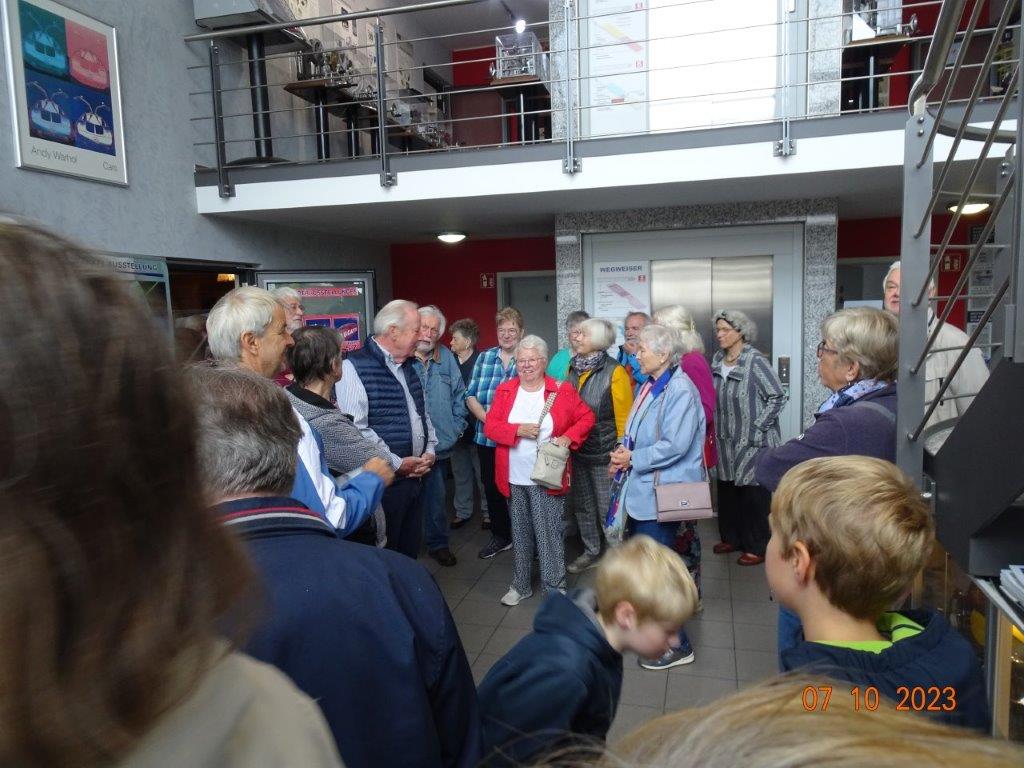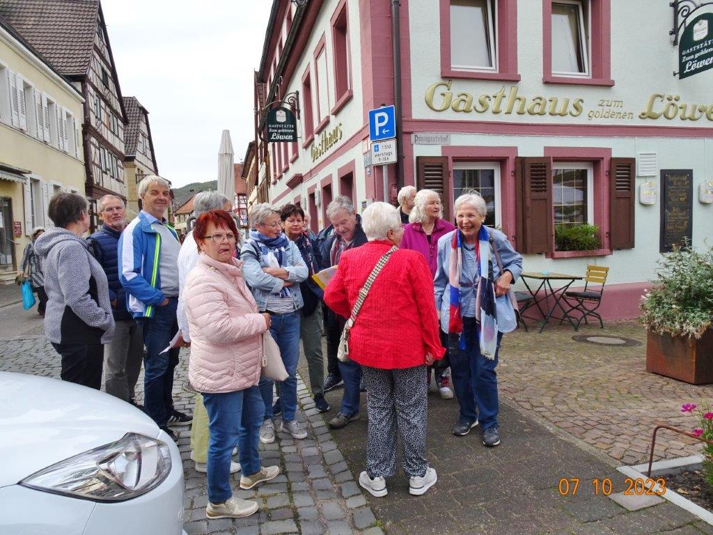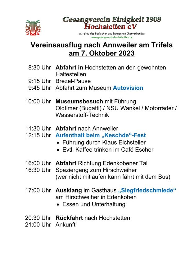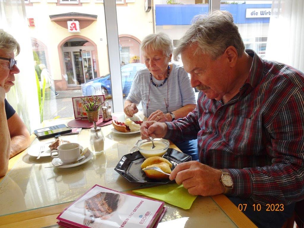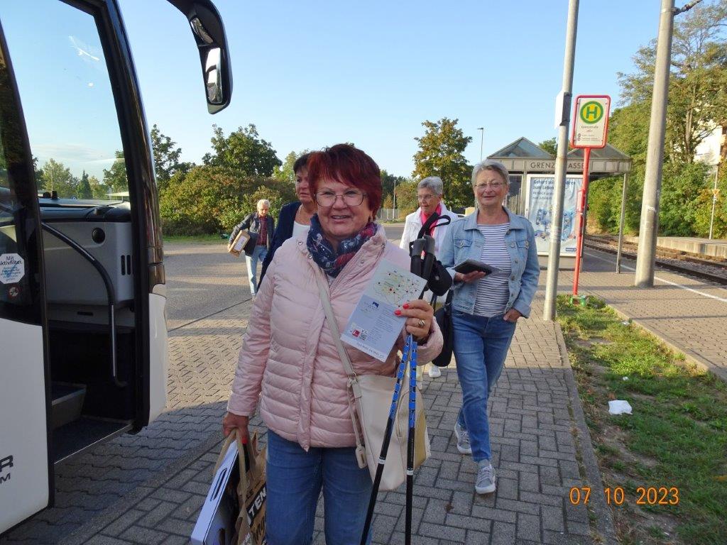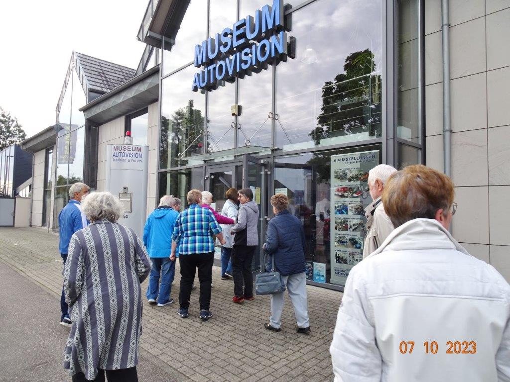 Am 7. Oktober ging´s um 8.30 Uhr los und unser Busfahrer Yilmaz fuhr pünktlich die ausgemachten Haltestellen an. Leider waren doch einige Plätze freigeblieben, aber das tat der Freude auf diesen Tag keinen Abbruch. Unser Vorstand Klaus Reinhardt begrüßte die Anwesenden und unser Busfahrer, der uns großartig chauffierte, stellte sich vor. Dann übernahm unser Commander Klaus Eichsteller die Leitung dieses Tages, mit seinen Astronessen Heidi und Doris zur Seite. Er hatte wieder akribisch diesen Ausflug vorbereitet und unsere erste Andockstelle war an der Fähre in Rheinhausen, wo wir bei „Heidi´s Rhoiheisel“ unsere Brezelpause machten. Ein Danke an Jola und Brigitte, die für leckere Butter-Brezel gesorgt hatten, die am Rhein besonders gut schmeckten. Die von unserem Commander spendierten Schaumküsse rundeten die Pause ab und es ging weiter zu unserem nächsten Ziel, dem Museum Autovision in Altlußheim. Bei einer Führung erfuhren wir viel Interessantes über die Gesamtheit der Entwicklung der Mobilität und die Individualität der Fortbewegungssysteme. Es fing an mit dem Laufrad des Freiherrn von Drais, Motorrädern ab 1885 und die Automobilgeschichte ab 1886, wobei NSU, Motorsport und Wankelmotoren eine große Rolle spielten. Ein Schmankerl fürs Auge waren die von Jean Bugatti designten Fahrzeuge und die Hintergrundgeschichten, die wir von Herrn Schultz erfuhren. Natürlich waren auch E-Mobile und die Zukunft mit der Wasserstoff-Technologie ein großes Thema in diesem sehenswerten Museum. Das gab einigen Gesprächsstoff auf unserer Weiterfahrt nach Annweiler.