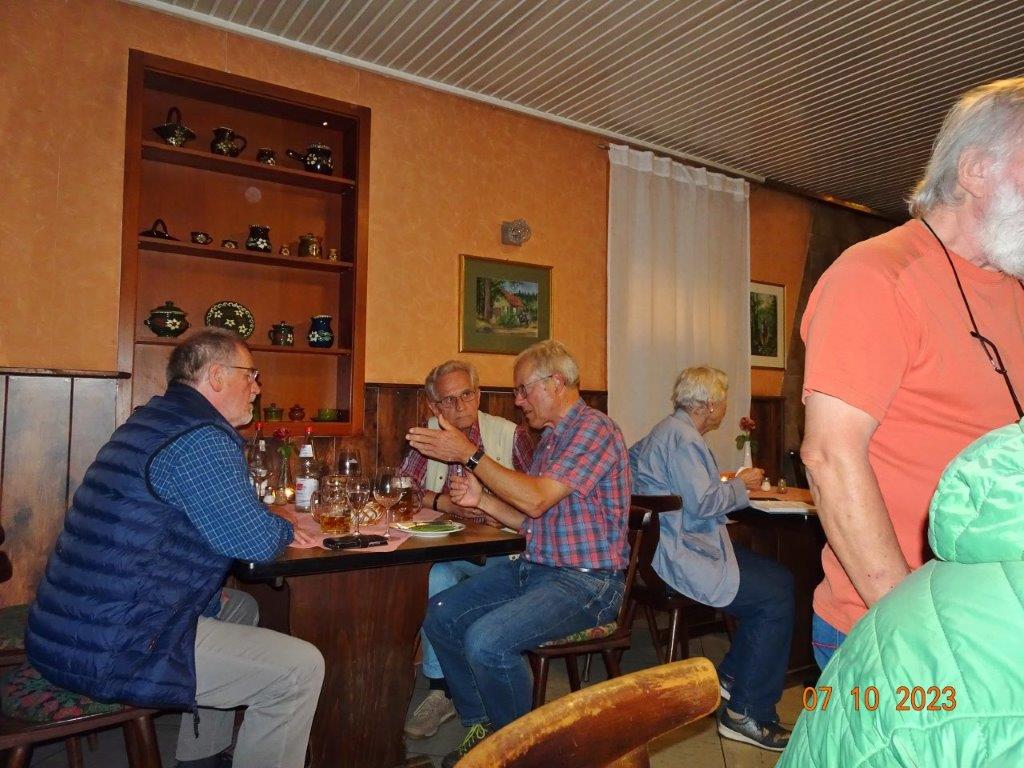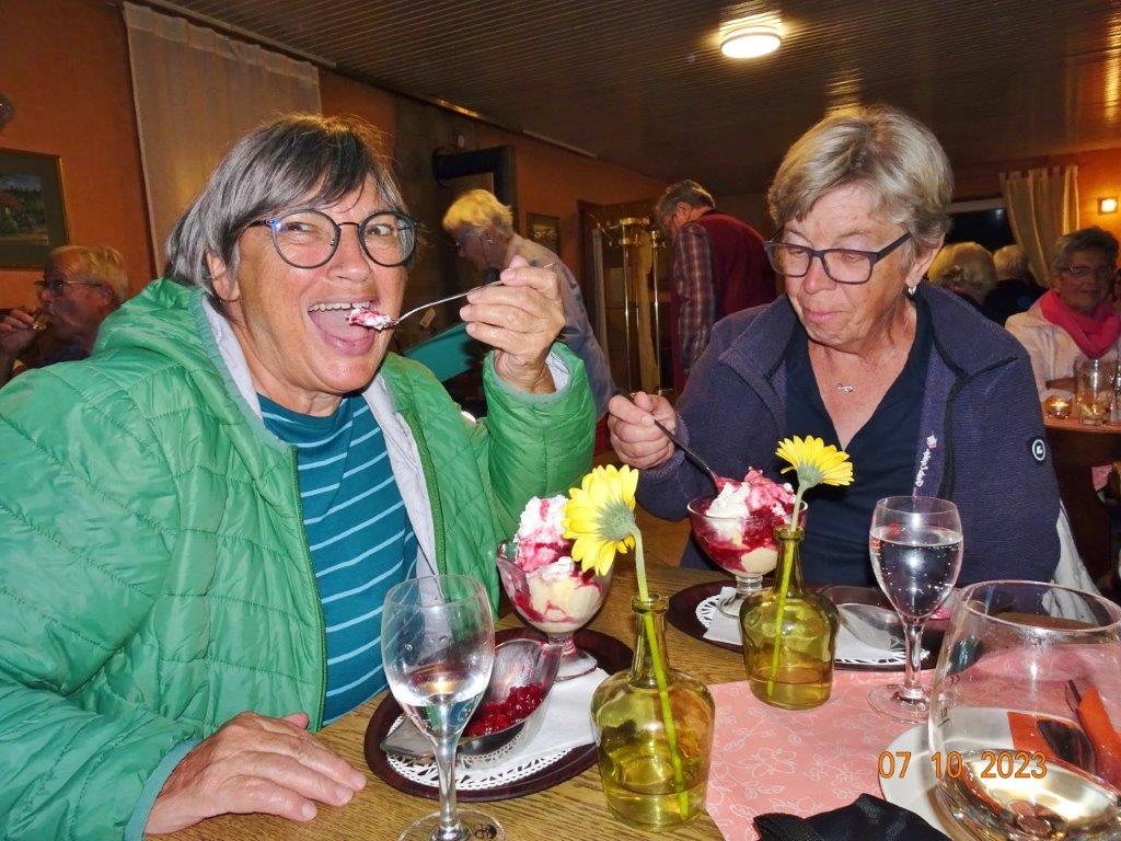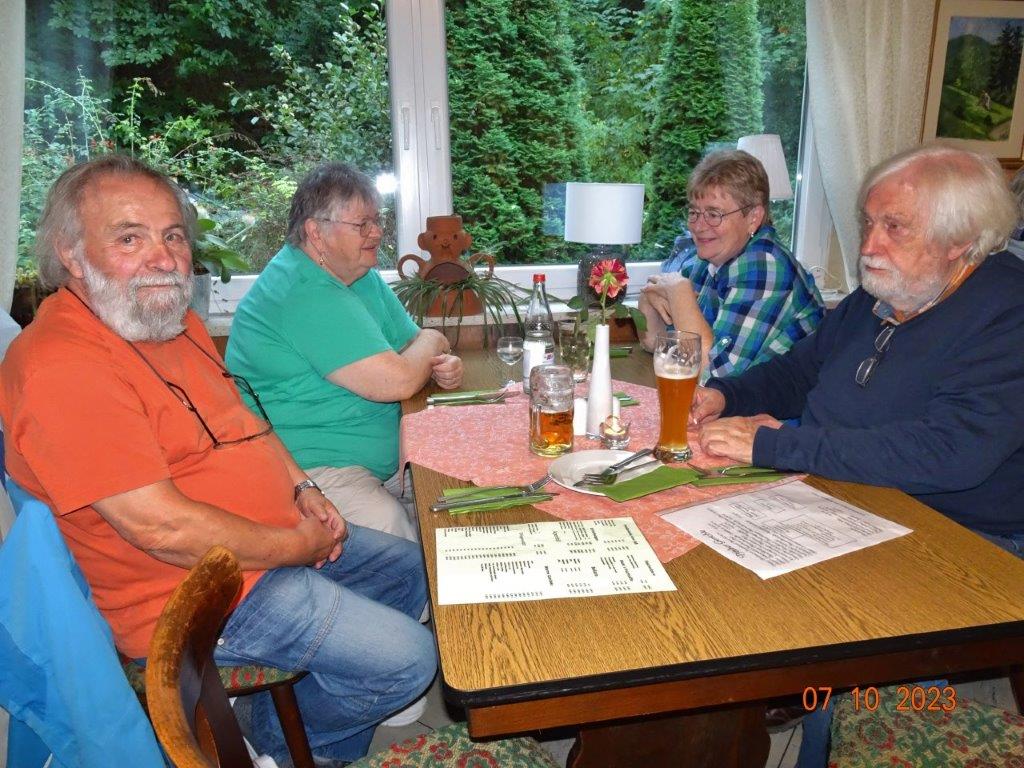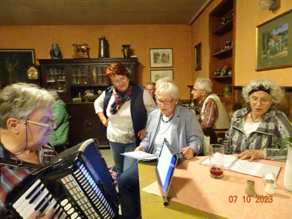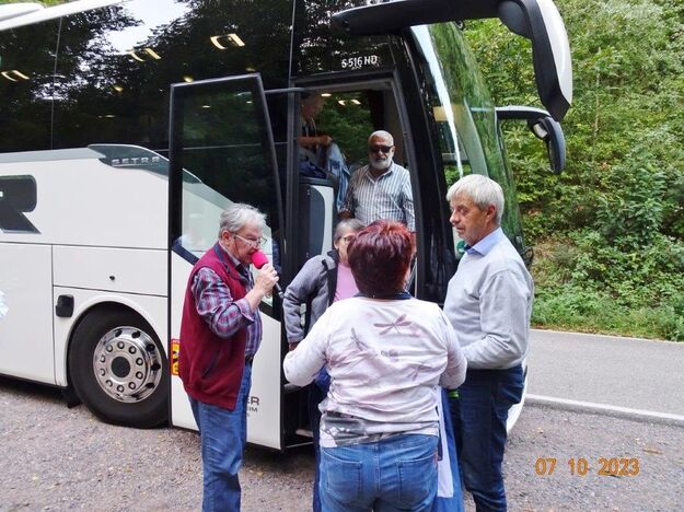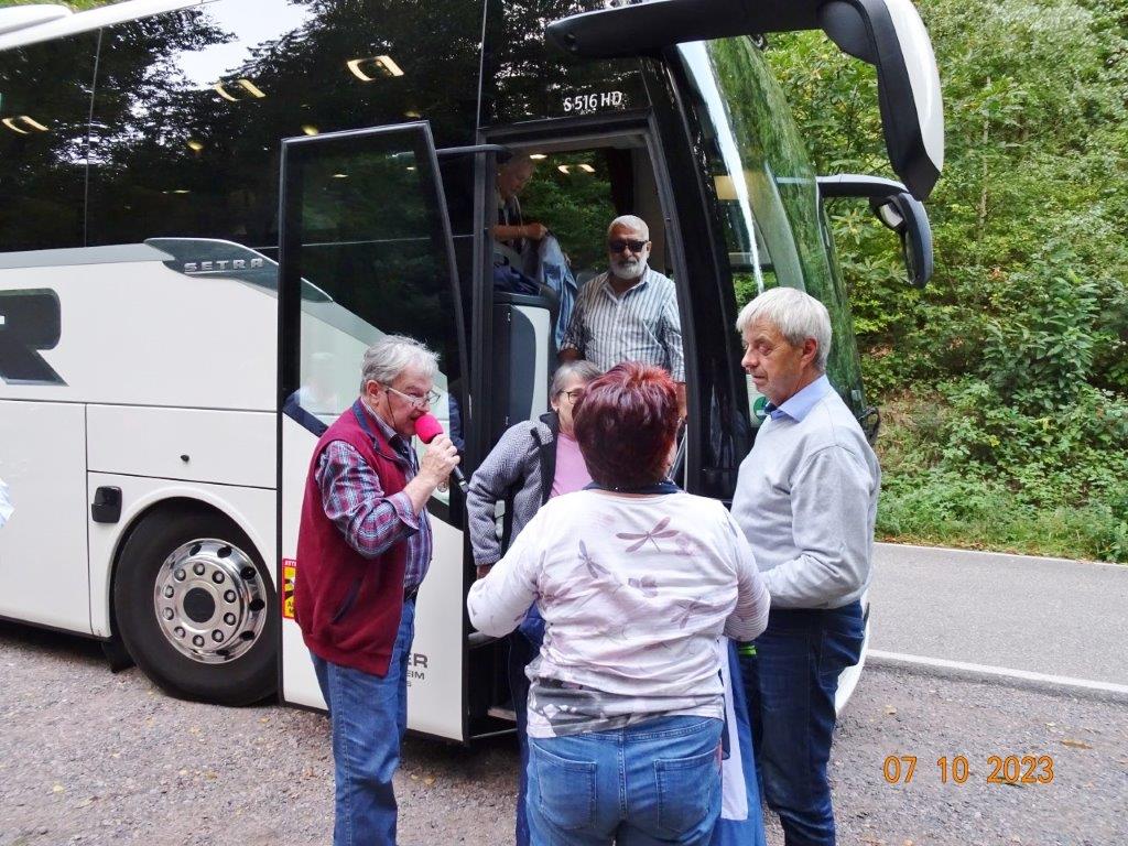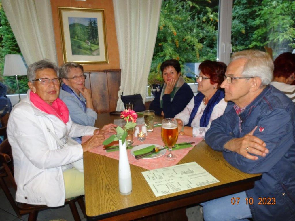 Nun ging´s weiter zu unserem Abschlussziel, dem Edenkobener Tal. Unser Busfahrer musste auf dieser Fahrt Millimeterarbeit leisten – bravo. Die Landschaft ist ein herrliches Wandergebiet, aber uns blieb nur ein schöner Spaziergang zum Hilschweiher und unserem eigentlichen Ziel, der Siegfriedschmiede. Einige, die nicht so gut zu Fuß waren, fuhren mit dem Bus zum Gasthaus, wo schon die Tische für uns eingedeckt waren. Wir nahmen Platz und so konnte die freundliche Bedienung die Getränke- und Essens-Wünsche aufnehmen und wir wurden alle zügig und bestens versorgt. Wie man hörte, hat es rundum geschmeckt, ein Danke an das Siegfriedschmiede-Team. Unser Commander zeigte sich noch von der musikalischen Seite und spielte mit dem Akkordeon stimmige Lieder. Gesanglich von Heidi und Irmgard begleitet wurde geschunkelt und mitgesungen und so langsam ging ein wunderschöner Tag zu Ende. Das „Ausflugs-Schiff“ ist wieder gut in Li-Ho. gelandet, dank unserem exzellenten Bus-Kapitän Yilmaz, dafür ein herzliches Dankeschön. Aber ein ganz großer Dank geht an unseren Commander Klaus, der eine tolle Route mit grandiosen Zielen ausgesucht und sich auch mit Petrus wohlwollend abgesprochen hatte. Unterstützt von seinen Astronessen Heidi und Doris, Jola und Brigitte und auch von unserem Vorstand Klaus Reinhardt, war das für alle Teilnehmenden ein absolut gelungener Tag!