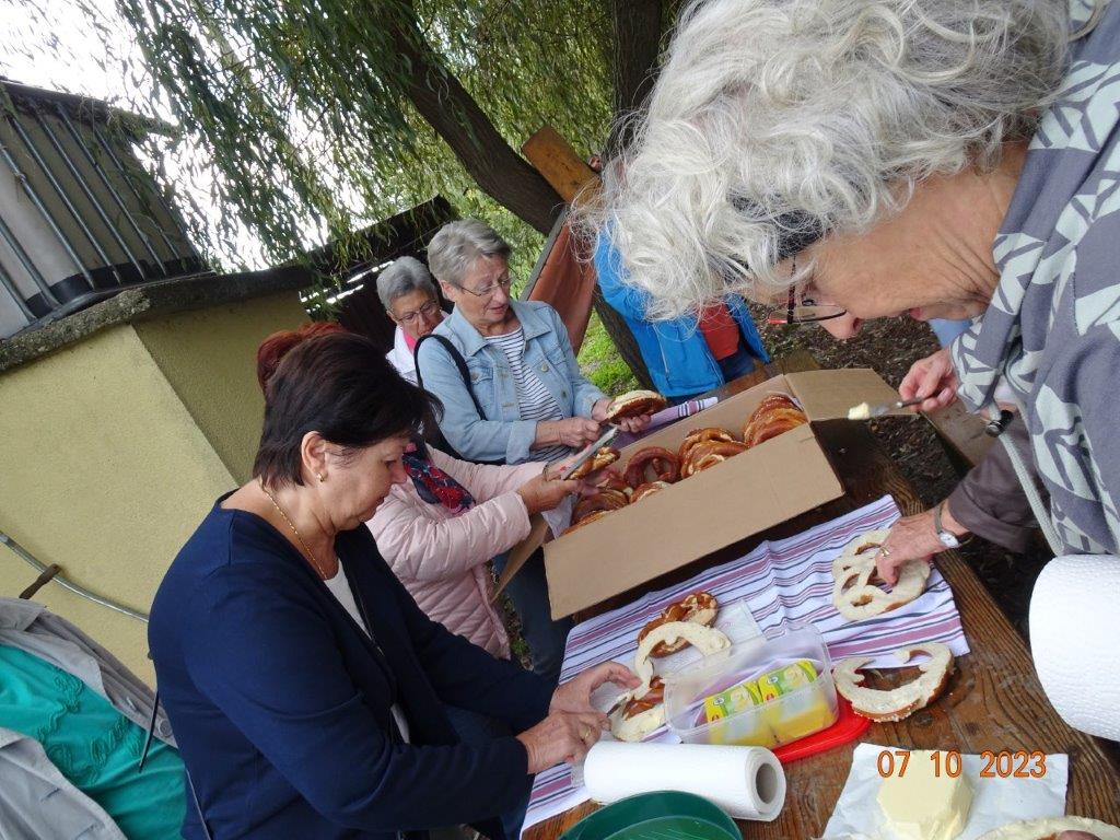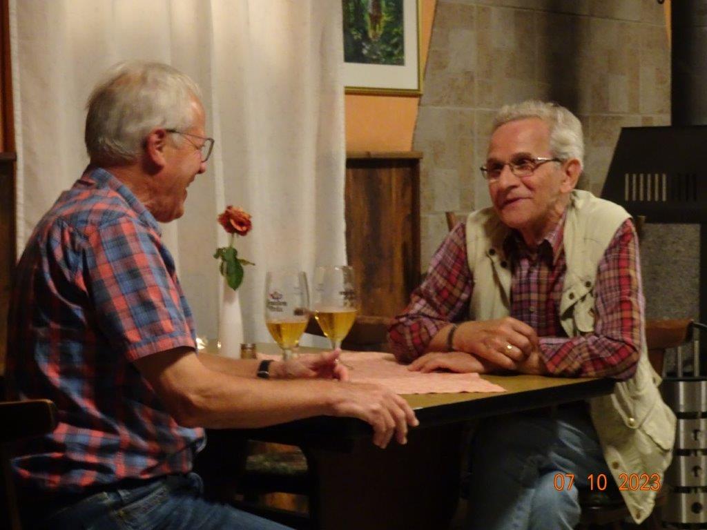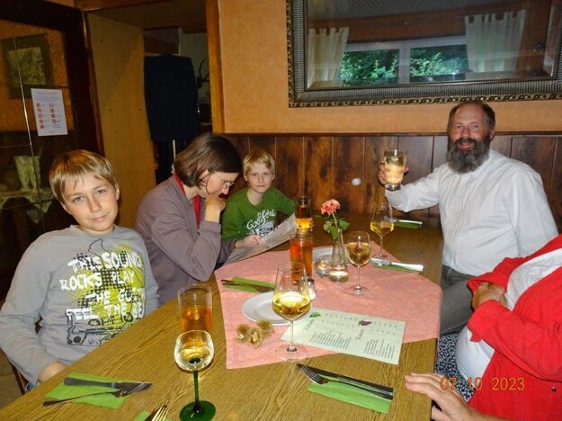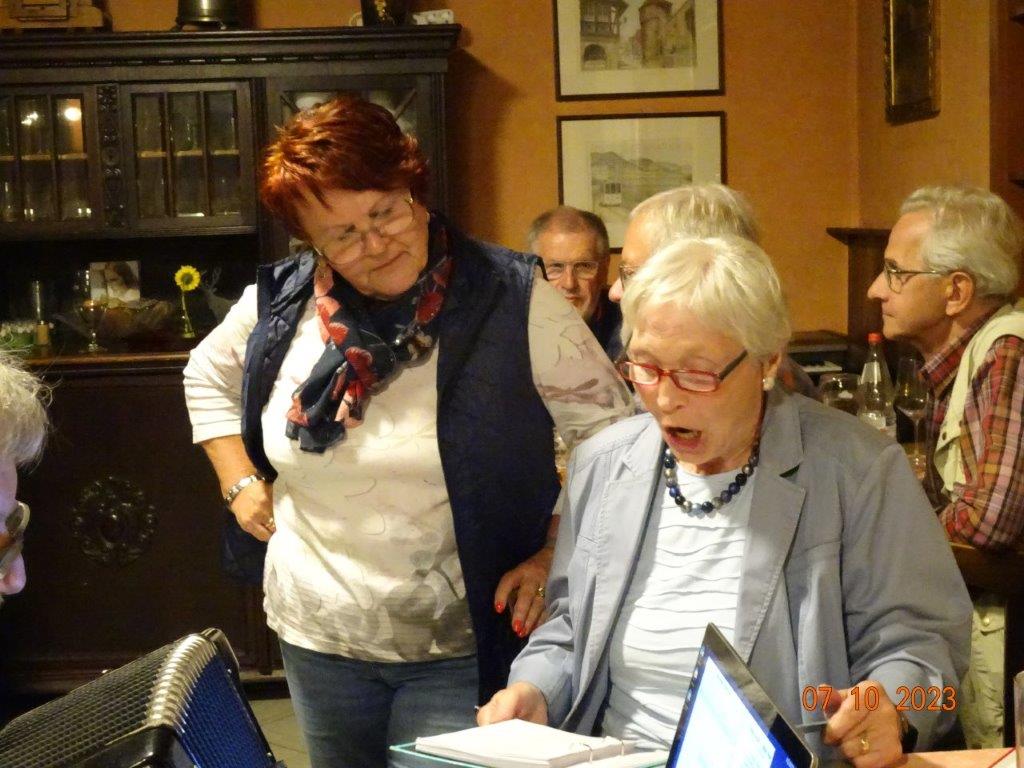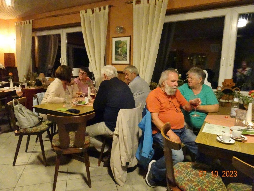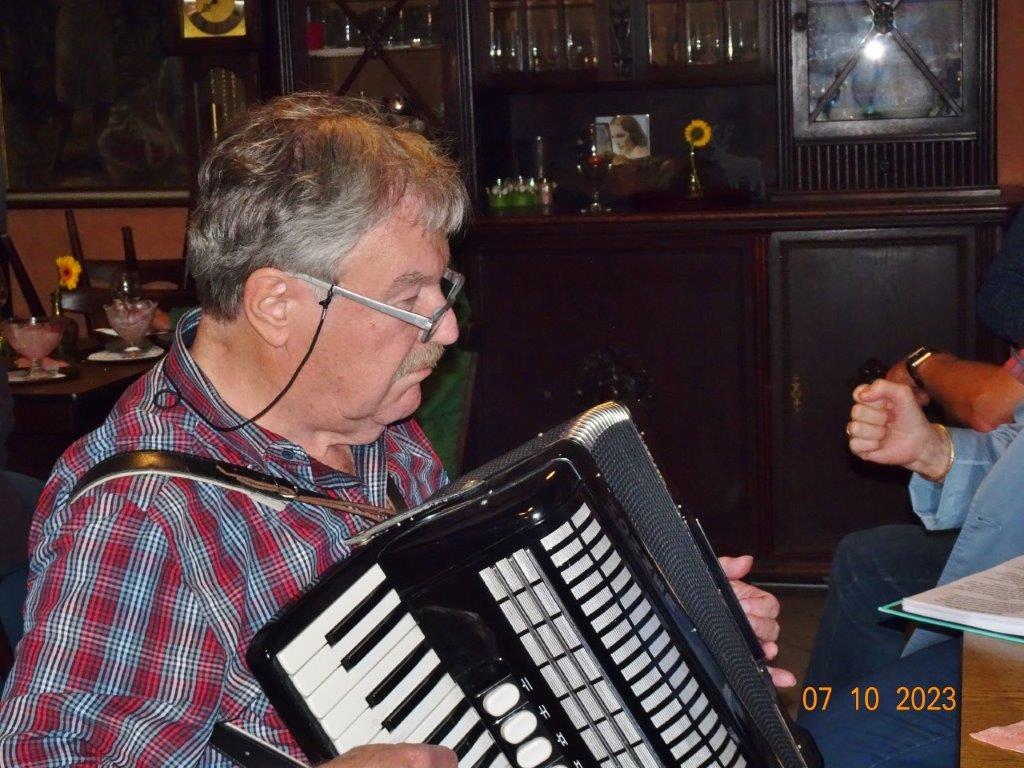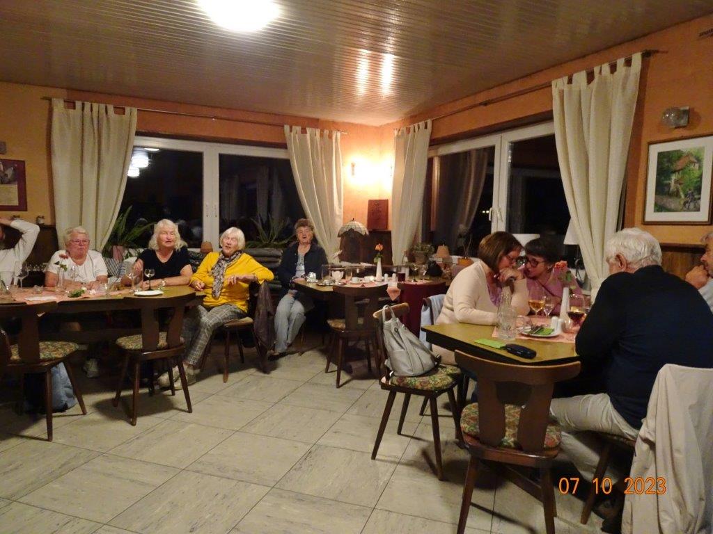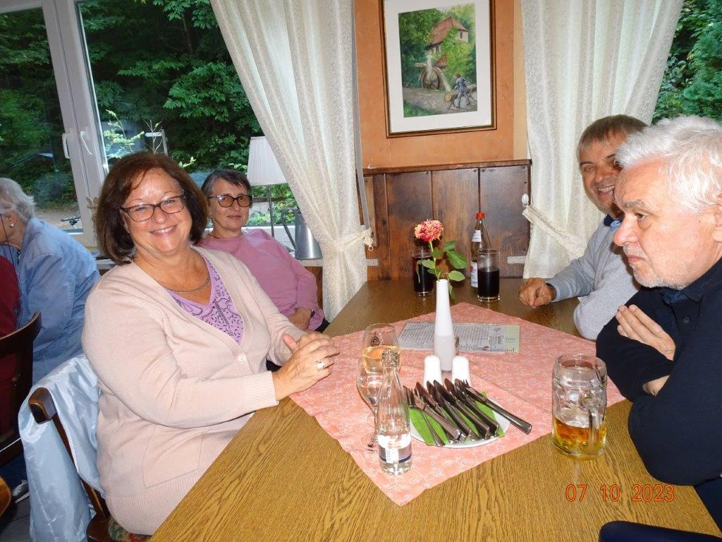 Nun ging´s weiter zu unserem Abschlussziel, dem Edenkobener Tal. Unser Busfahrer musste auf dieser Fahrt Millimeterarbeit leisten – bravo. Die Landschaft ist ein herrliches Wandergebiet, aber uns blieb nur ein schöner Spaziergang zum Hilschweiher und unserem eigentlichen Ziel, der Siegfriedschmiede. Einige, die nicht so gut zu Fuß waren, fuhren mit dem Bus zum Gasthaus, wo schon die Tische für uns eingedeckt waren. Wir nahmen Platz und so konnte die freundliche Bedienung die Getränke- und Essens-Wünsche aufnehmen und wir wurden alle zügig und bestens versorgt. Wie man hörte, hat es rundum geschmeckt, ein Danke an das Siegfriedschmiede-Team. Unser Commander zeigte sich noch von der musikalischen Seite und spielte mit dem Akkordeon stimmige Lieder. Gesanglich von Heidi und Irmgard begleitet wurde geschunkelt und mitgesungen und so langsam ging ein wunderschöner Tag zu Ende. Das „Ausflugs-Schiff“ ist wieder gut in Li-Ho. gelandet, dank unserem exzellenten Bus-Kapitän Yilmaz, dafür ein herzliches Dankeschön. Aber ein ganz großer Dank geht an unseren Commander Klaus, der eine tolle Route mit grandiosen Zielen ausgesucht und sich auch mit Petrus wohlwollend abgesprochen hatte. Unterstützt von seinen Astronessen Heidi und Doris, Jola und Brigitte und auch von unserem Vorstand Klaus Reinhardt, war das für alle Teilnehmenden ein absolut gelungener Tag!
