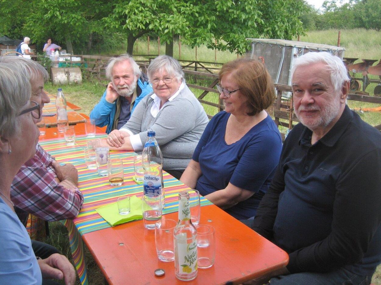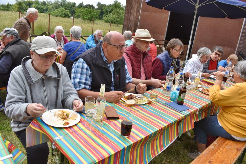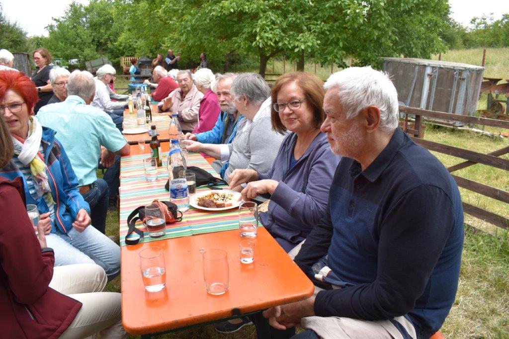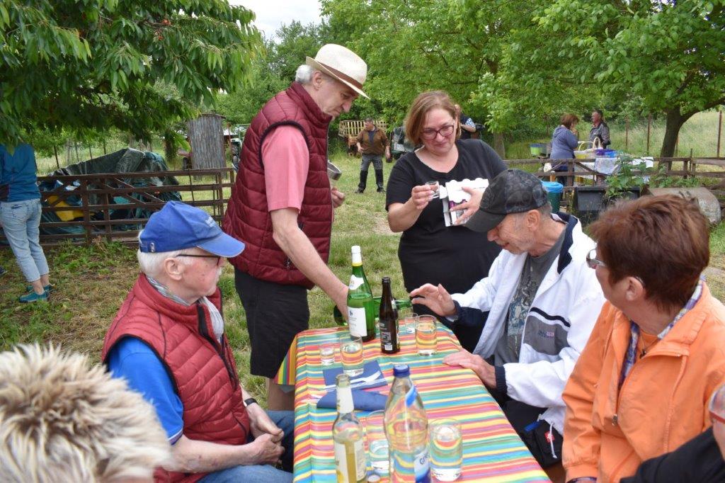 Klaus Eichsteller war mit seinem Akkordeon unermüdlich im Einsatz und Reinhilde Fürniß hatte ihre Gitarre und einige Lieder dabei, so konnten wir Manfred noch nachträglich zum 80. Geburtstag ein gebührendes Ständchen darbringen. Es ließ sich trefflich im Grünen sitzen und ab und an meldeten sich die Schafe mit Geblök, schließlich saßen wir ja auch auf deren Koppel. Auch ein herrlicher Tag geht einmal zu Ende und mit vereinten Kräften wurde zusammen geräumt – herzlichen Dank an alle Beteiligten und vor allem an unsere Gastgeber.