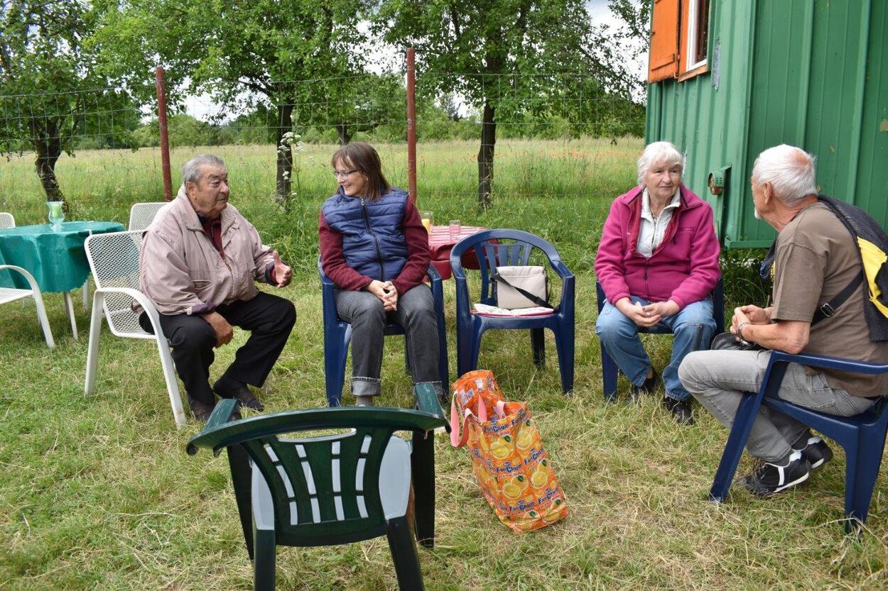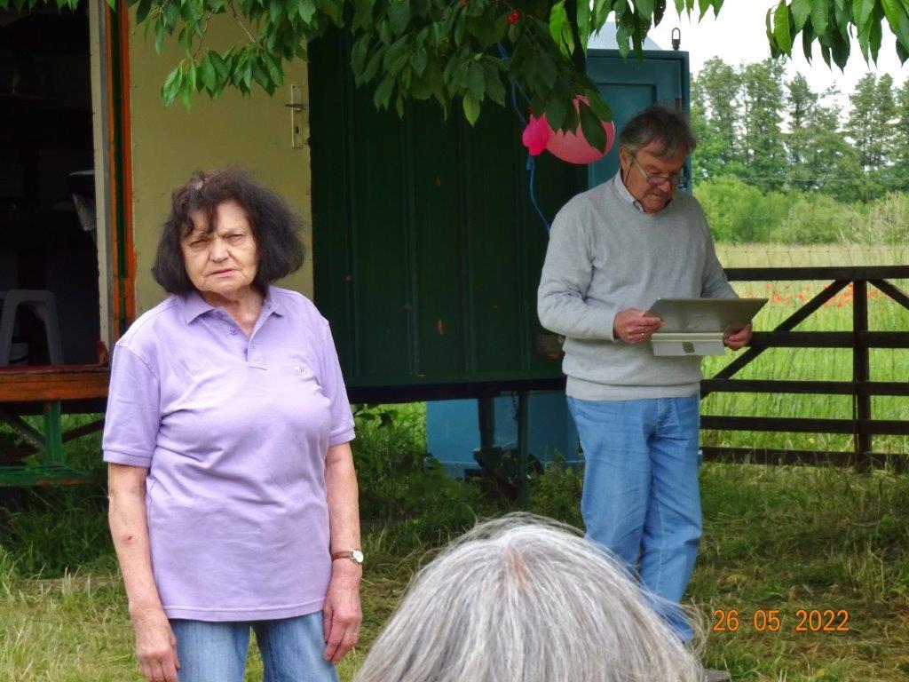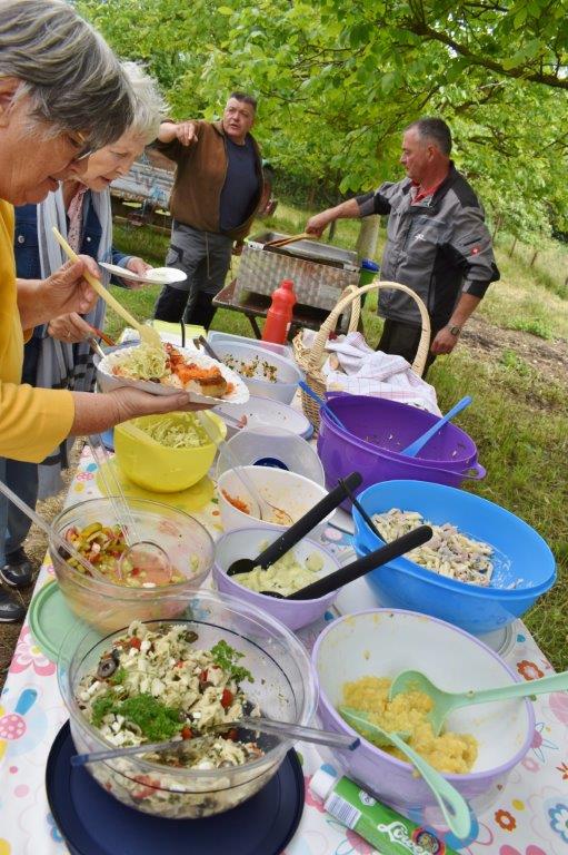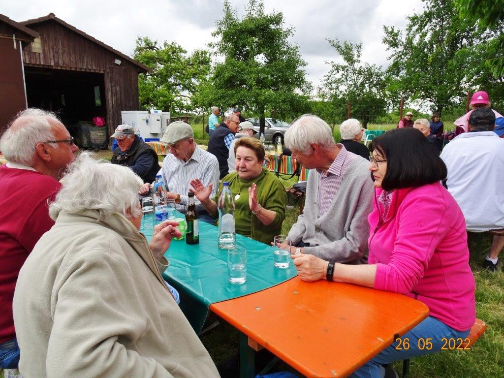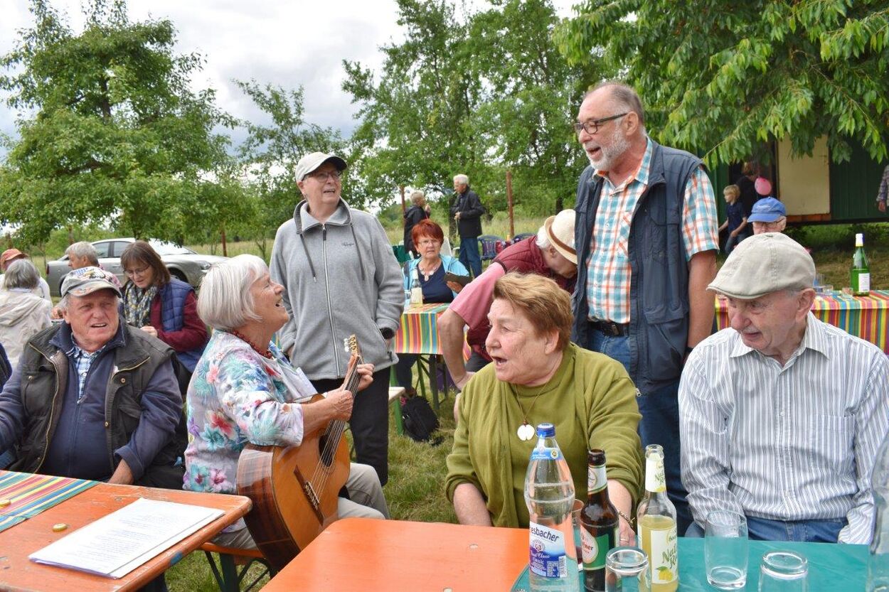 Klaus Eichsteller war mit seinem Akkordeon unermüdlich im Einsatz und Reinhilde Fürniß hatte ihre Gitarre und einige Lieder dabei, so konnten wir Manfred noch nachträglich zum 80. Geburtstag ein gebührendes Ständchen darbringen. Es ließ sich trefflich im Grünen sitzen und ab und an meldeten sich die Schafe mit Geblök, schließlich saßen wir ja auch auf deren Koppel. Auch ein herrlicher Tag geht einmal zu Ende und mit vereinten Kräften wurde zusammen geräumt – herzlichen Dank an alle Beteiligten und vor allem an unsere Gastgeber.