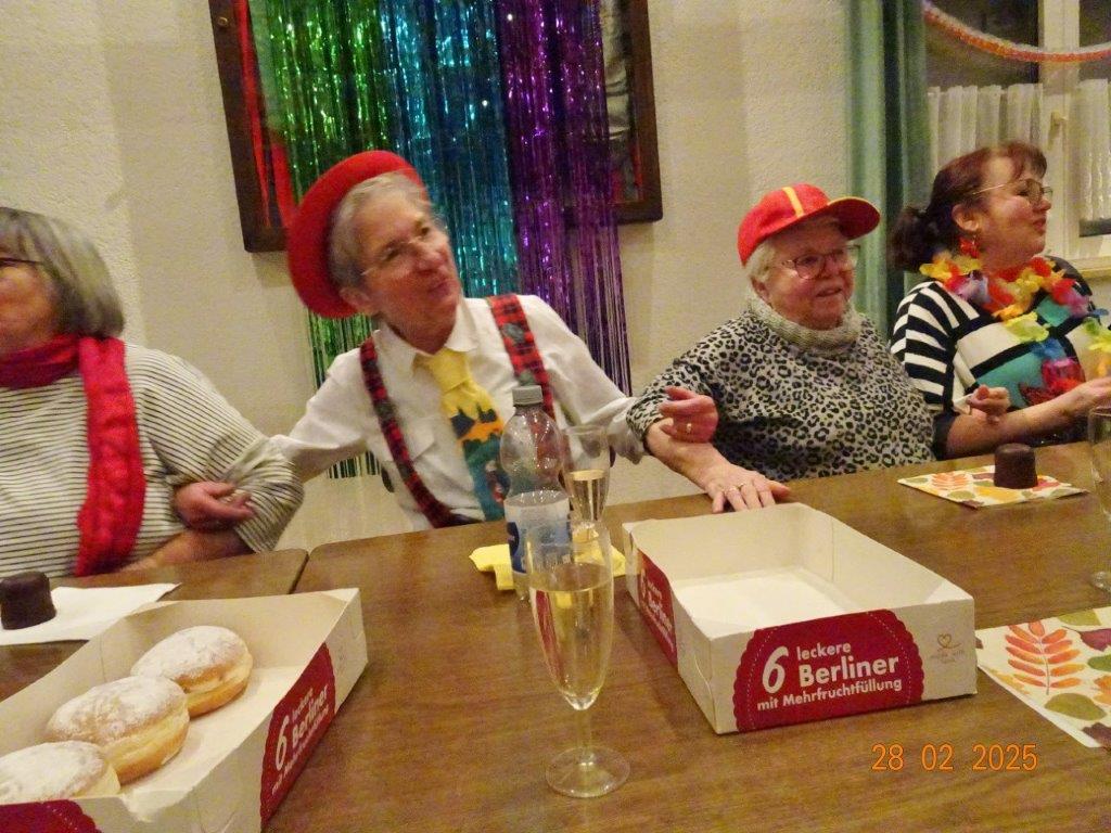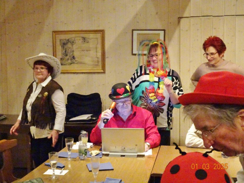 Die Faschingsdeko im Erlich passte für uns und einige Sängerinnen und Sänger waren gut behütet und zur 5. Jahreszeit gekleidet gekommen. Klaus Eichsteller sorgte für das entsprechende Programm mit Faschingsliedern und einer Büttenrede über einen „besonderen Kurgast“, danke Klaus. Wir freuten uns sehr, dass auch seine Frau Heidi mitgekommen war. So hatten wir eine schöne Stimmung und ließen den Abend angenehm ausklingen.