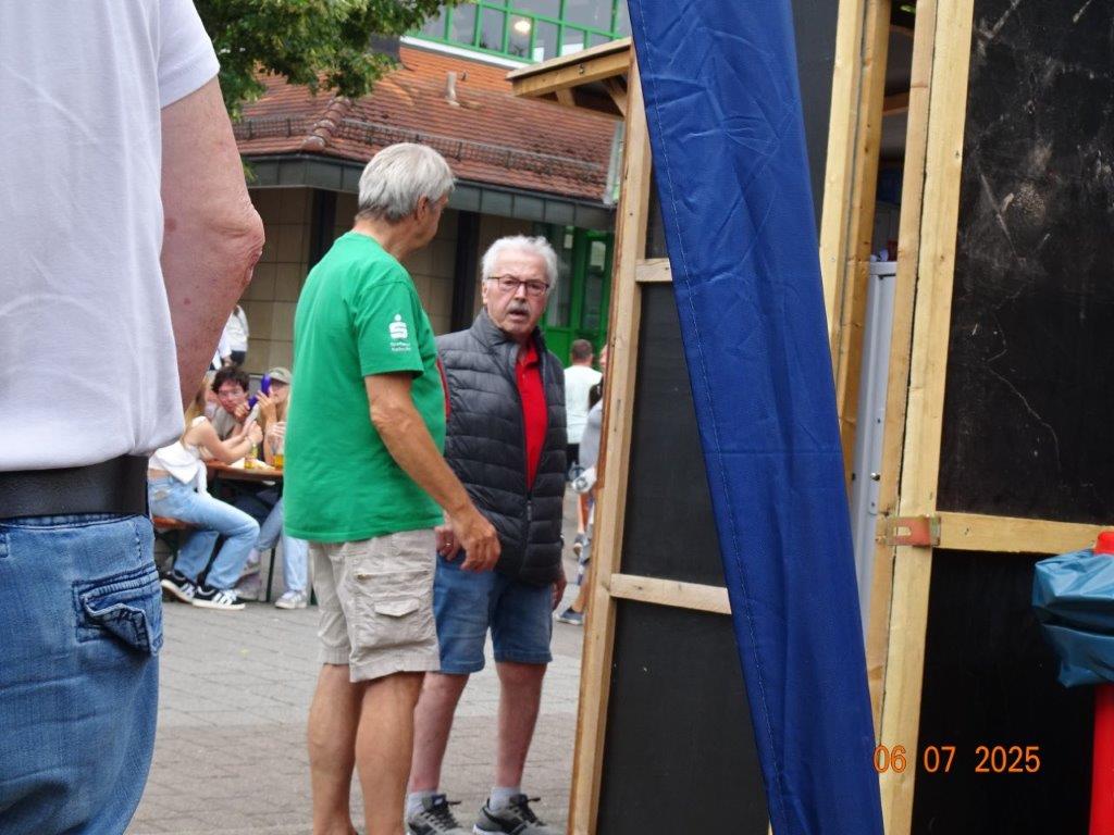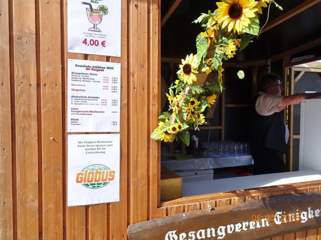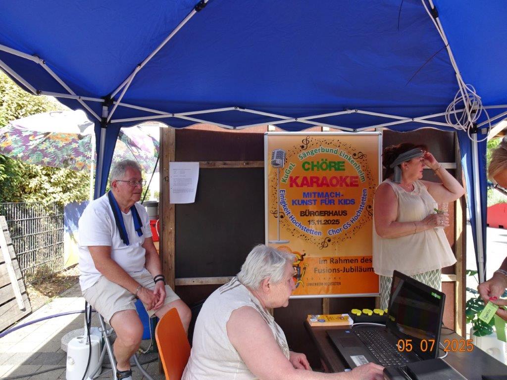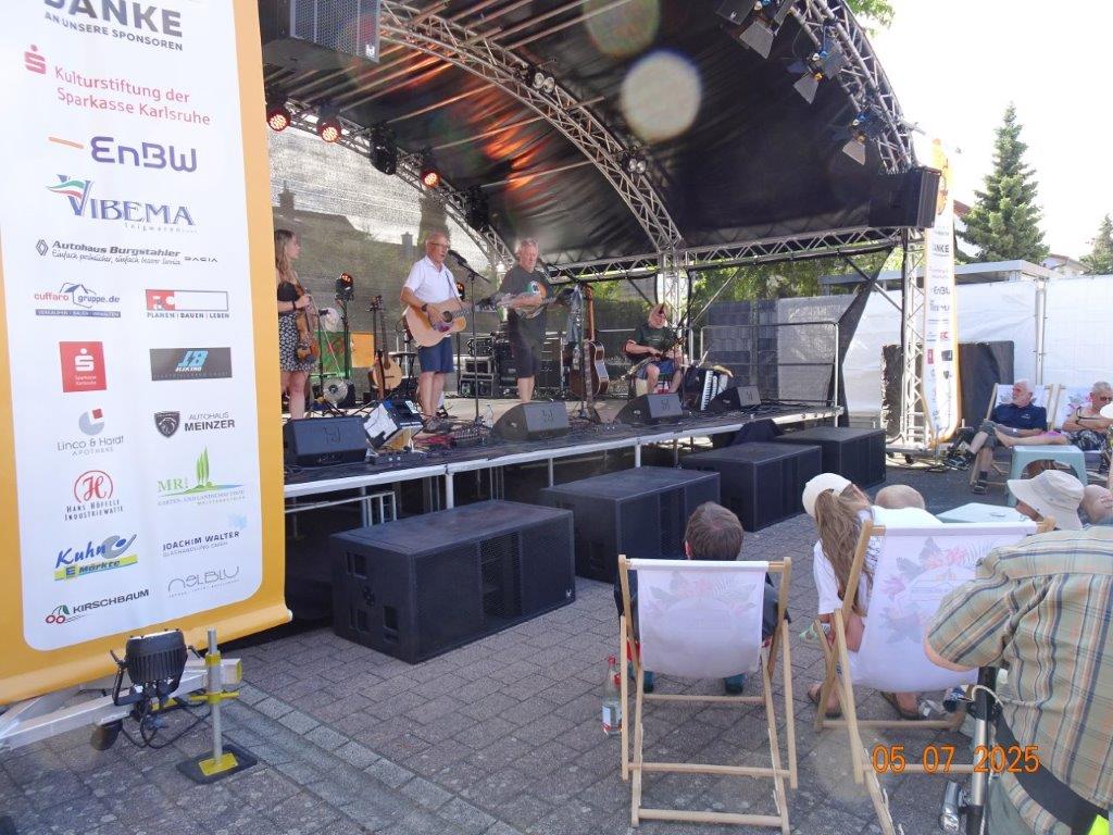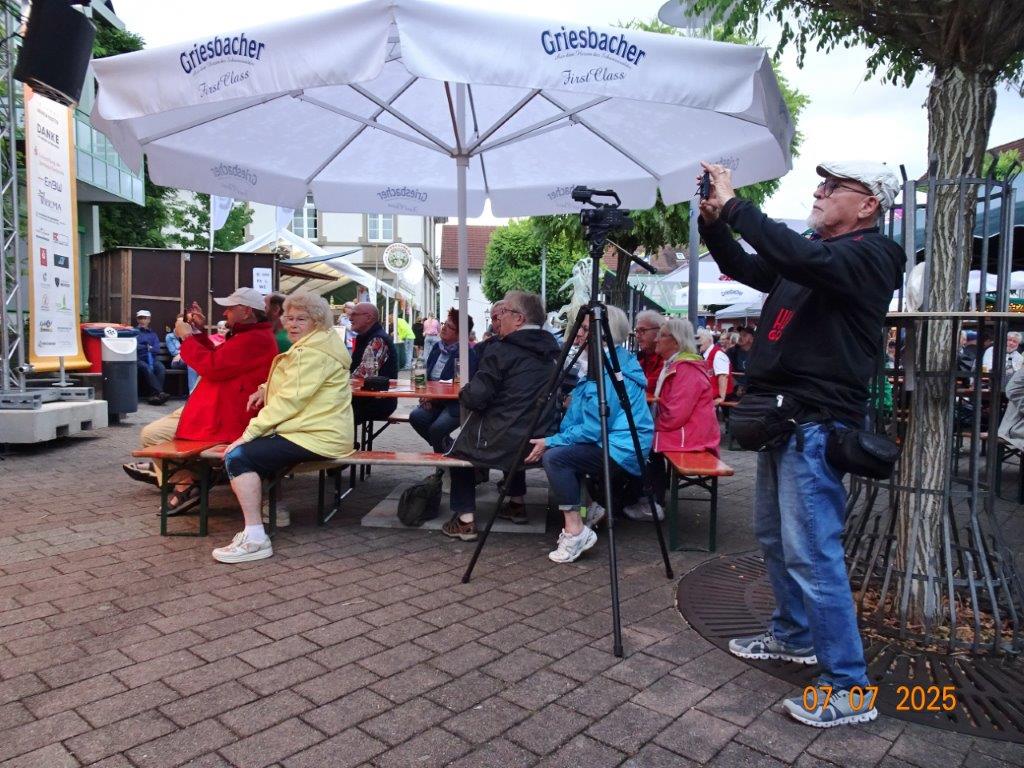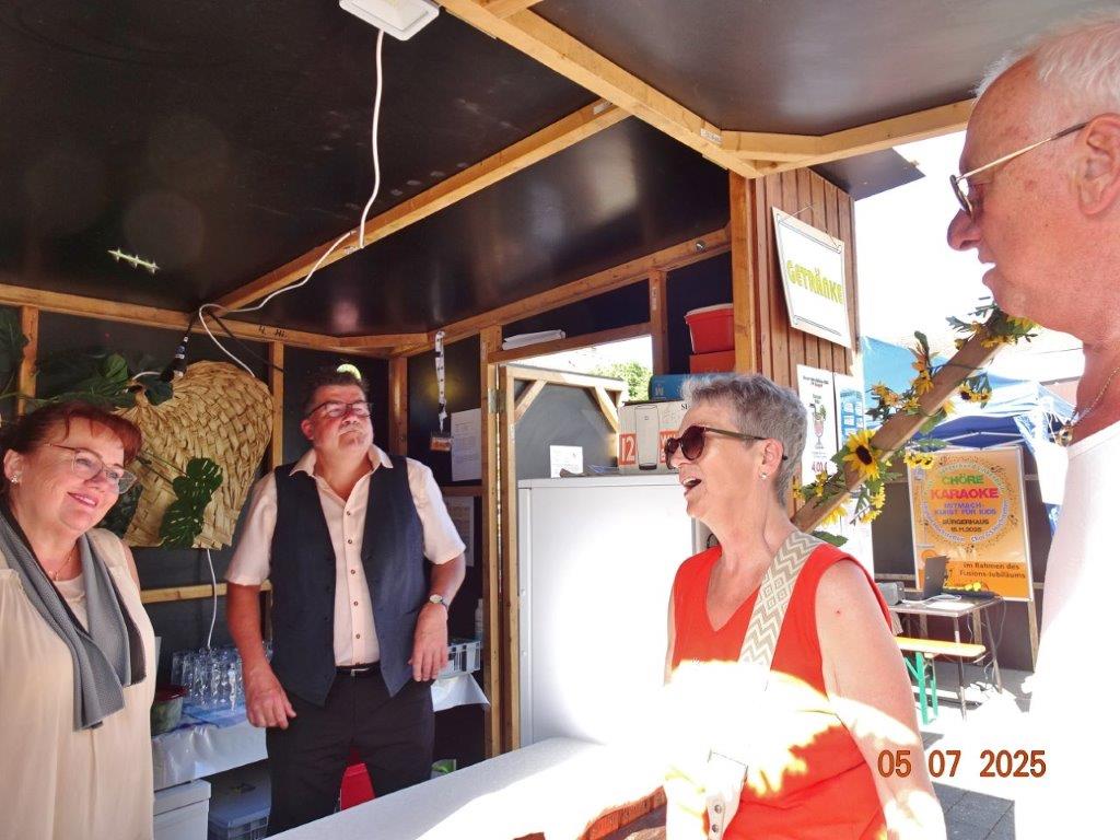 Unser Gemeindefusionsfest begann mit nahezu tropischen Temperaturen. Freitags, wenige Stunden vor Festbeginn, wurden noch fleißig unsere Hütten bestückt, nachdem Tage zuvor die Maultaschen-Produktion auf Hochtouren lief. Hier ein Danke an unsere Macher und Organisatoren Uschi und Rolf und ihre Mitstreiter. Gleichzeitig auch ein ganz herzliches Dankeschön an unseren Sponsor GLOBUS-Wiesental für die Spende. Natürlich auch danke an all unsere aktiven und passiven Mitglieder, die über die Festtage einen großartigen Dienst leisteten und unserem 1. Vorsitzenden Klaus Reinhardt, der immer rundum für Nachschub sorgte, mithilfe unseres 2. Vorsitzenden Markus Ksienzyk. Nur mit solcher Unterstützung kann das Ganze funktionieren! Um 18.00 Uhr erfolgte mit dem traditionellen Fassanstich durch unseren BGM Michael Möslang und der Begrüßung der Delegationen der Partnerschaftskommunen die feierliche Eröffnung des Festes. Und da war viel geboten, mit 3 Bühnen und vielen tollen Bands und anderen Unterhaltungsangeboten, von den Vereinen, Schulen und Ständen, die kulinarisch verwöhnten, Schaustellern und auch die Security und andere Dienste, die hier Bereitschaft hatten, nicht zu vergessen! Kurz, es war rundum für alles bestens gesorgt, um auf dem Festgelände schöne Stunden zu verbringen. Sonntags waren kühlere Temperaturen angesagt, eine richtige Wohltat nach den zwei ersten heißen Festtagen. Die von uns eingeladenen Chöre Da Capo aus Graben und der JCK vom KIT Karlsruhe waren pünktlich vor Ort, um bei unserem Bruderverein Sängerbund Linkenheim, der befreundete Chöre geladen hatte, aufzutreten. Beide Chöre sangen unter neuer Leitung und begeisterten mit modernem Liedgut das Publikum, wobei der JCK größenmäßig und stimmgewaltig beeindruckte und Lust auf sein Sommerkonzert machte. Die Stimmung vor Ort war gut und auch die Nachricht, dass gegen 18.00 Uhr unsere Maultaschen ausverkauft waren, ließ Freude aufkommen. Schade für die, die keine mehr bekamen, aber für uns das Zeichen, dass sie geschmeckt haben, wie wir auch immer wieder bestätigt bekamen. Fazit: Die Maultaschen könnten in unser Festprogramm aufgenommen werden – schaun wir mal. Der Sängermax und unsere Weinschorle waren auch der Renner, so hat sich die ganze Arbeit und Mühe gelohnt und den Verein zusammen geschweißt.